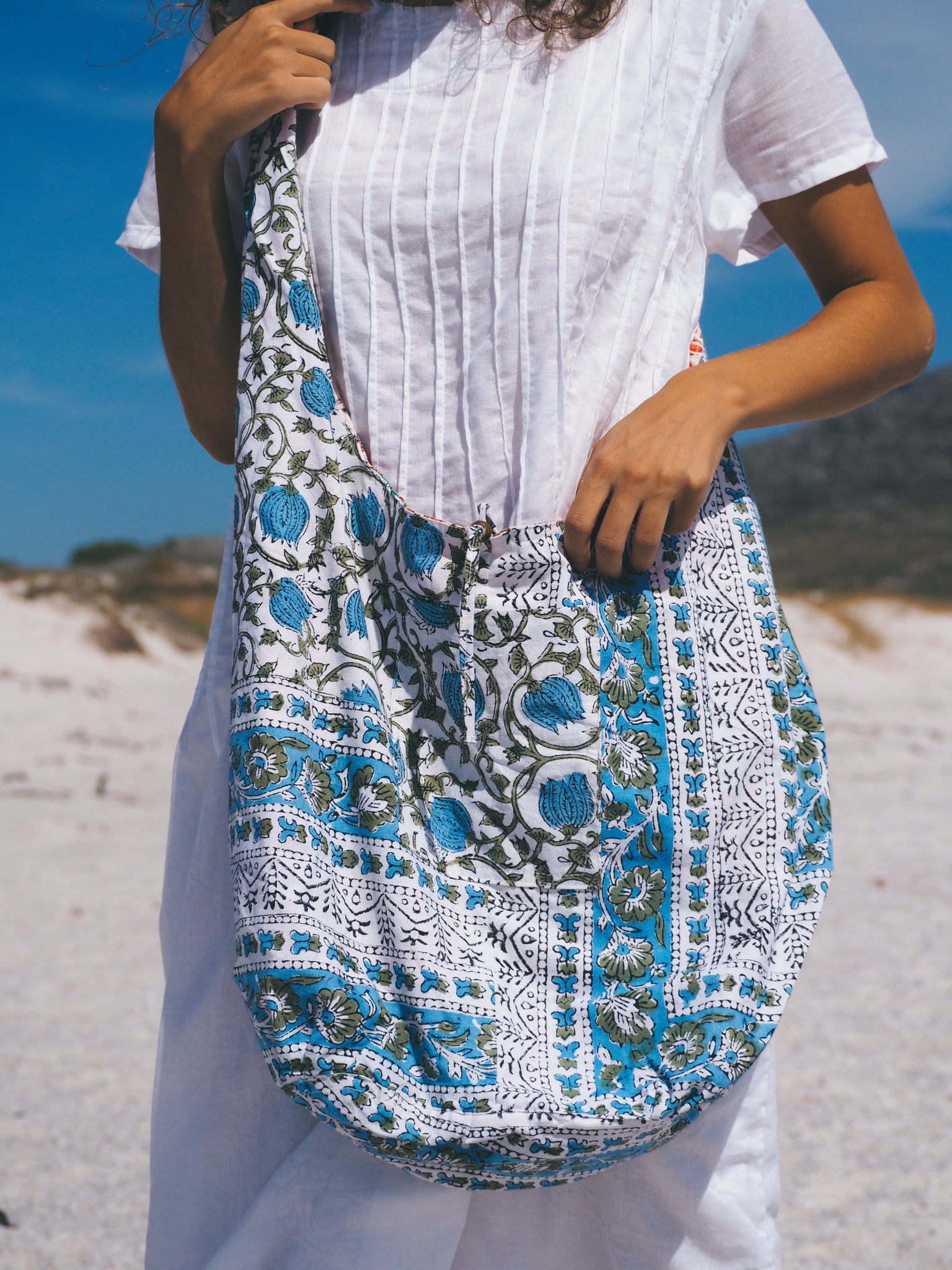 The bag for everything and anything, 100% cotton and hand printed via blockprint. Featuring a comfy long strap, a roomy body with a functional pocket. It closes with a loop and wooden bead. AND, the best part? Double sided, you get two bags in one, two totally different prints, double the fun!