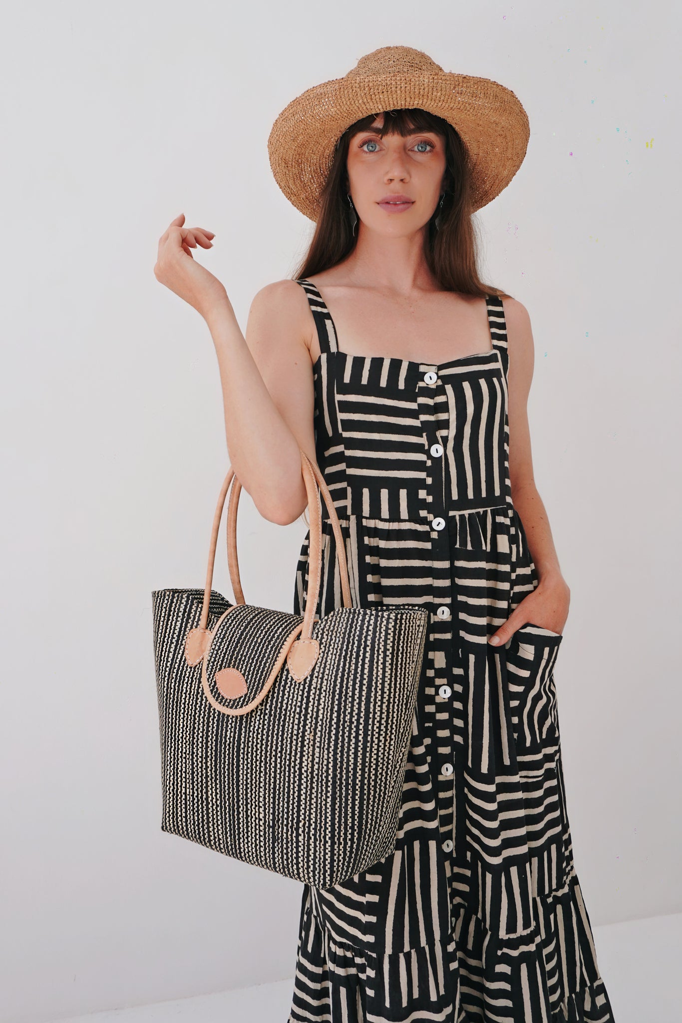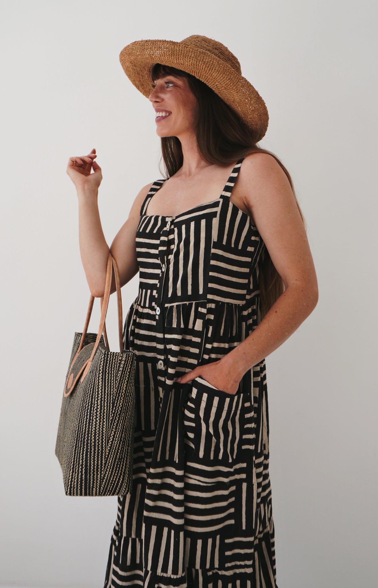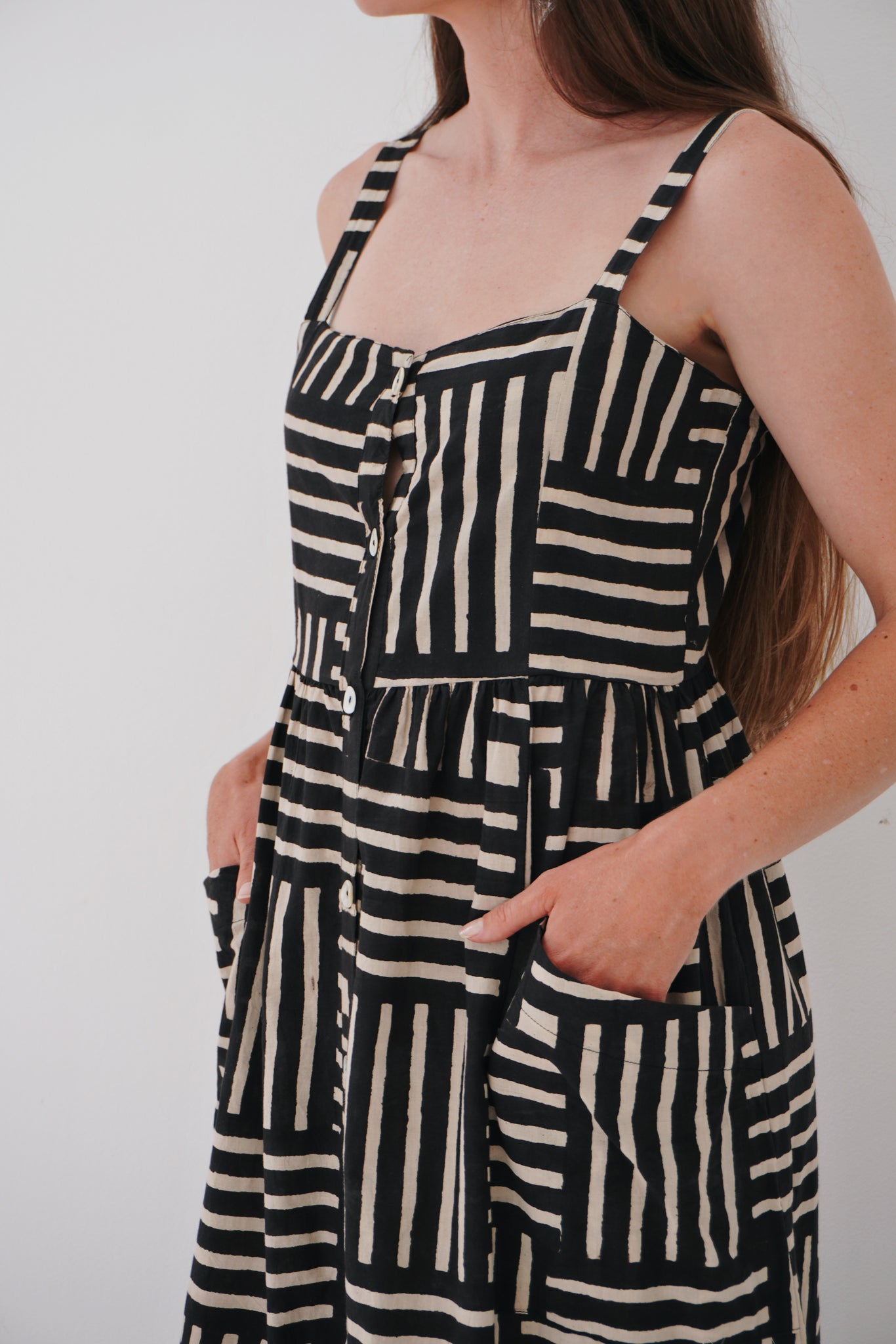 The perfect sundress! 100% cotton and printed by hand with natural dye.. it feels as good as it looks! Featuring a square neckline with thin straps (which are adjustable, yay!)- the bust is fitted, and falls into fine pleats and a wide skirt- complete with two tiers. She has a lot of movement! Buttons all the way down the front and statement pockets add sweetness, while the print brings all the glamour.
