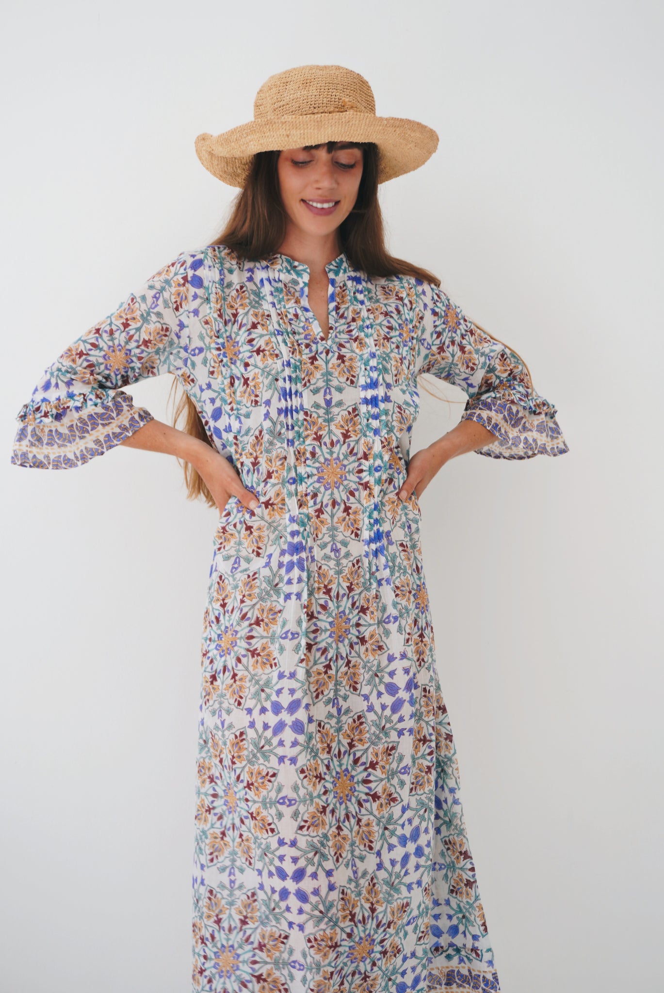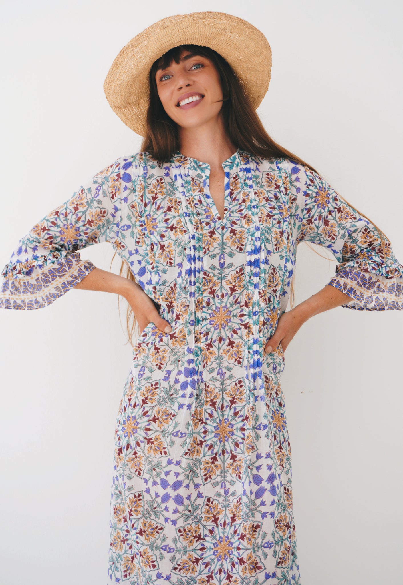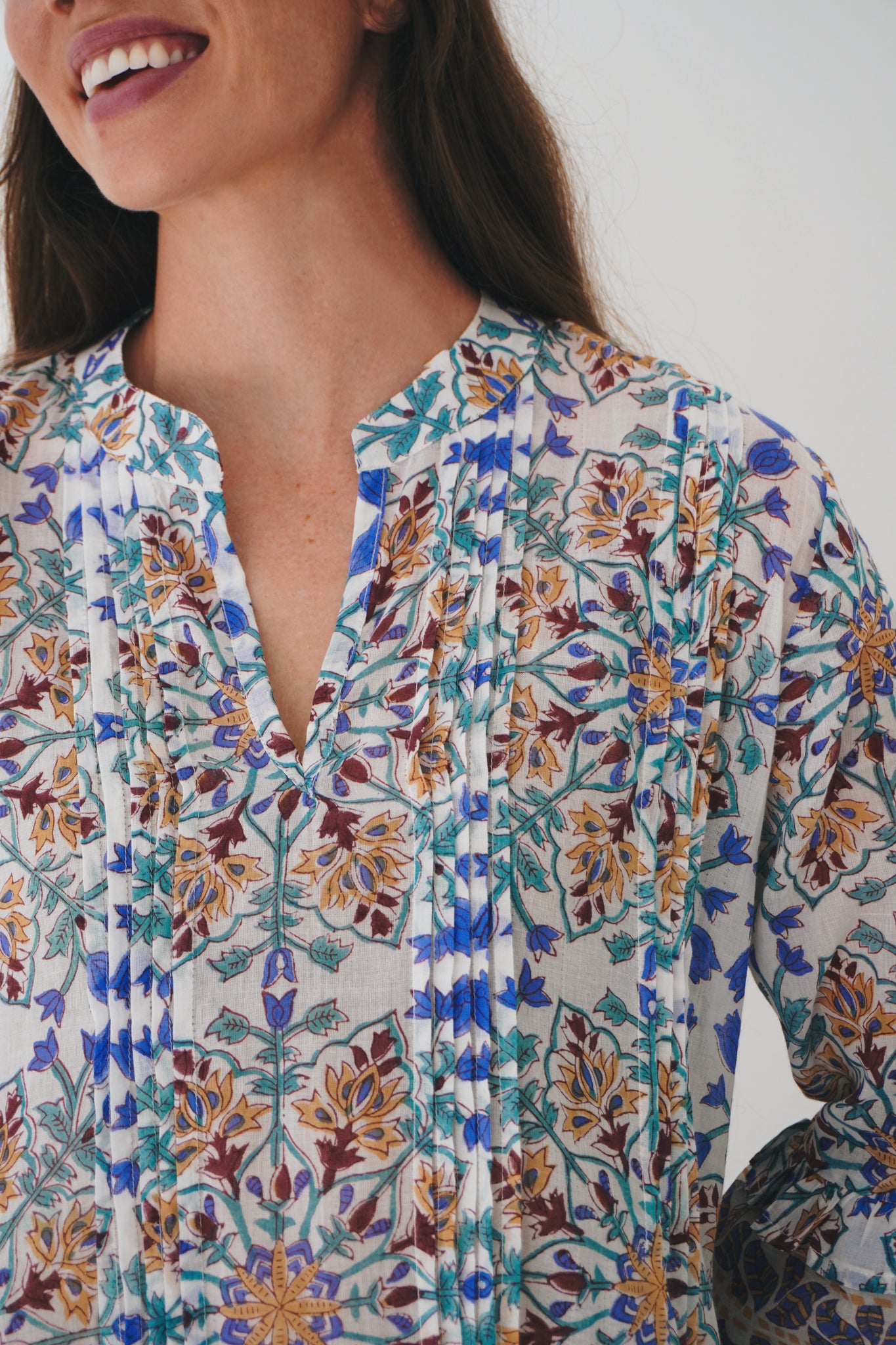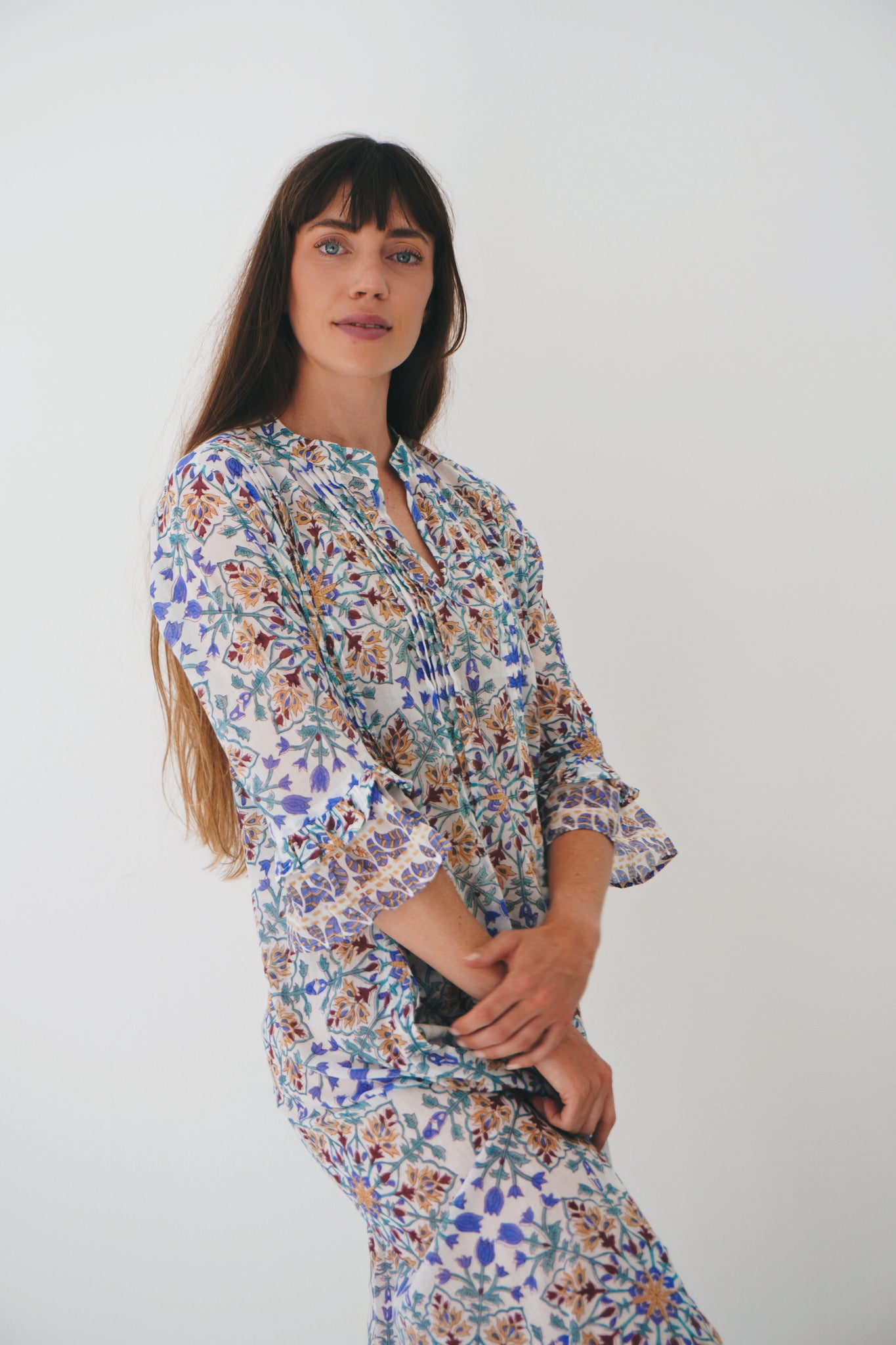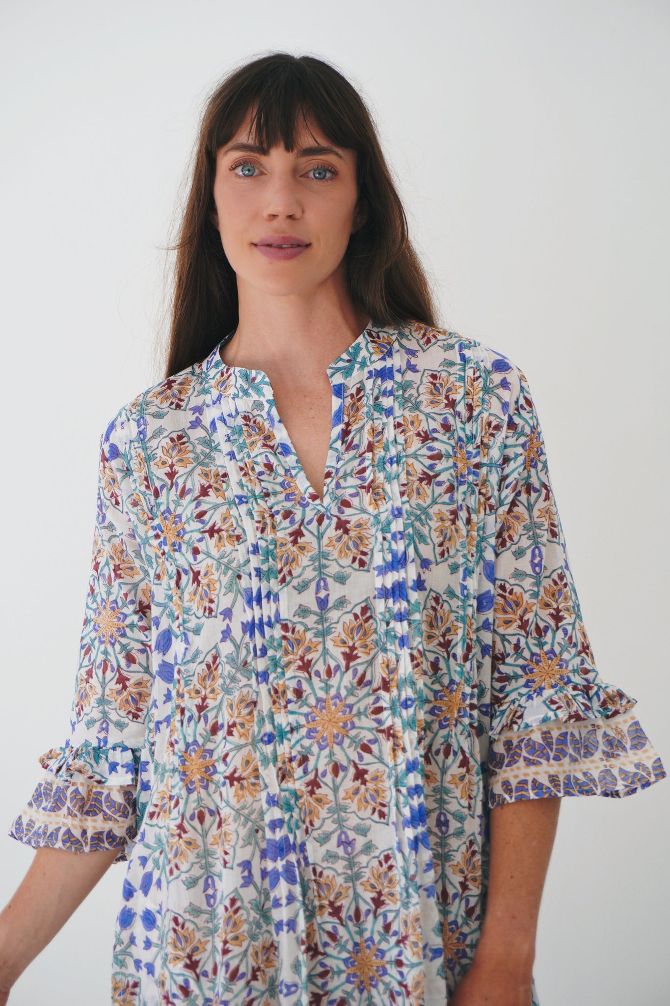 Oh the loveliness of this! A hint at a collar gives the neckline structure, while the bust is fitted and falls into a straight body. Delicate rouging across the bust adds texture to this piece, and then falls into subtle pleats at the waist which gives movement to the skirt. Short slits on the sides makes it easy to move in! The sleeves though! A 3/4 length, and with flair, double cuffed and delicate frills add some drama to this silhouette . While this piece is 100% cotton, it is an especially light cotton, perfect for summer days! Hand printed.