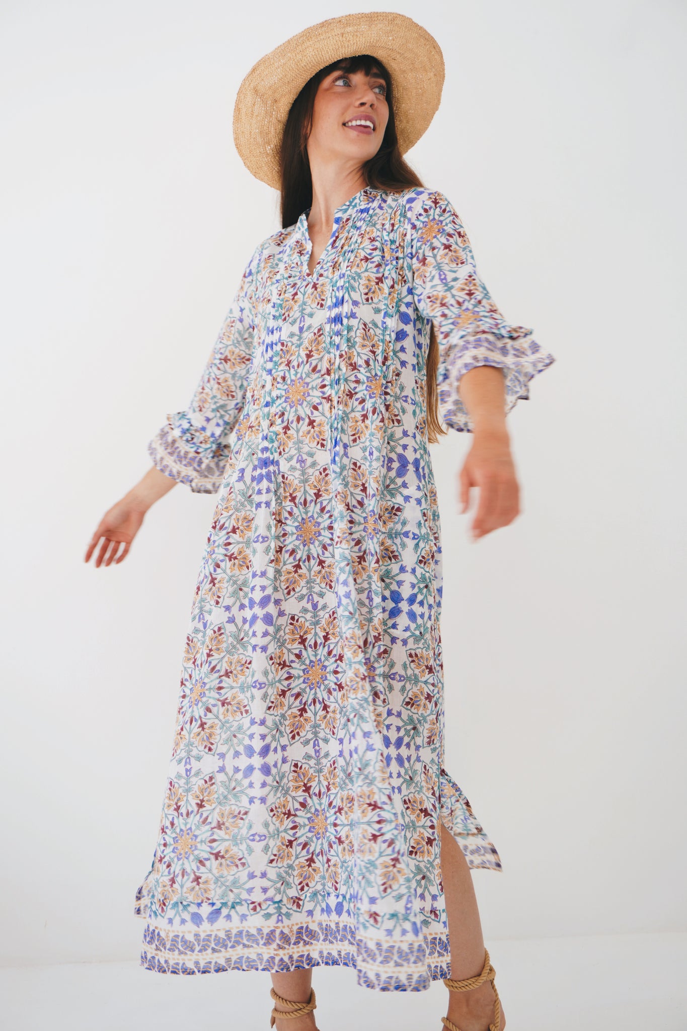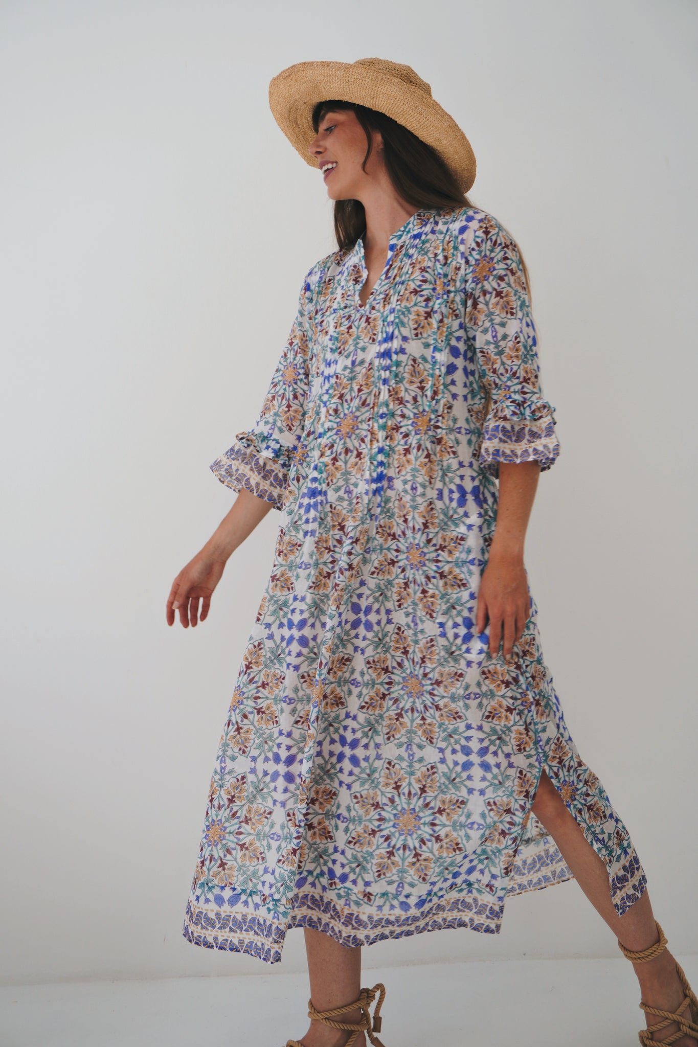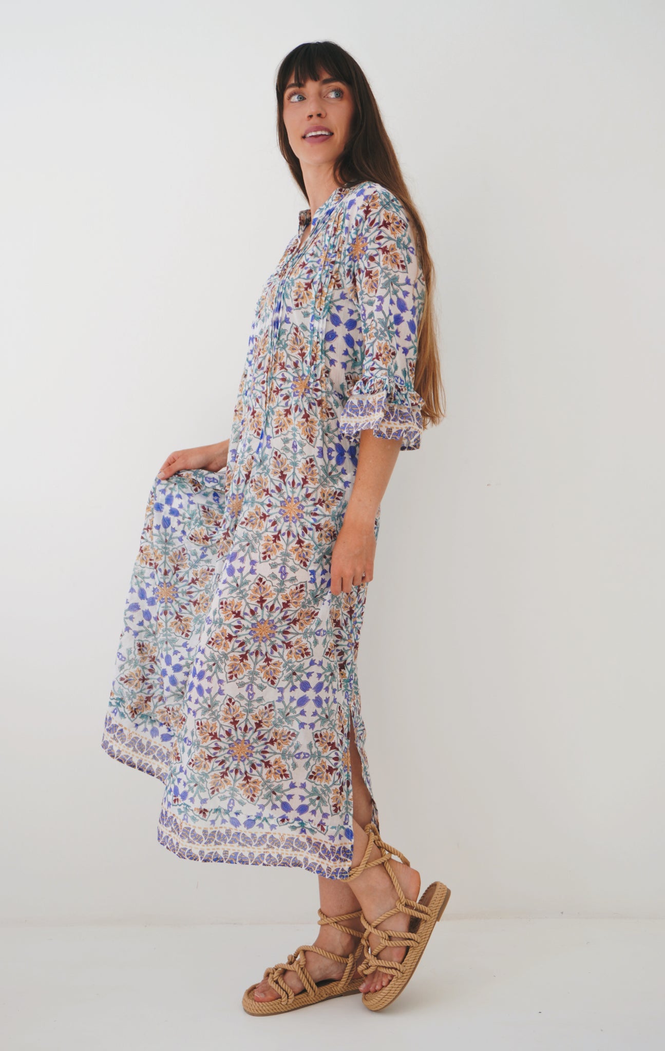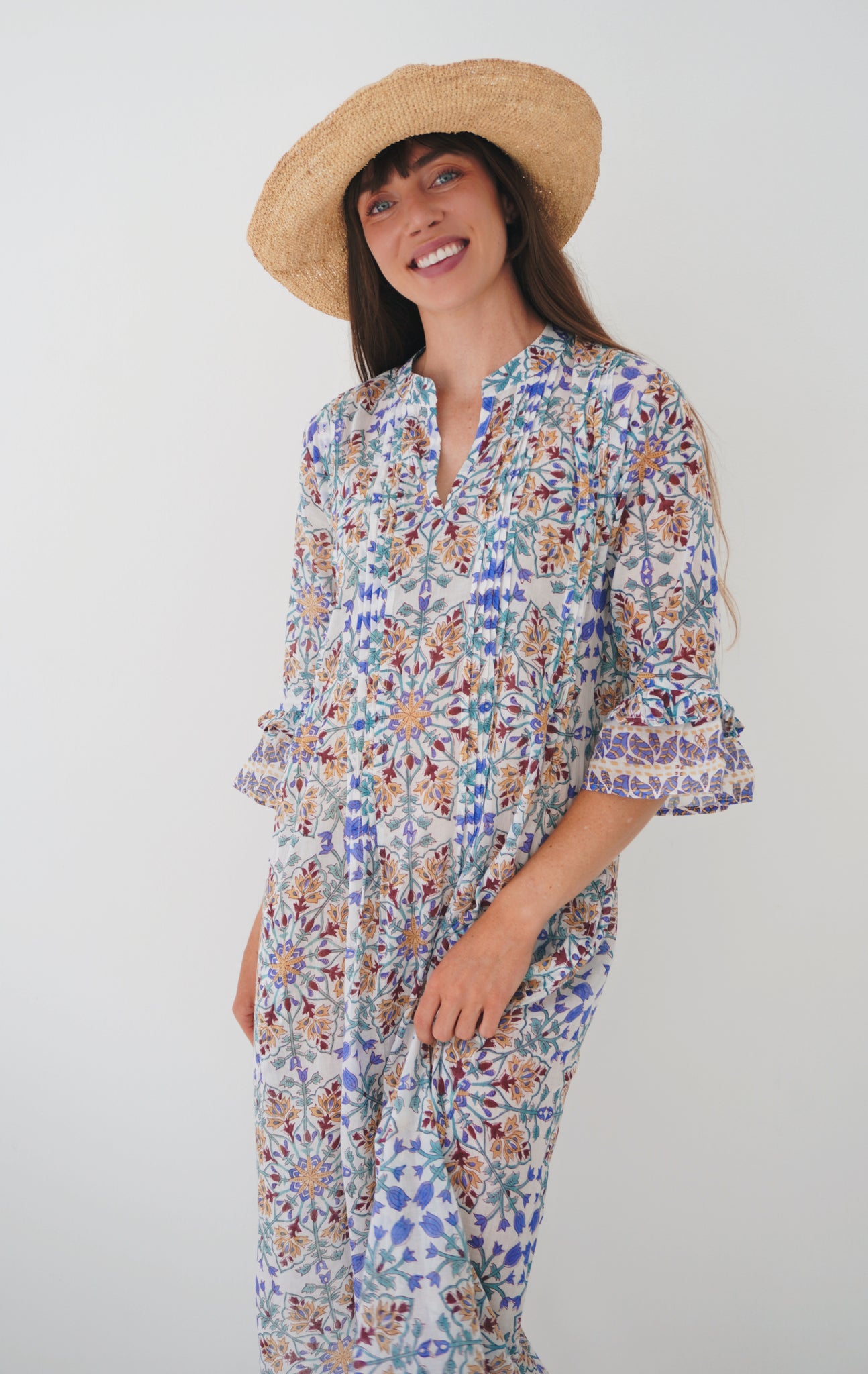 Oh the loveliness of this! A hint at a collar gives the neckline structure, while the bust is fitted and falls into a straight body. Delicate rouging across the bust adds texture to this piece, and then falls into subtle pleats at the waist which gives movement to the skirt. Short slits on the sides makes it easy to move in! The sleeves though! A 3/4 length, and with flair, double cuffed and delicate frills add some drama to this silhouette . While this piece is 100% cotton, it is an especially light cotton, perfect for summer days! Hand printed.