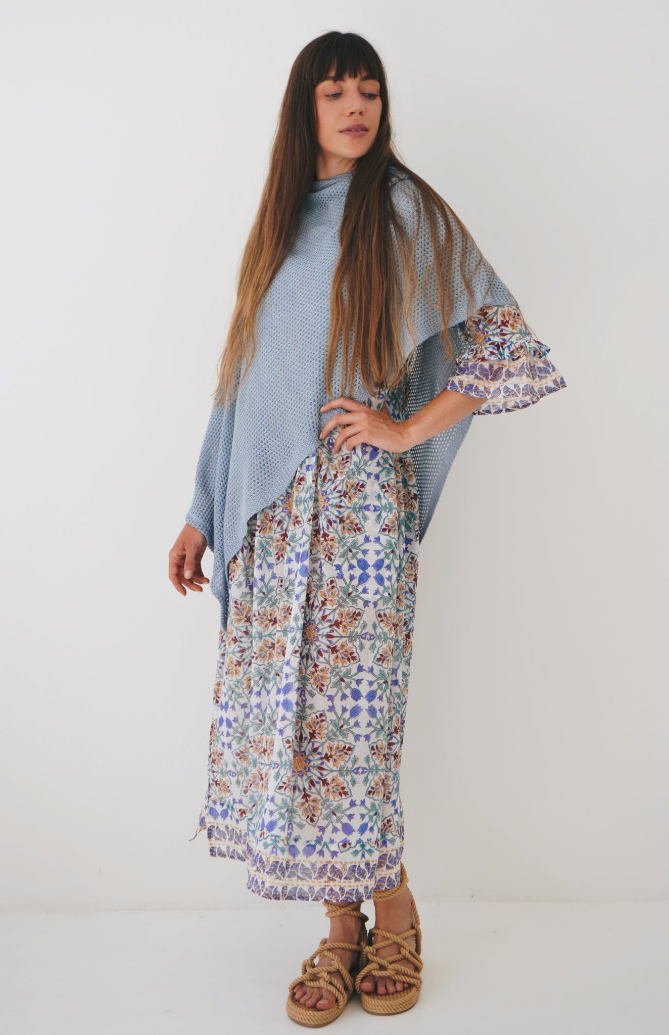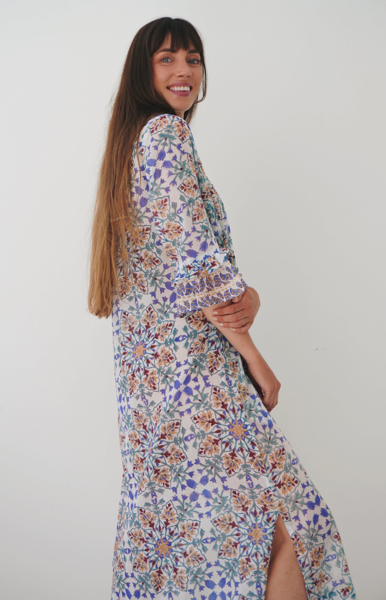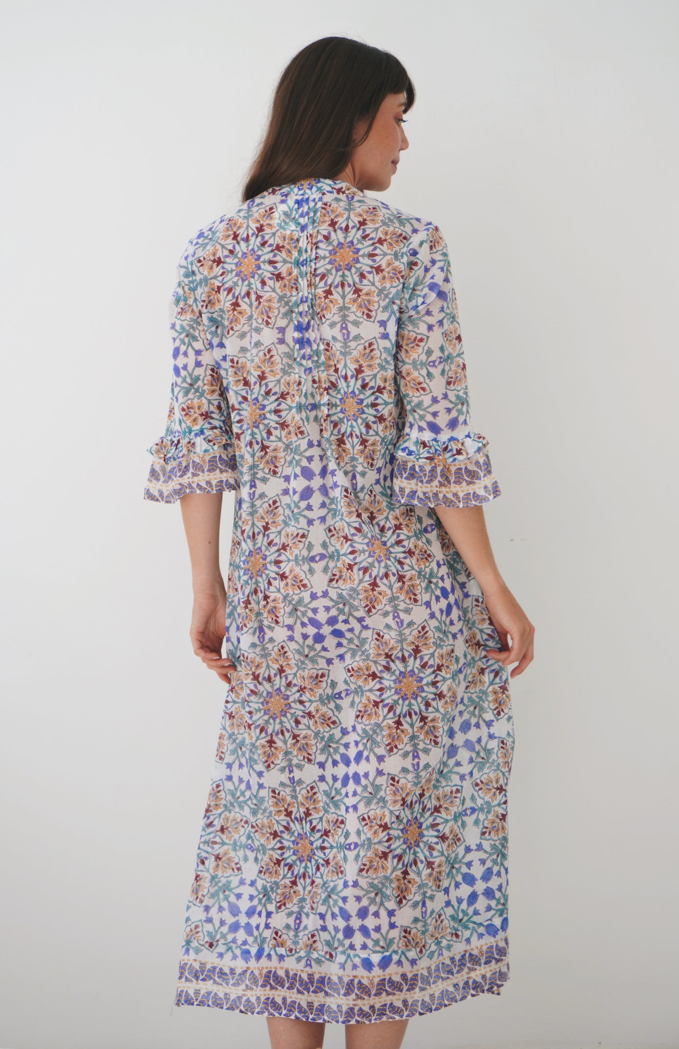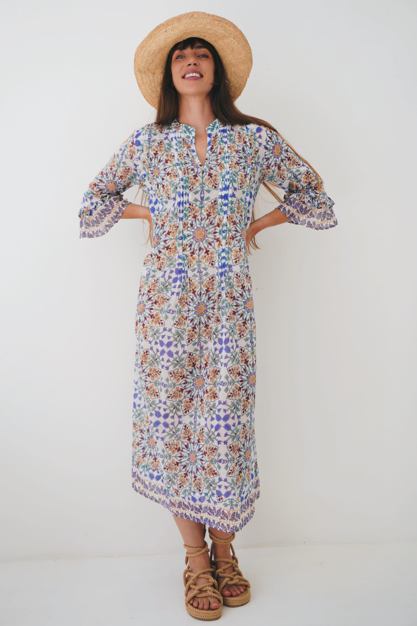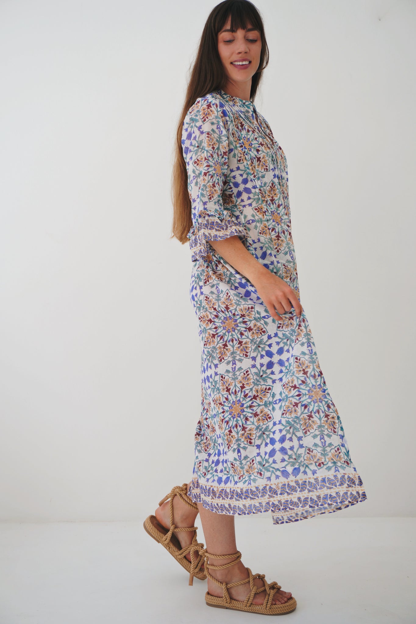 Oh the loveliness of this! A hint at a collar gives the neckline structure, while the bust is fitted and falls into a straight body. Delicate rouging across the bust adds texture to this piece, and then falls into subtle pleats at the waist which gives movement to the skirt. Short slits on the sides makes it easy to move in! The sleeves though! A 3/4 length, and with flair, double cuffed and delicate frills add some drama to this silhouette . While this piece is 100% cotton, it is an especially light cotton, perfect for summer days! Hand printed.