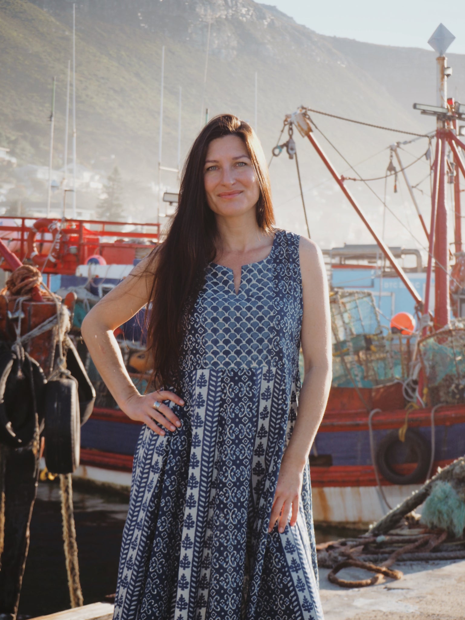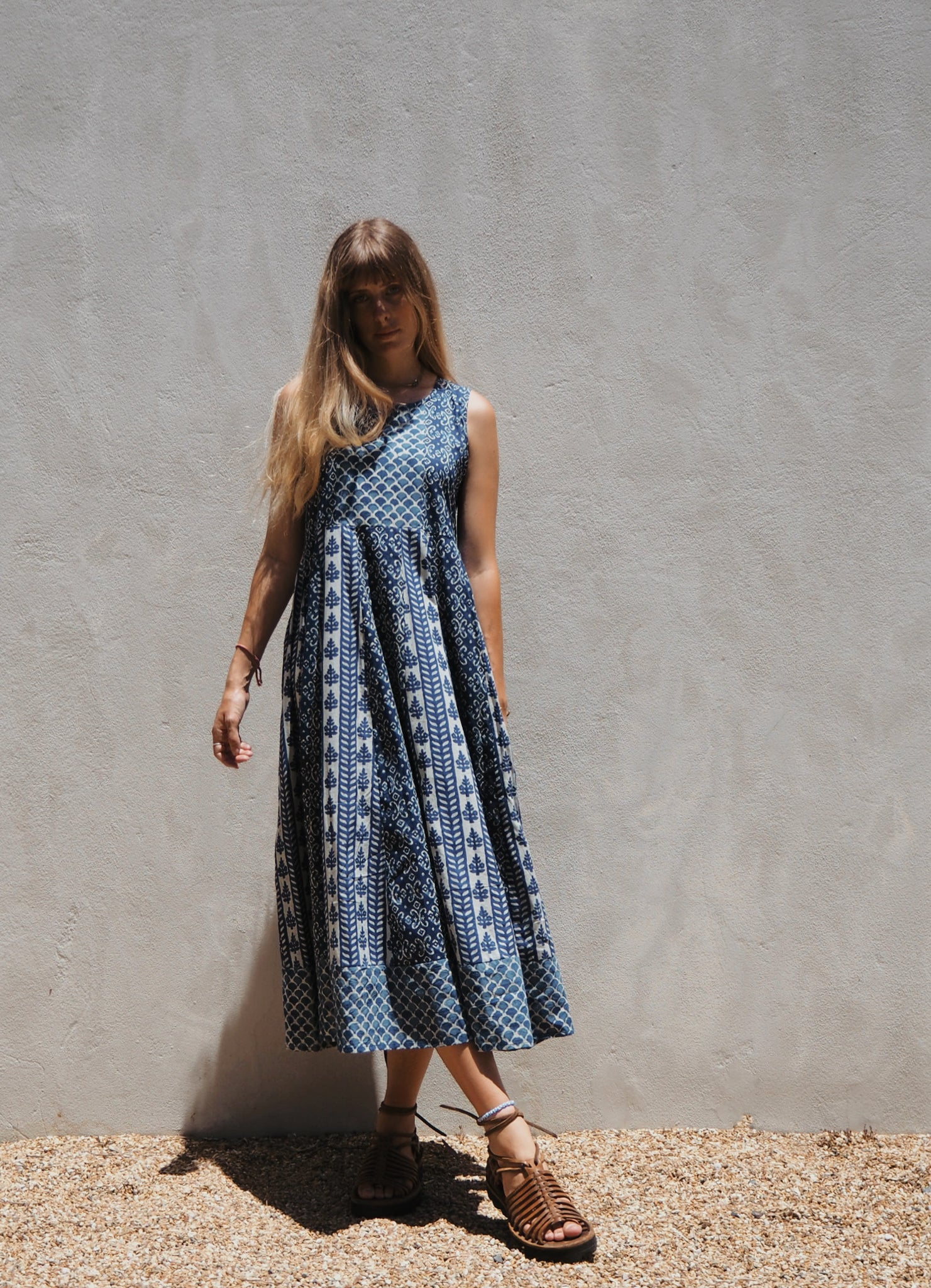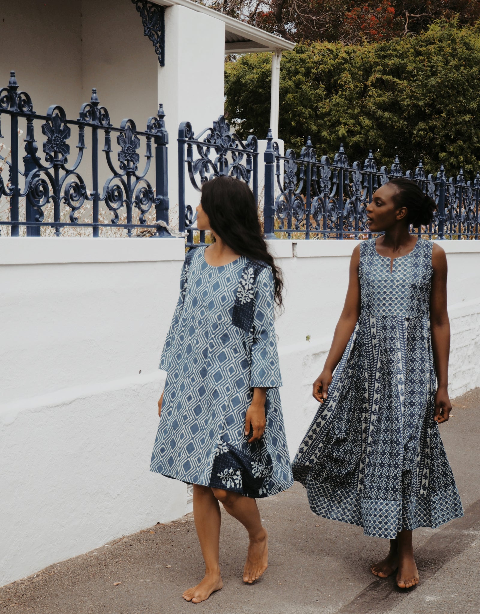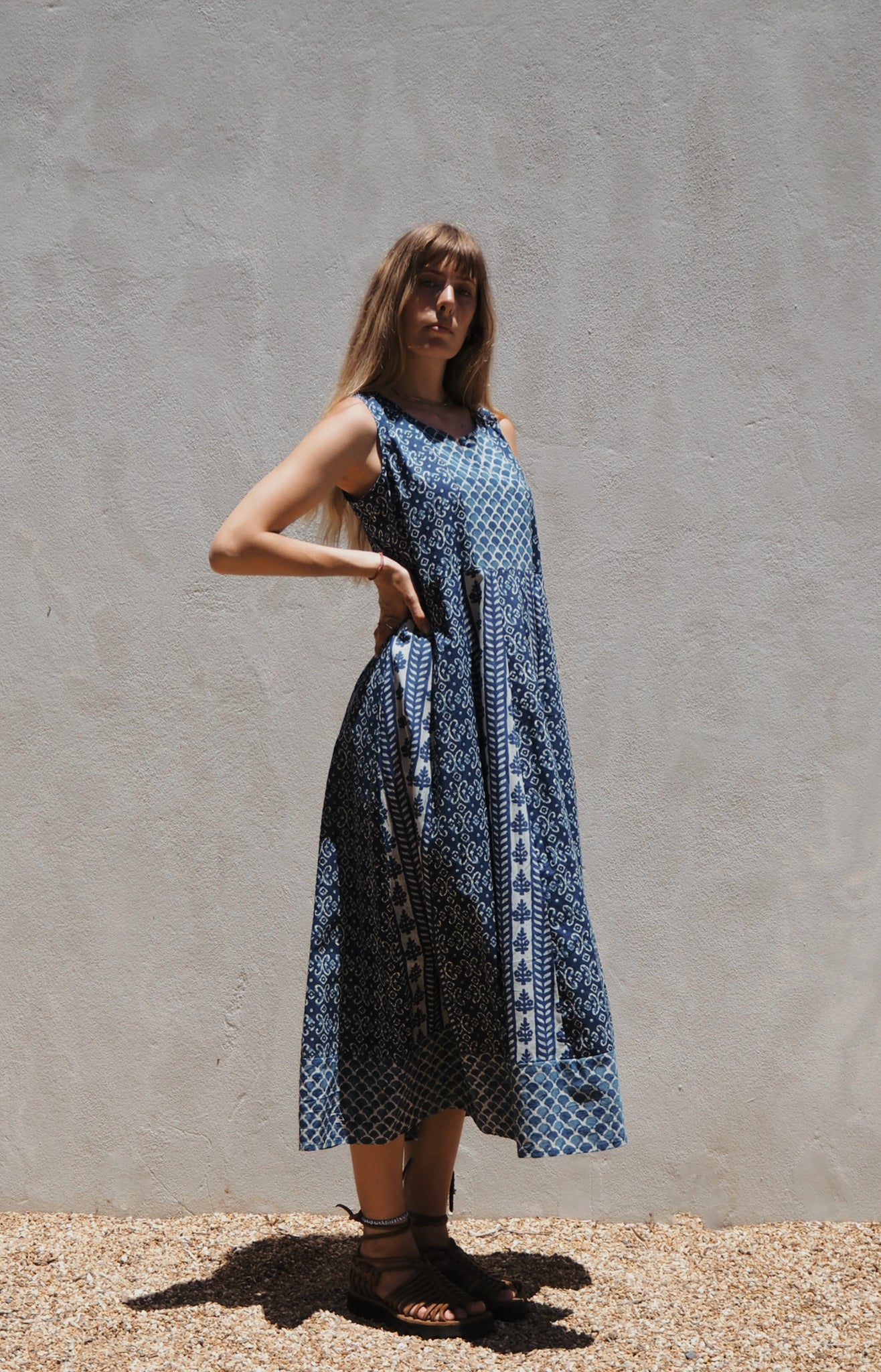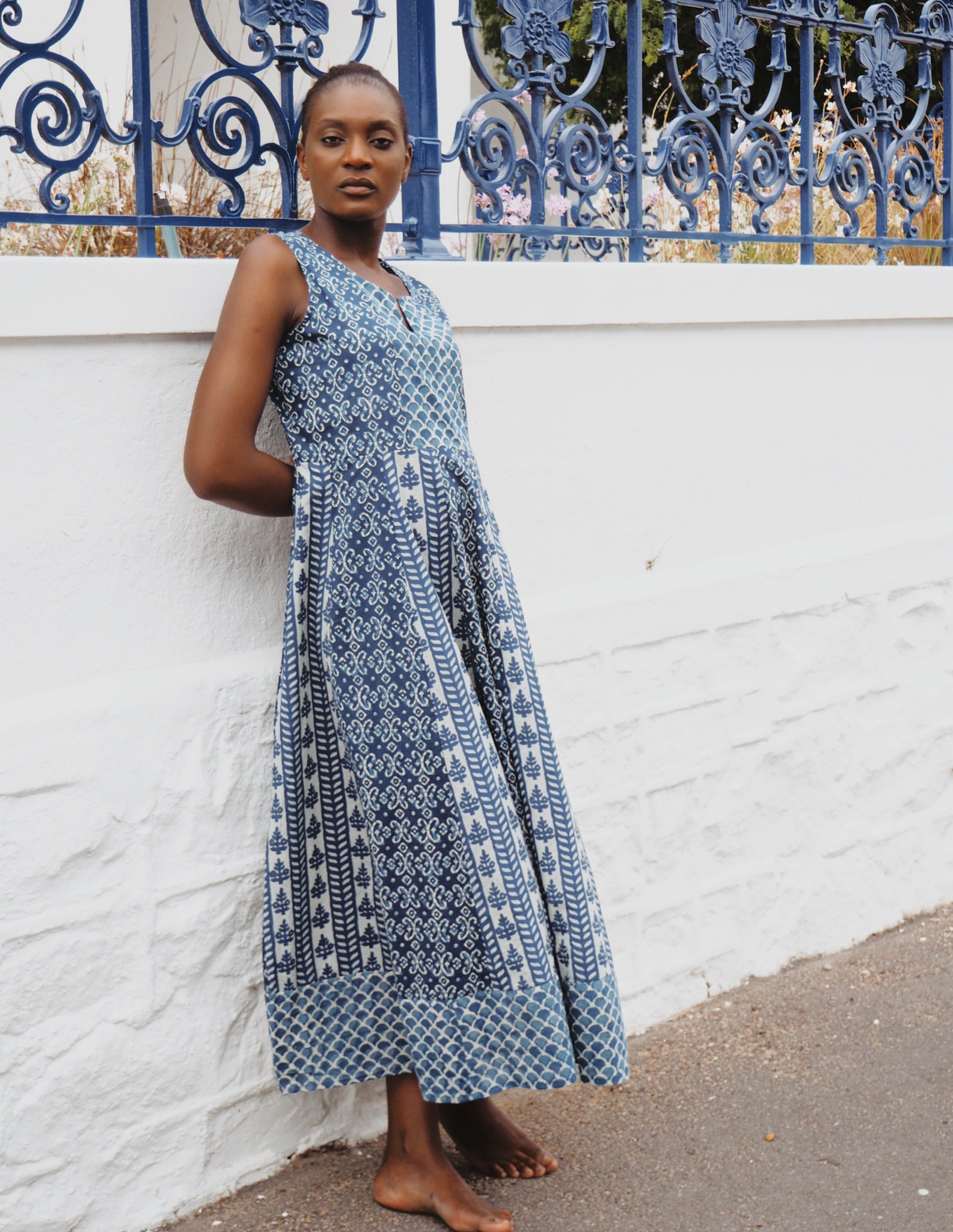 100% cotton in hand printed indigo loveliness. A rounded neckline complimented by a fitted bust which flares out into a full skirt. The dress is made up of several different indigo prints, which give this simple elegant piece a boho feel. The back has a gorgeous tie detail. An easy, relaxed look, we love!