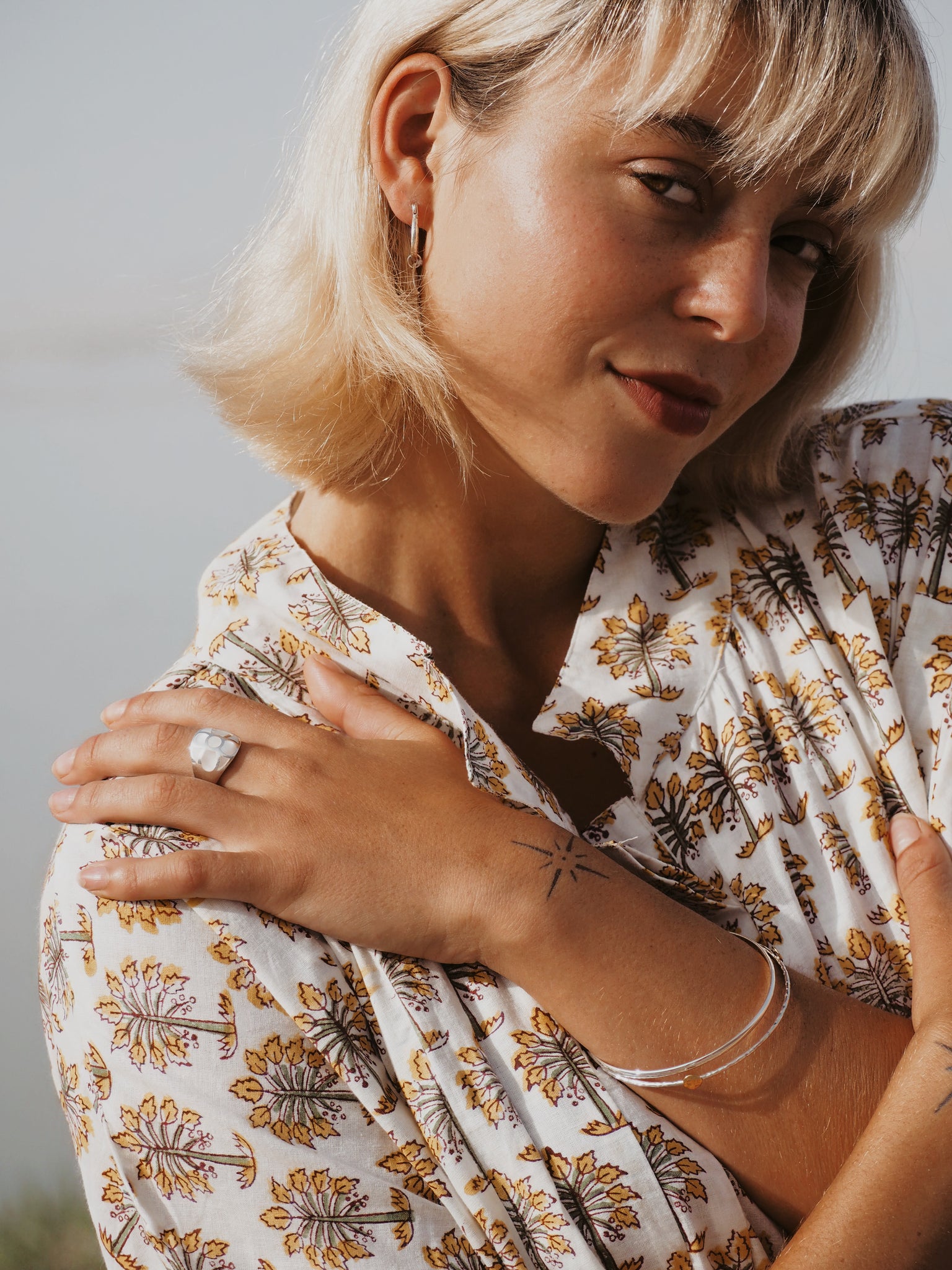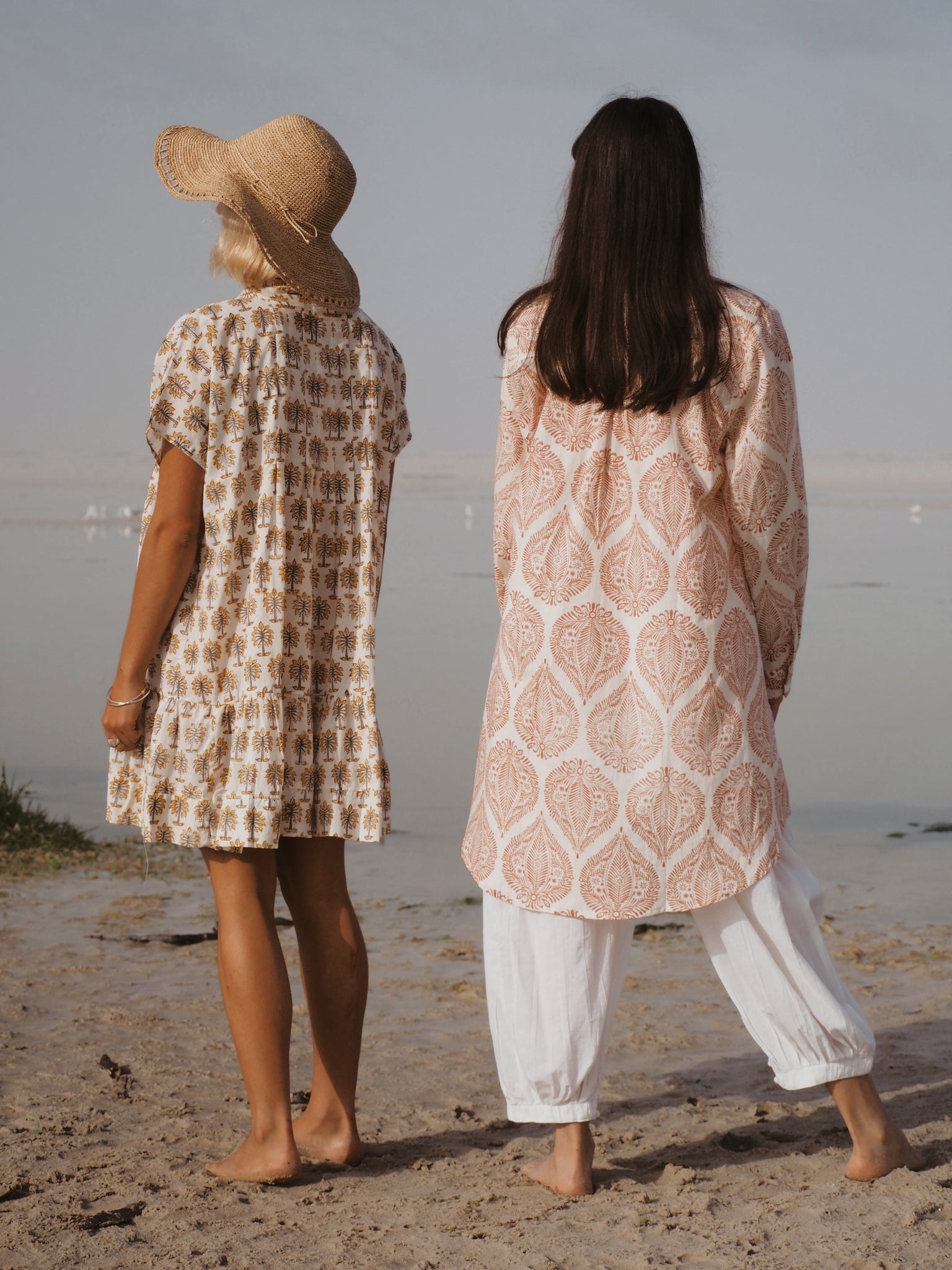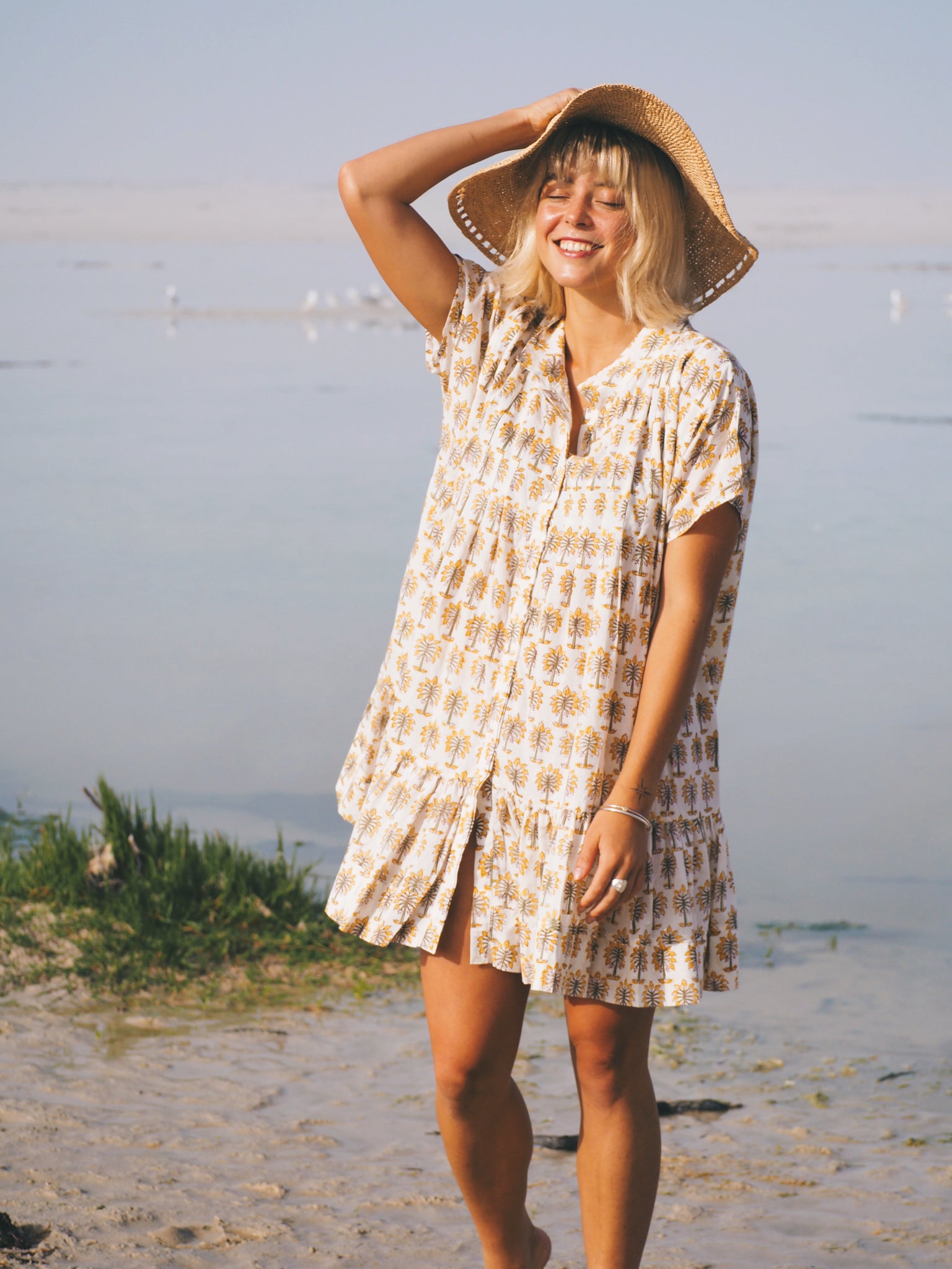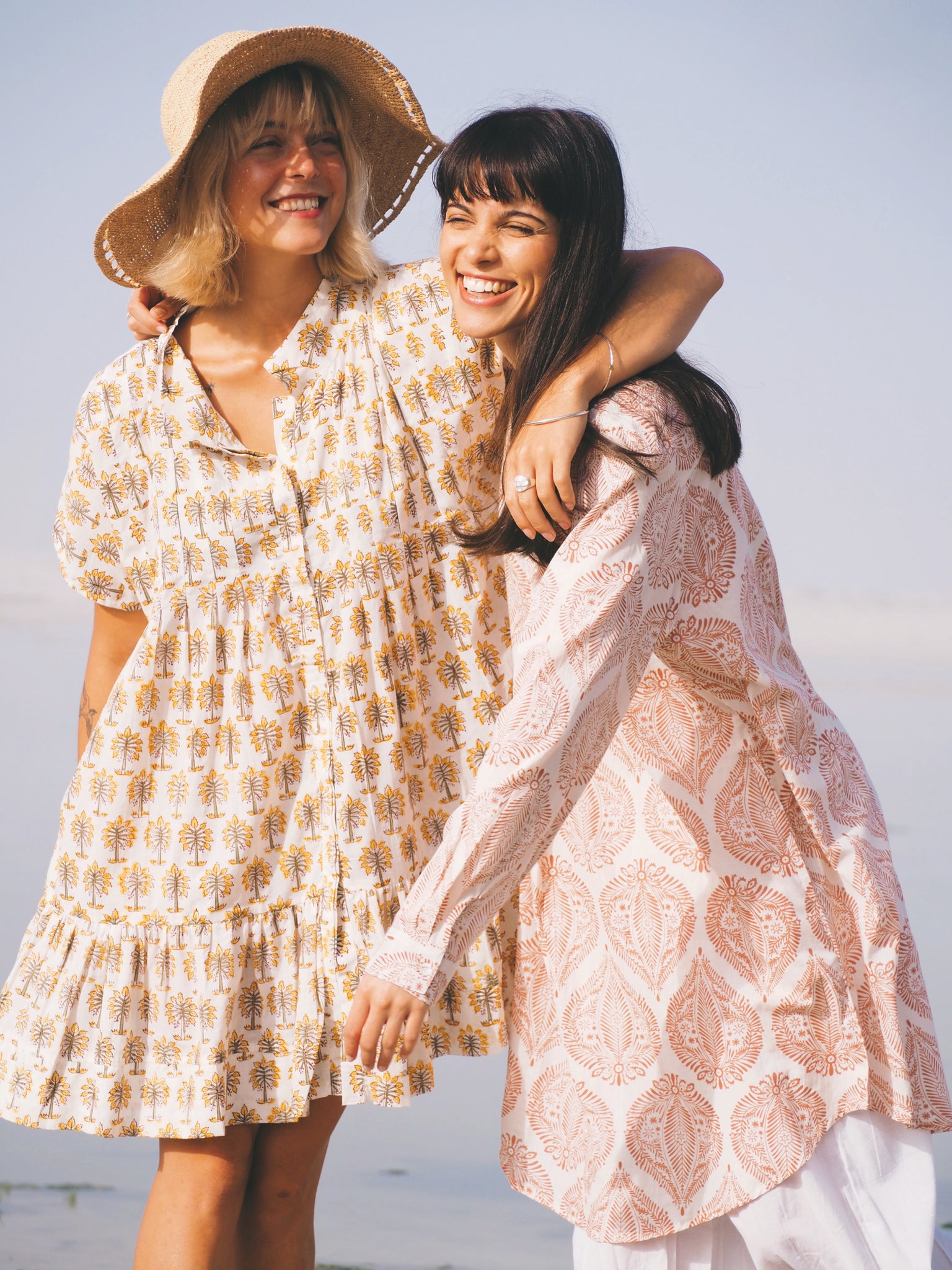 A cute little number, with styling versatility galore! 100% cotton and hand printed in a sunny print. The neckline is oh so lovely, a hint of a chinese solar gives structure to this otherwise flowy piece. With capped sleeves, a slightly more fitted breast (subtle pleating, oh yes!), and then an almost babydoll silhouette accentuated by more pleats and our favourite: a low hem. This is brought together by buttons all the way down the front! Style as is (if you're on the shorter side), or over pants, tights, a mini skirt?