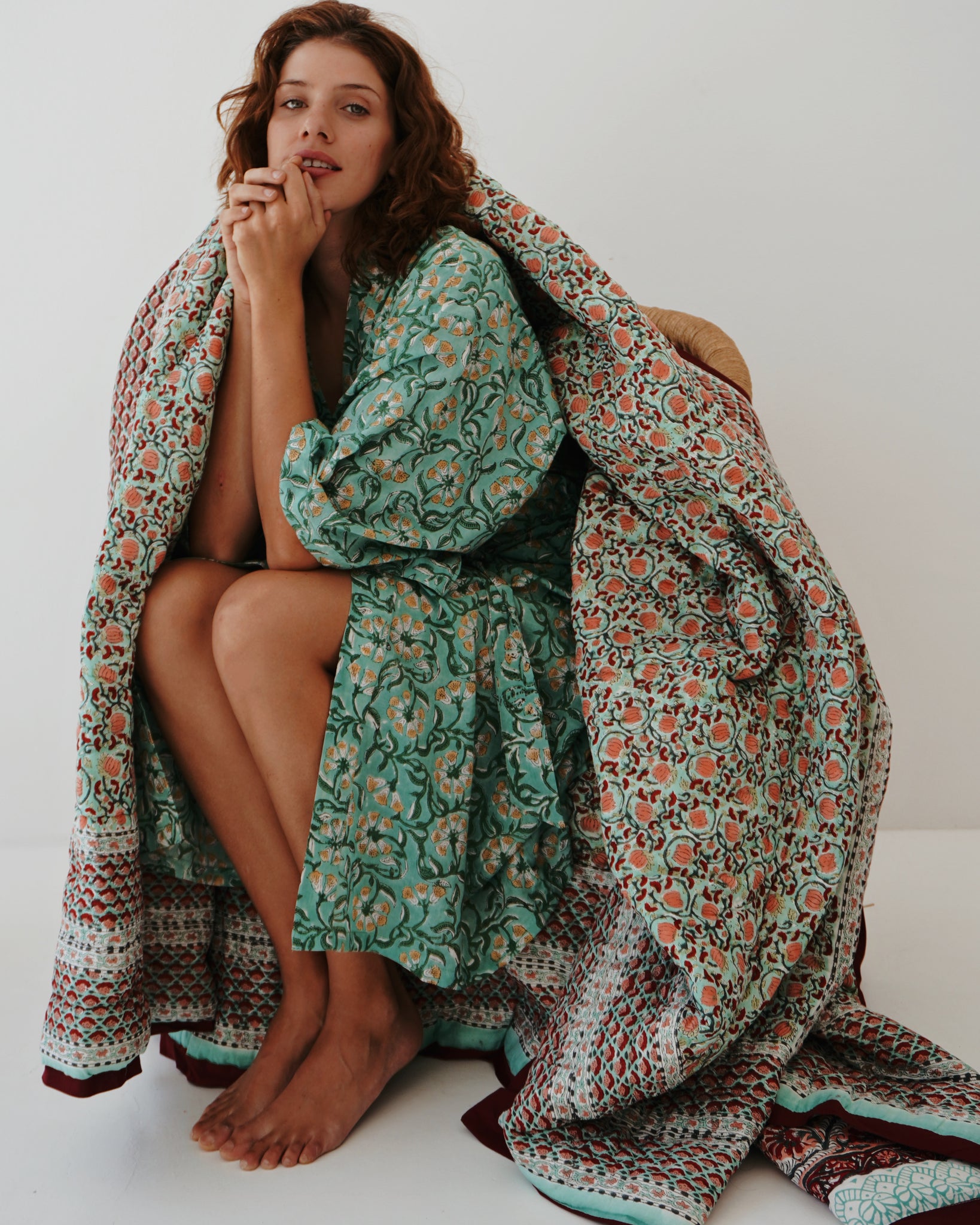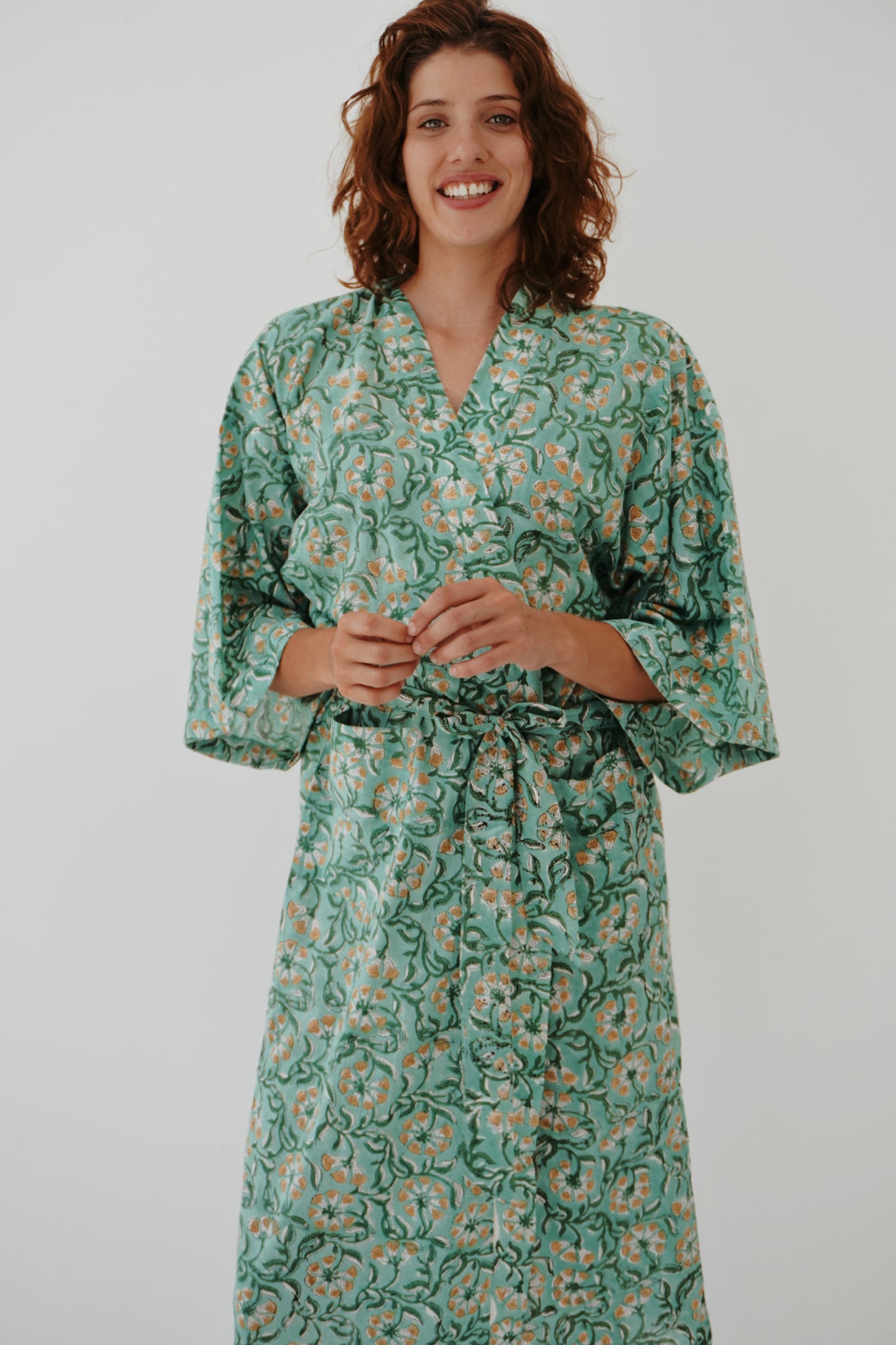 100% cotton, and hand printed via the block print method. A loose fit with a slightly longer length. Big pockets and tie closure, to be styled loose or fitted as you please! The standout detail of this piece is the print! The perfect loungewear, but gorgeous enough to wear out the house as a kimono style.