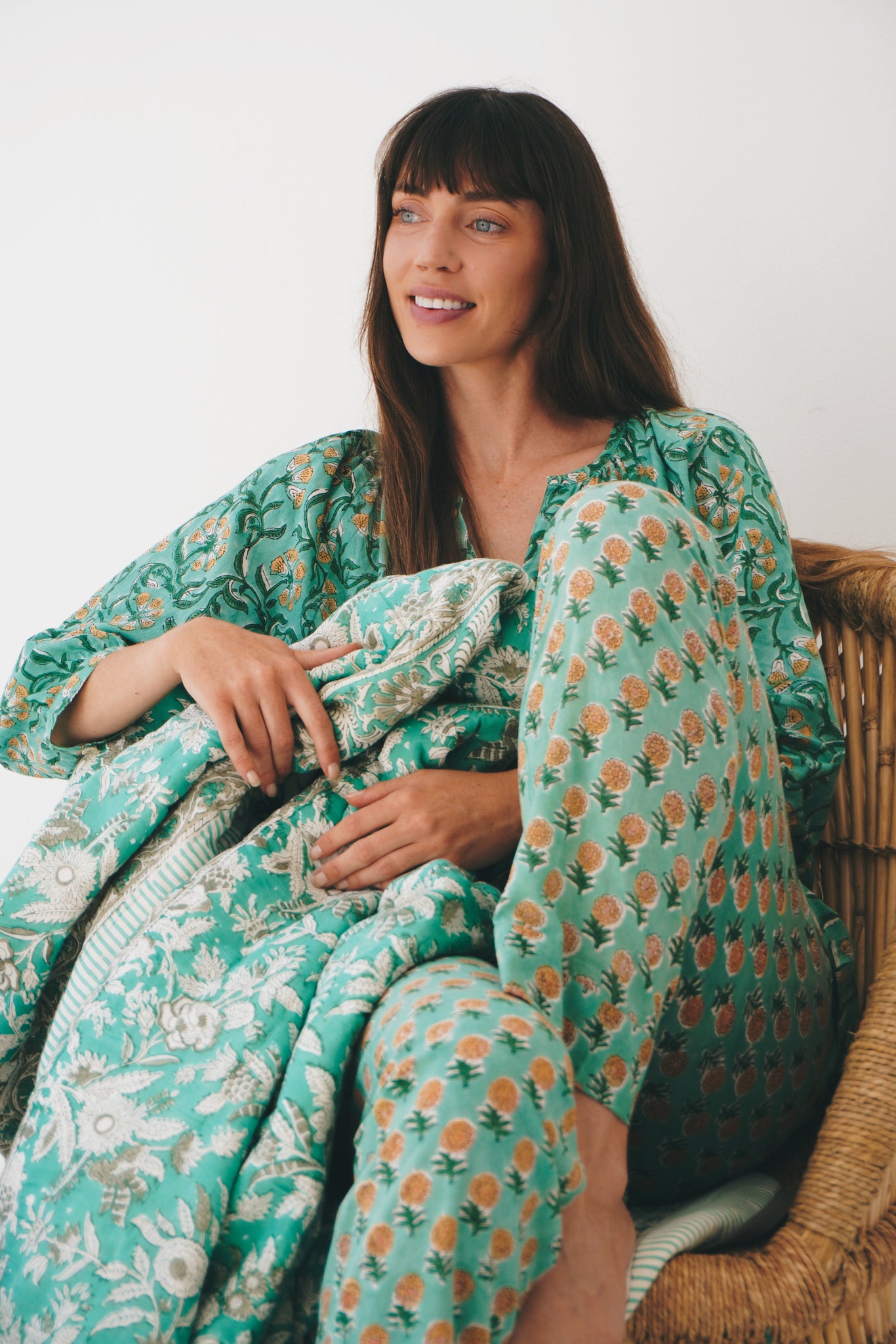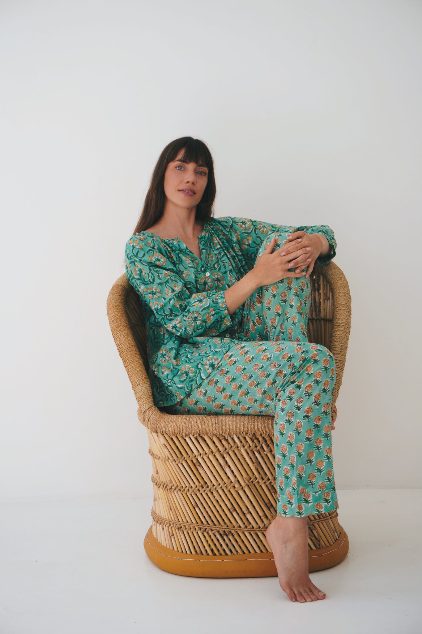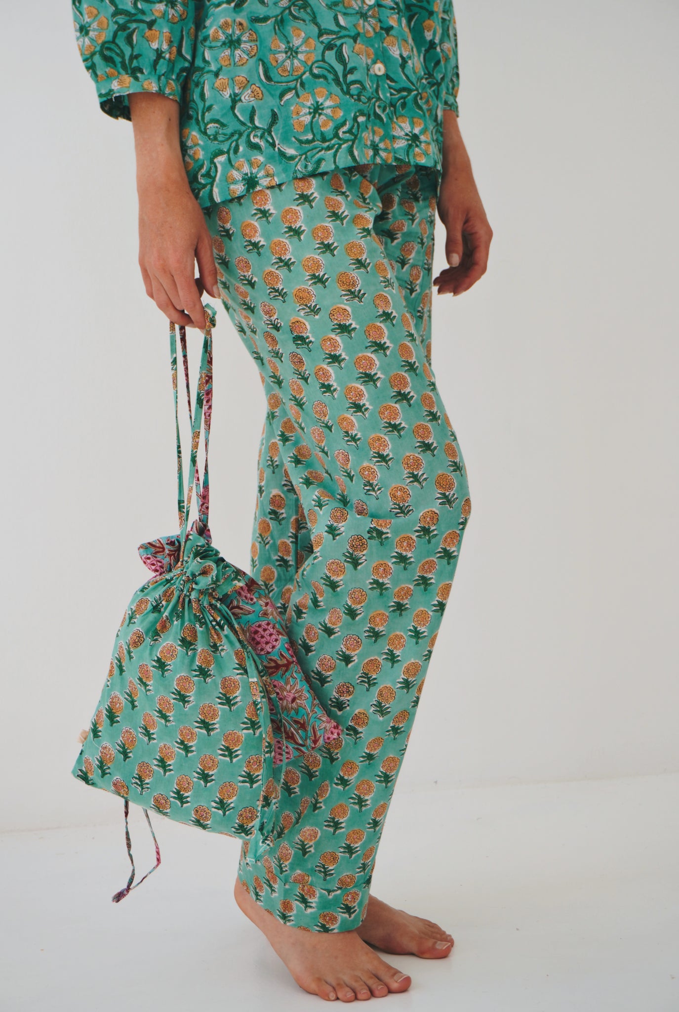 The sweetest little set, which comes in their own cute as a button bag! 100% cotton and hand printed, the top features a rounded neckline with subtle pleating - buttons all the way down the front. The sleeves have some length, and are cuffed with a small button. The body falls straight, but has plenty of room - when it comes to pajamas we know comfort is key!