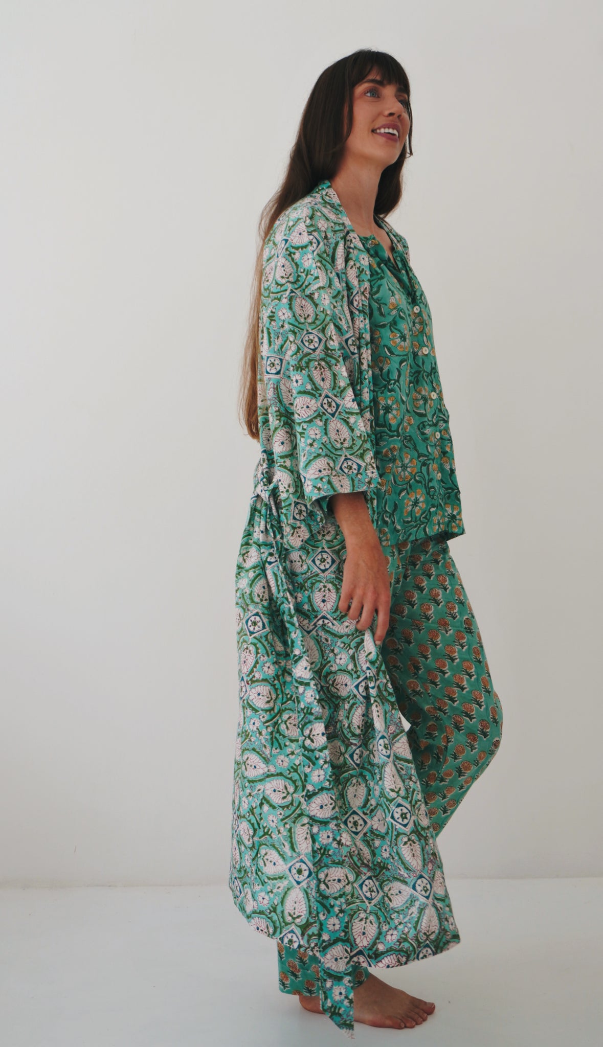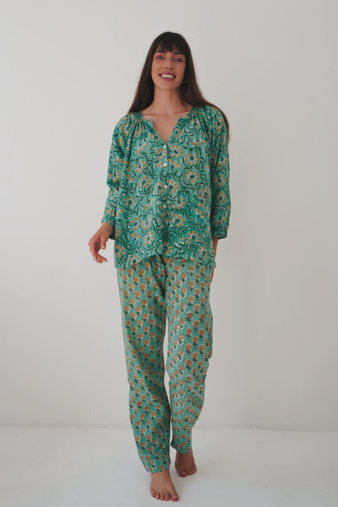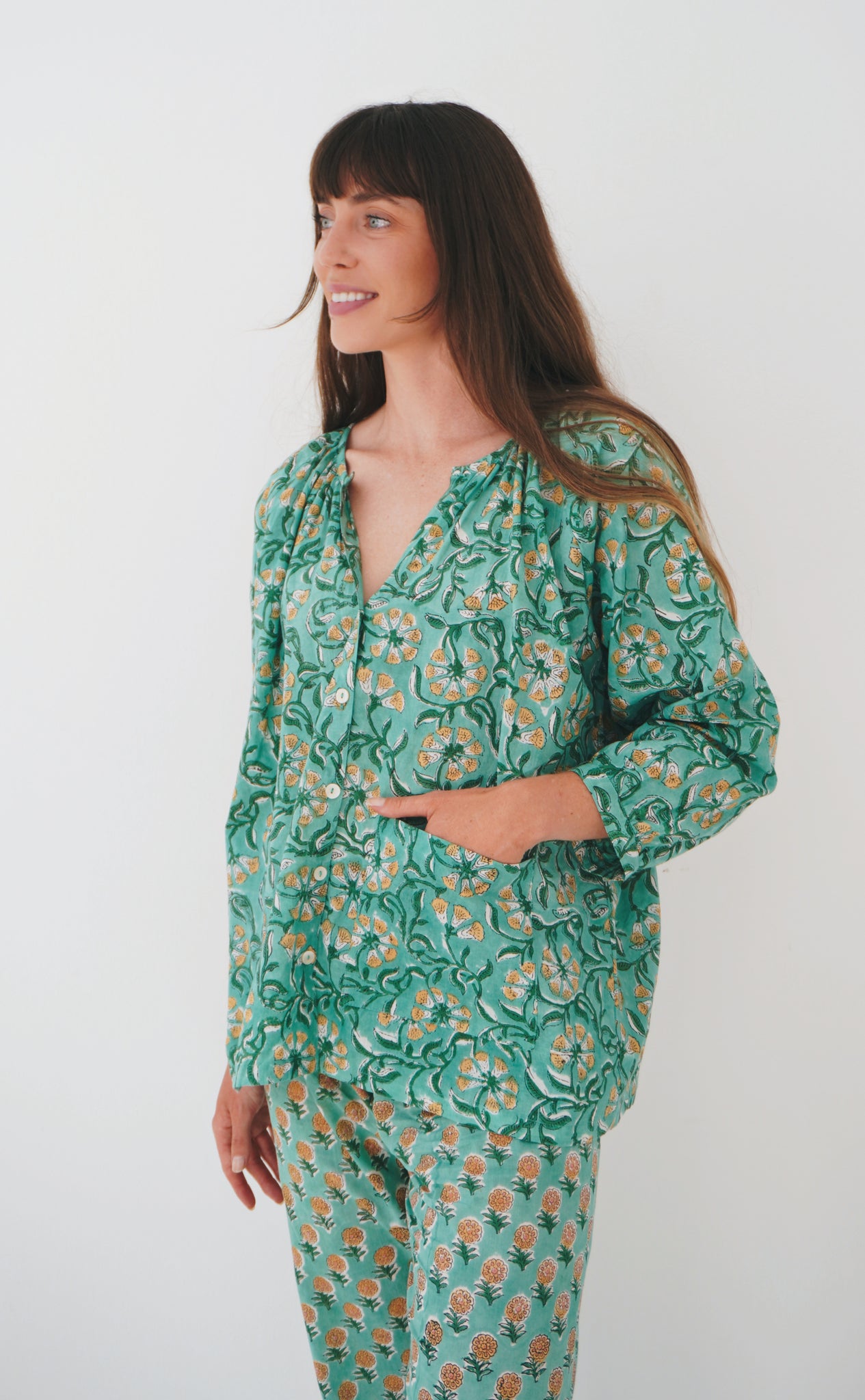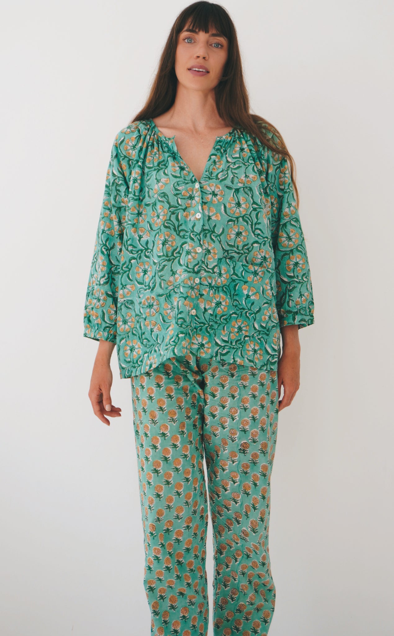 The sweetest little set, which comes in their own cute as a button bag! 100% cotton and hand printed, the top features a rounded neckline with subtle pleating - buttons all the way down the front. The sleeves have some length, and are cuffed with a small button. The body falls straight, but has plenty of room - when it comes to pajamas we know comfort is key!