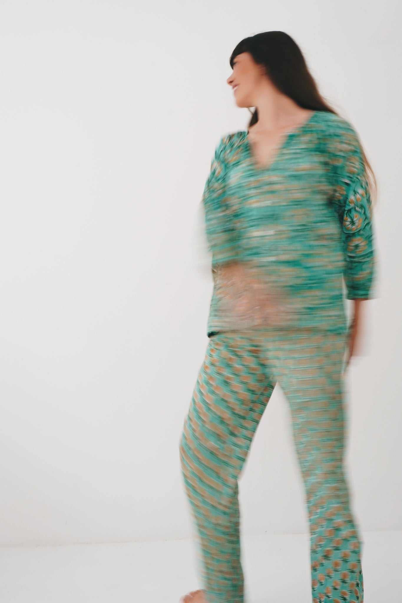 The pants are long, with a slight cuff, and feature an elastic with a drawstring tye for comfort and sizing flexibility. The top and bottom of this set are different prints in the same colour scheme- we are slightly obsessed with the mix and match cuteness!