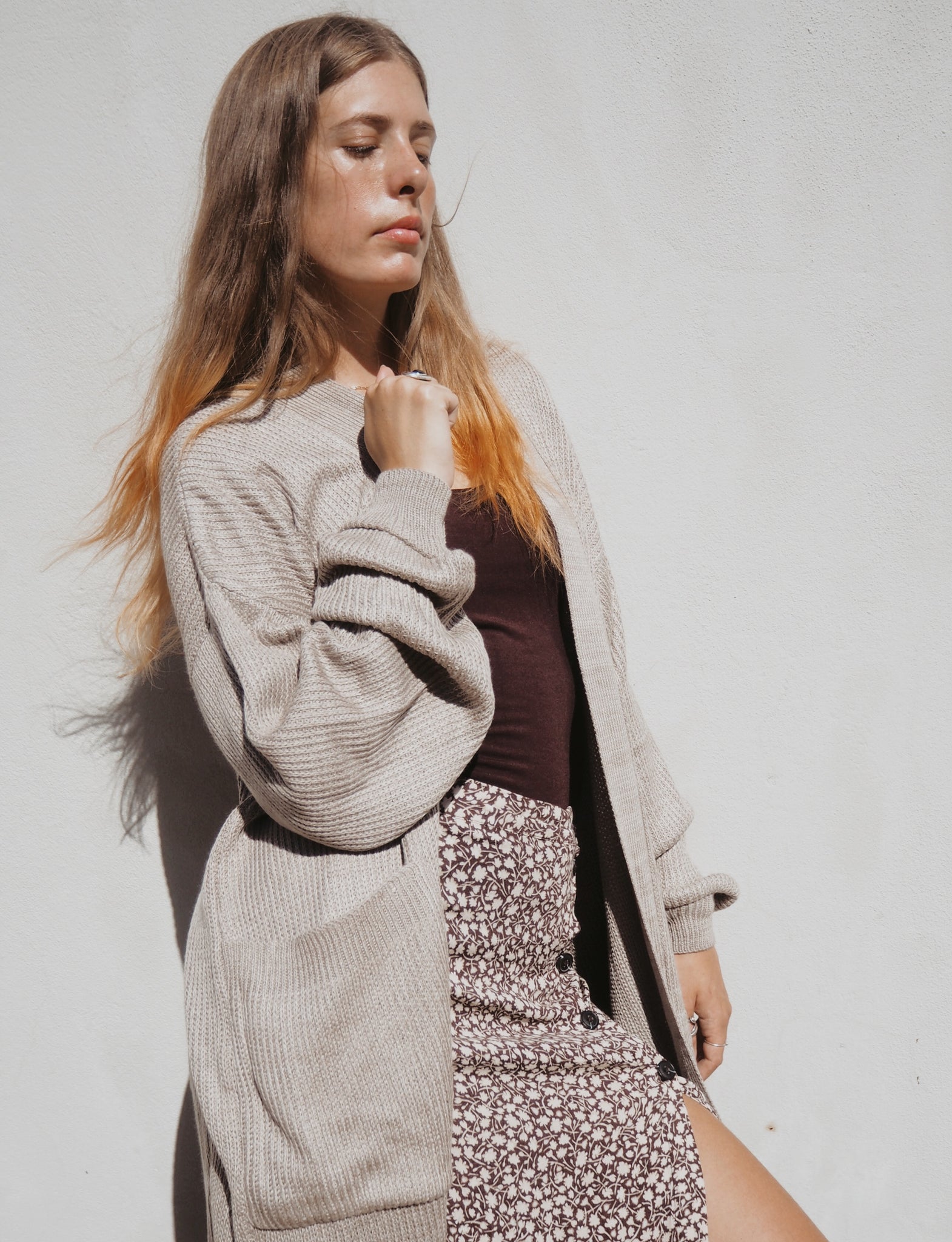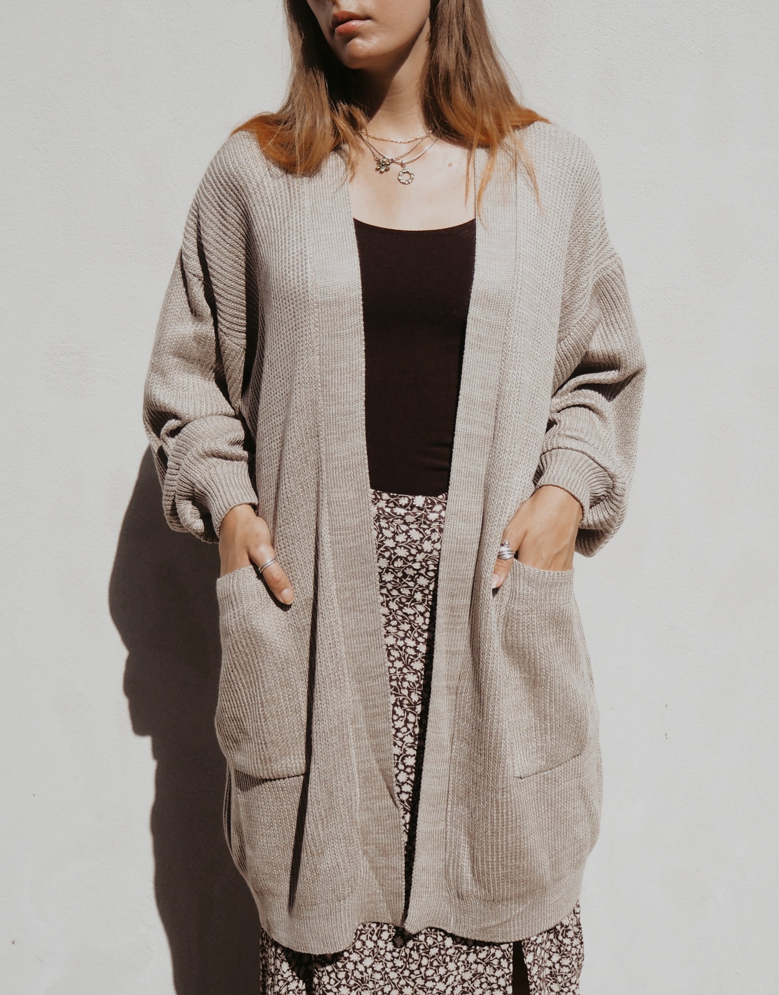 Everybody loves a comfy cardigan! A slightly heavier bamboo blend to keep you extra cozy. A loose fit, with an open neckline and deep pockets. The sleeves are slightly bubbled and then gathered at the wrist, providing a stylish little twist. The neutral stone color is so versatile, pair it with just about everything!