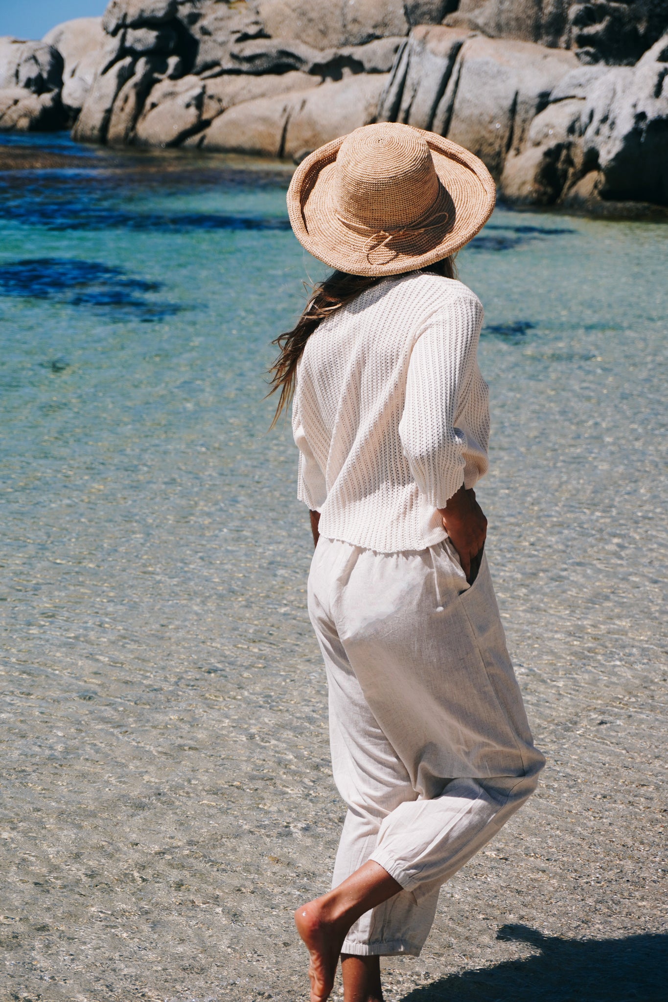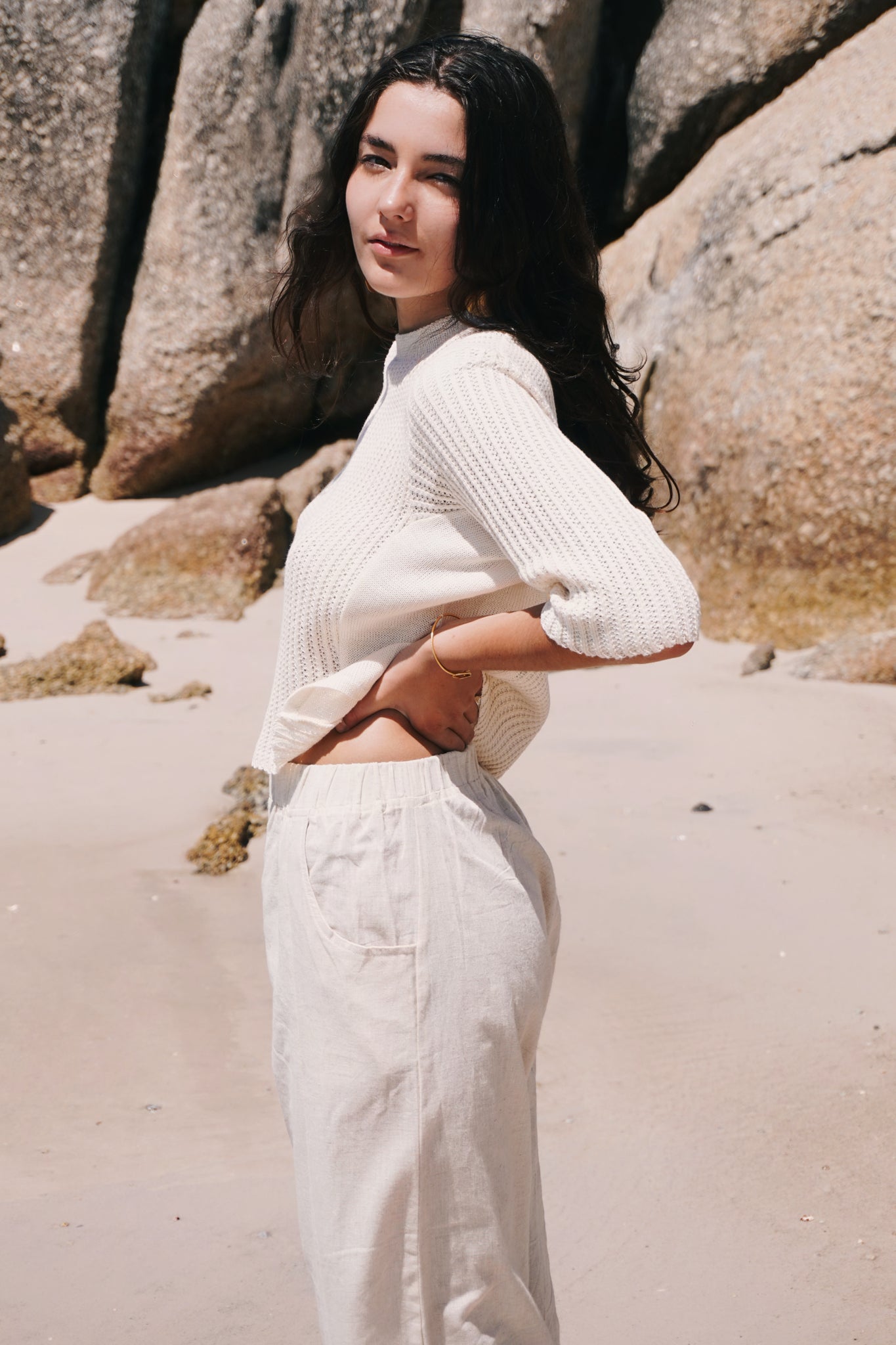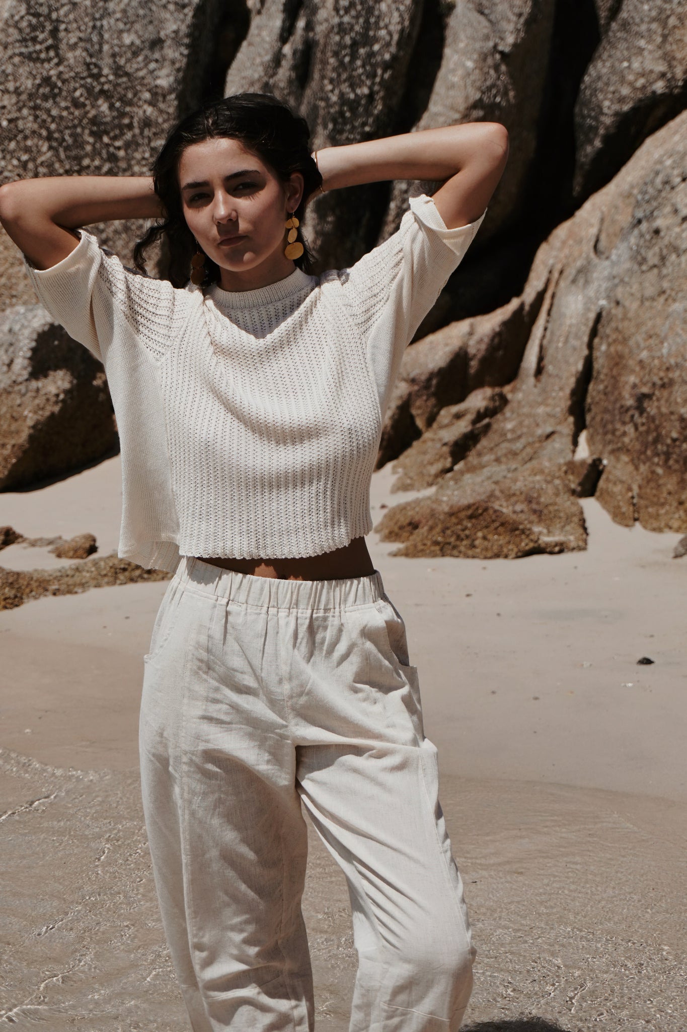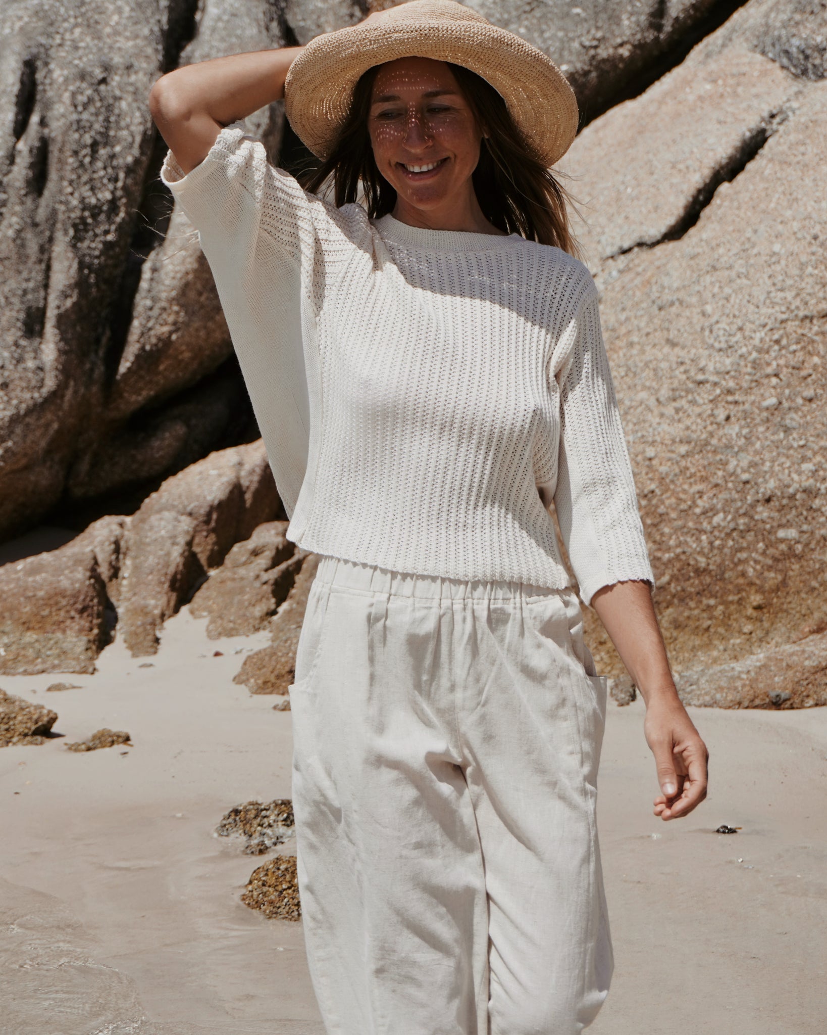 The detailing in the stitching is something special! Made from a cotton and bamboo blend, this piece has a rounded neckline hemmed in a tighter stitch, it then falls into a cropped loose fit body in a loose stitch with delicious texture. The arms have a slight batwing, but it's accentuated by a panel that runs under the arm and down the side of the knit.. just lovey!