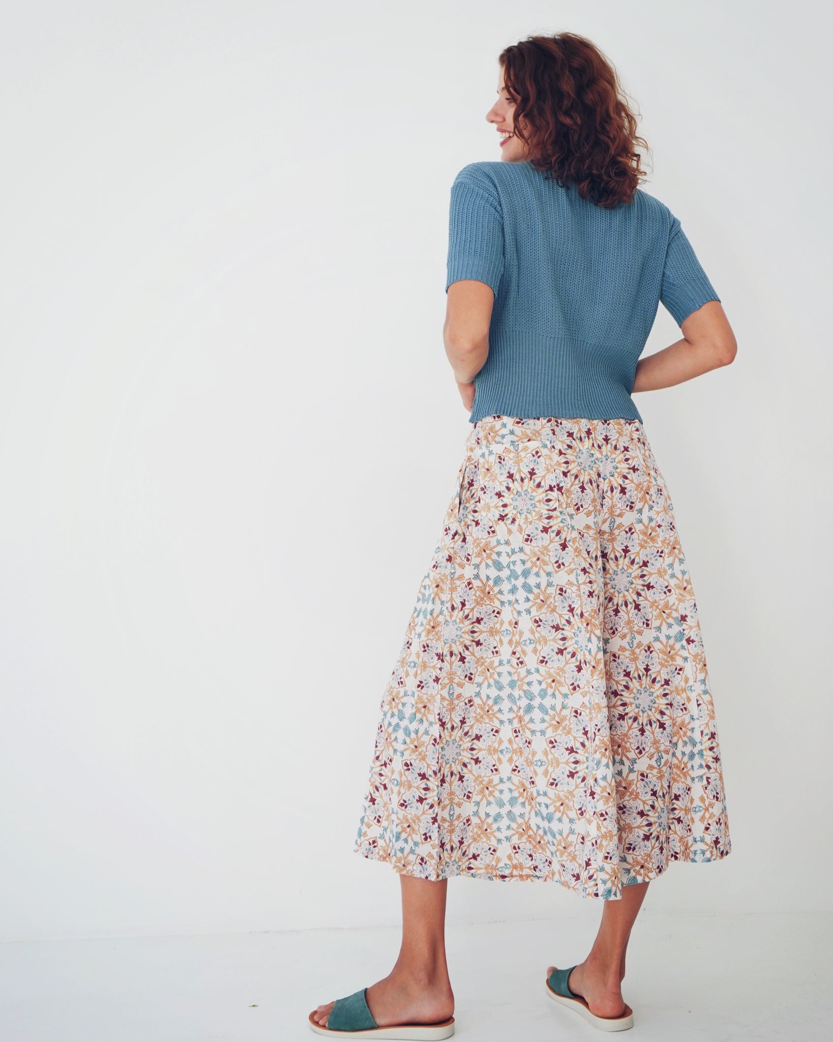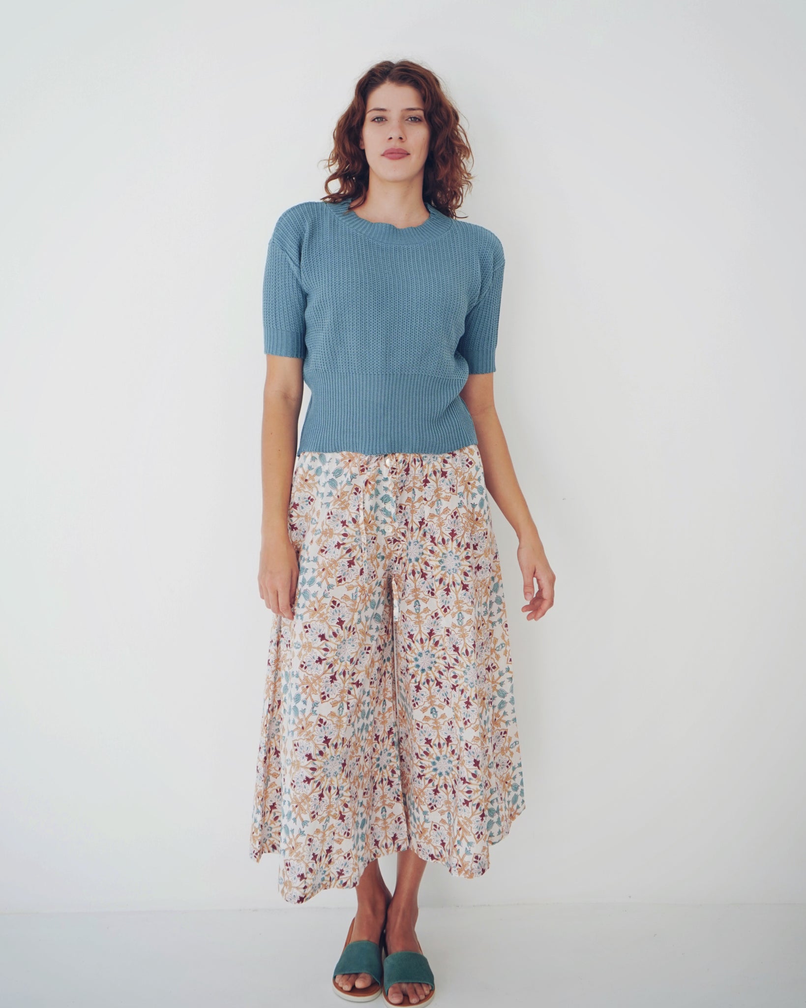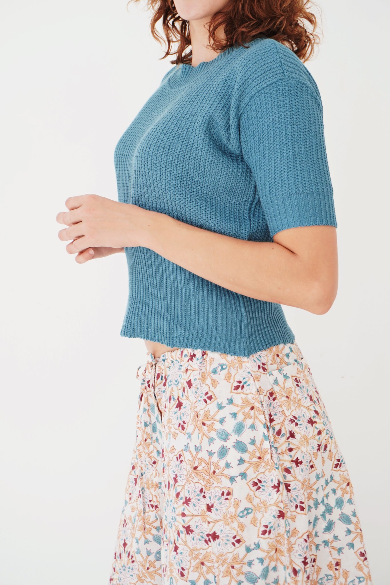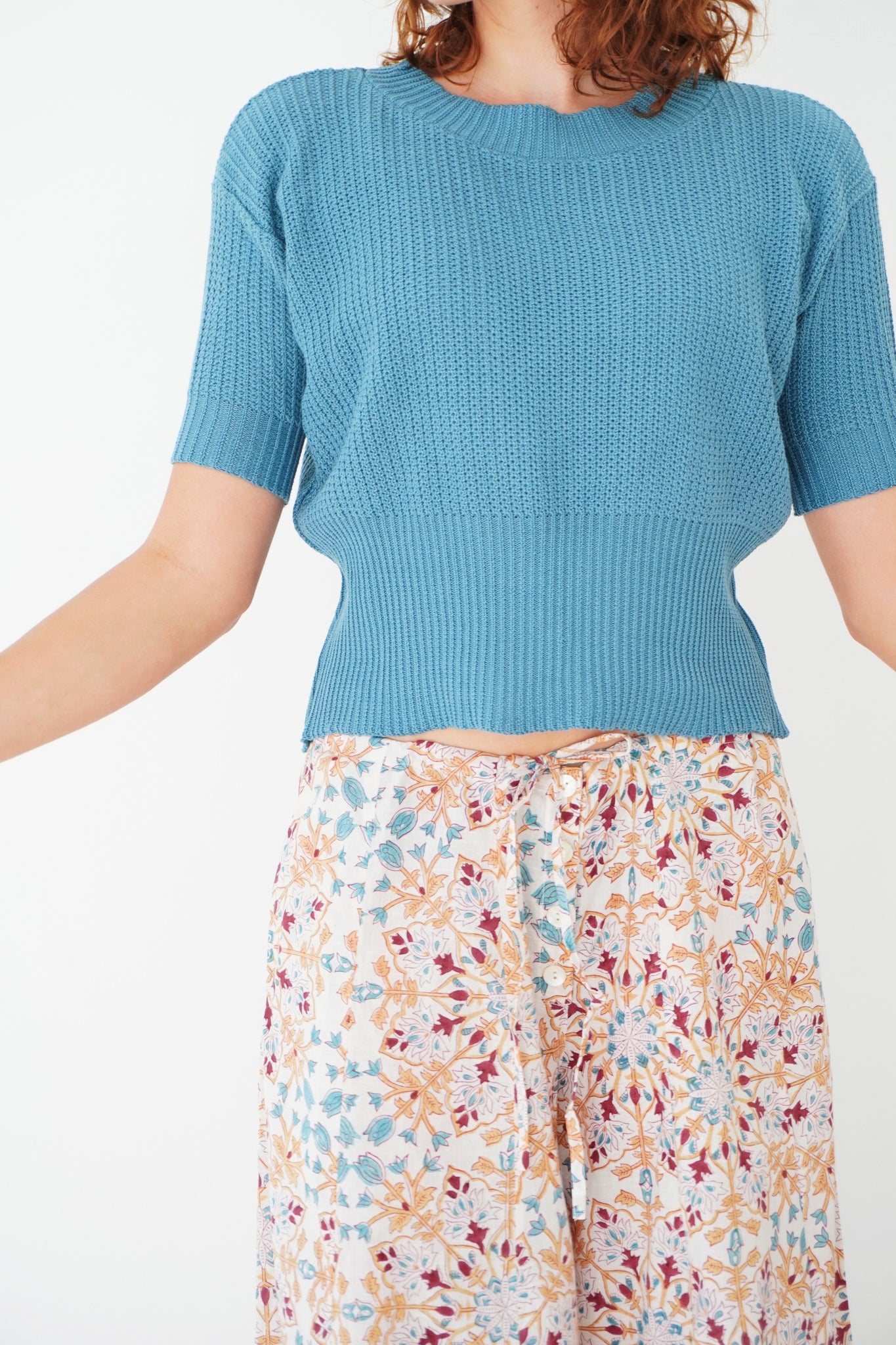 Something knitted for your summer wardrobe. A lovely cotton and bamboo mix, with a rounded neckline, accentuated by a rubbed stitch, fitted sleeves and a body ever so slightly cropped - with the lower hem subtly gathered with a contrasting stitch. The colour is just dreamy, a beautiful blue-green that feels like a dip in the ocean!