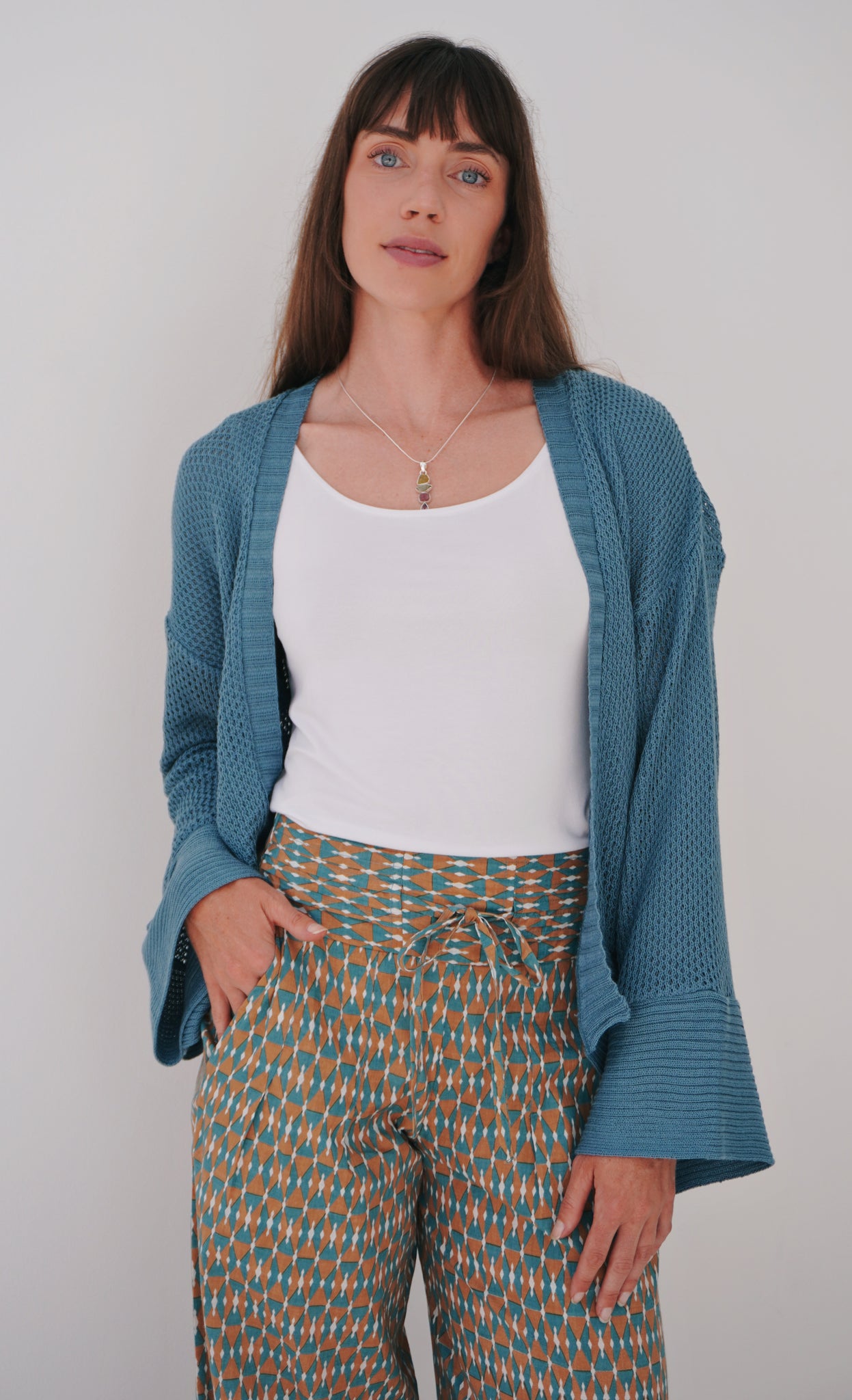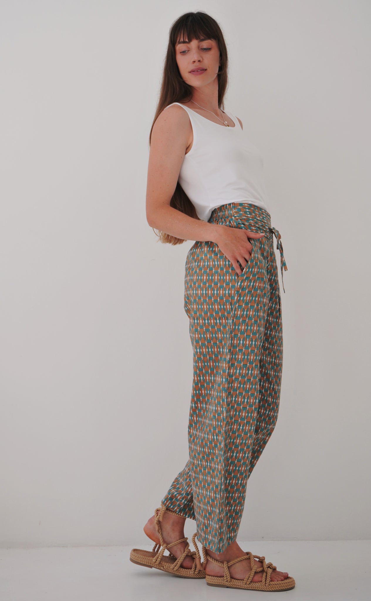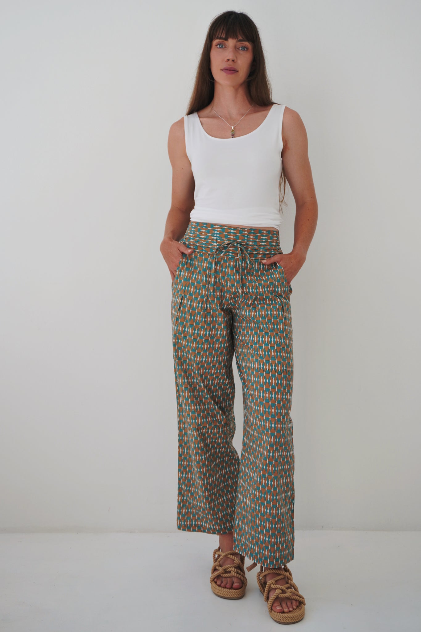 The fit is perfection! 100% Cotton, featuring a high waist with a broad band and tye to adjust the sizing- the back is elasticated for those extra comfort points! The legs fall long and have some width to them (they may be a bit cropped for those on the taller side). Pockets are present, and ready to be used. These pants are both comfy and stylish, they have that easily put together feel.