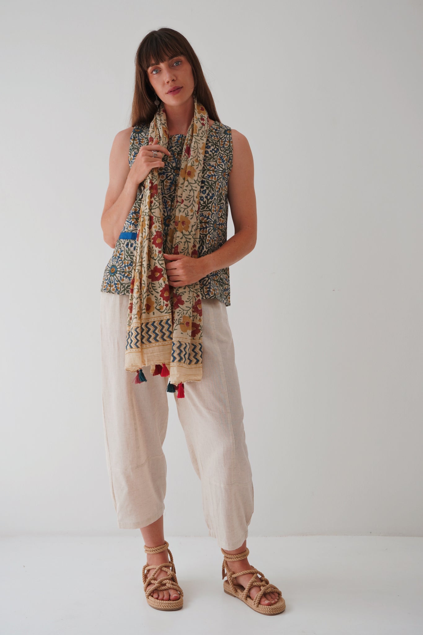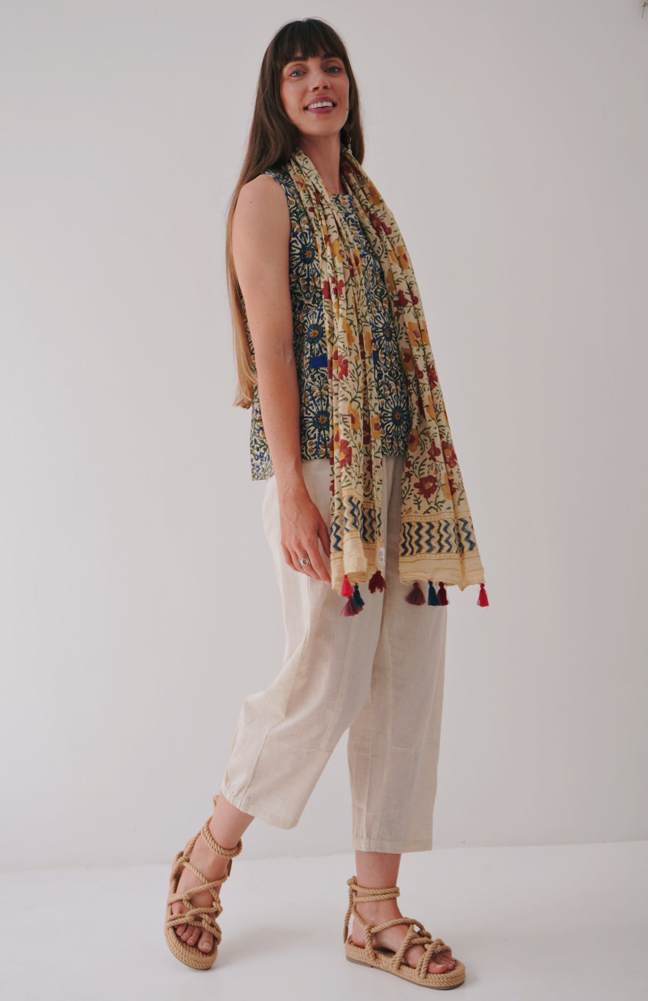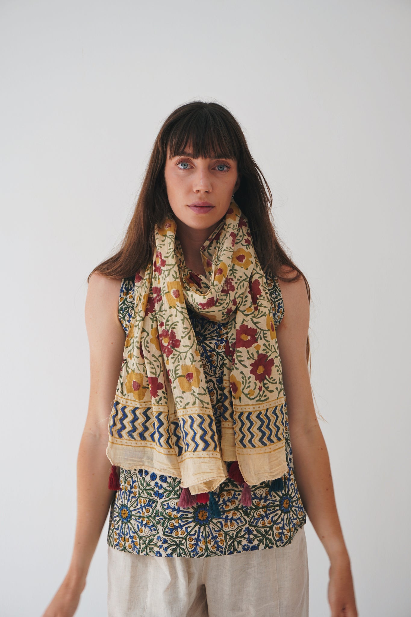Hand Printed in Natural Dye.. A summer scarf, in soft soft cotton, the perfect extra layer for early mornings or late evenings (or even just to keep the sun off a touch!). Tassels add some fun, and who doesn't need more of that!