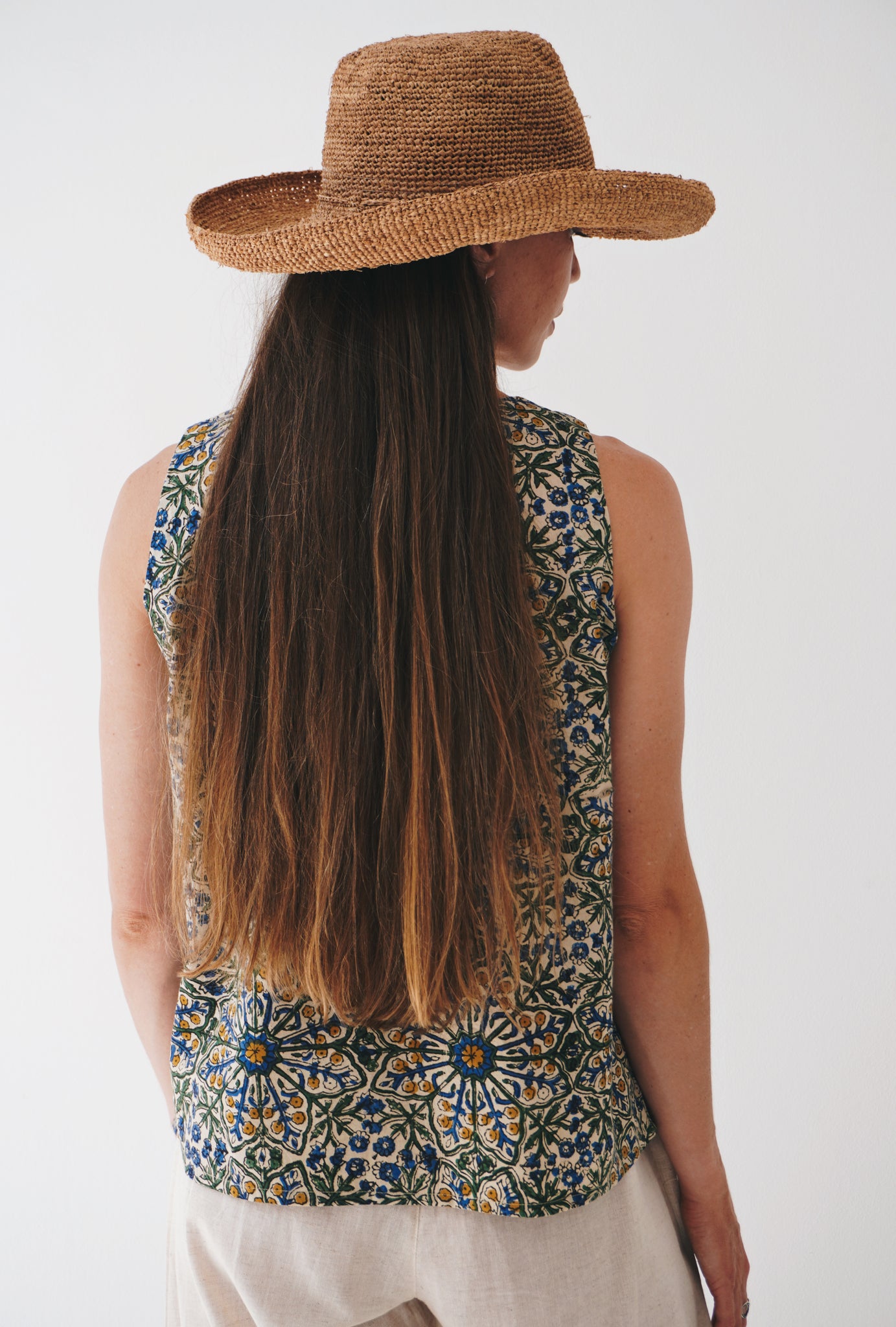 A pop of colour in rich, earthy tones. 100% cotton and hand printed via block print. A simple style, a high vest neckline with a slight cap to the sleeve, a straight body (not too fitted) with a sweet little pocket detail. Easy to style, available in various lovely prints.