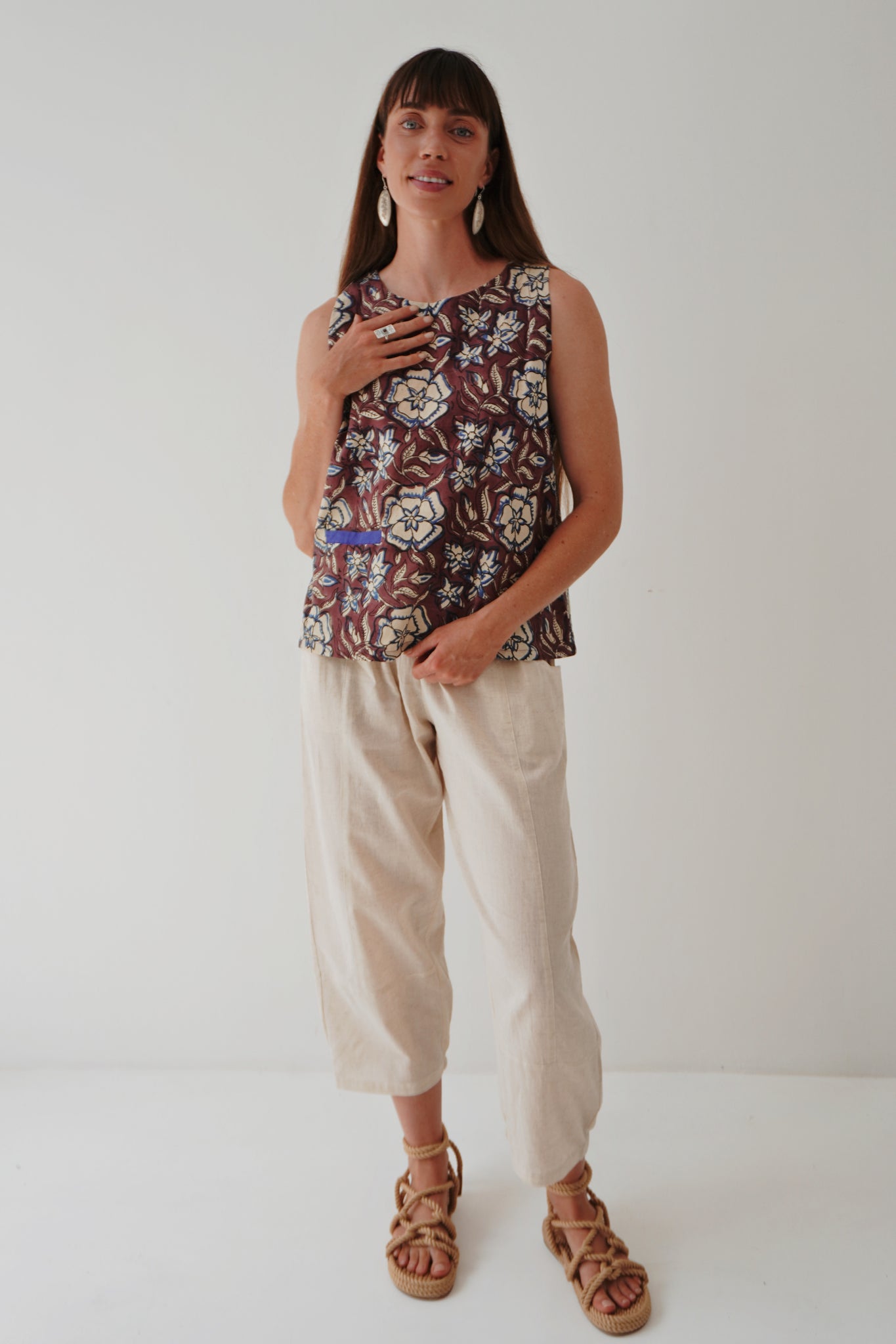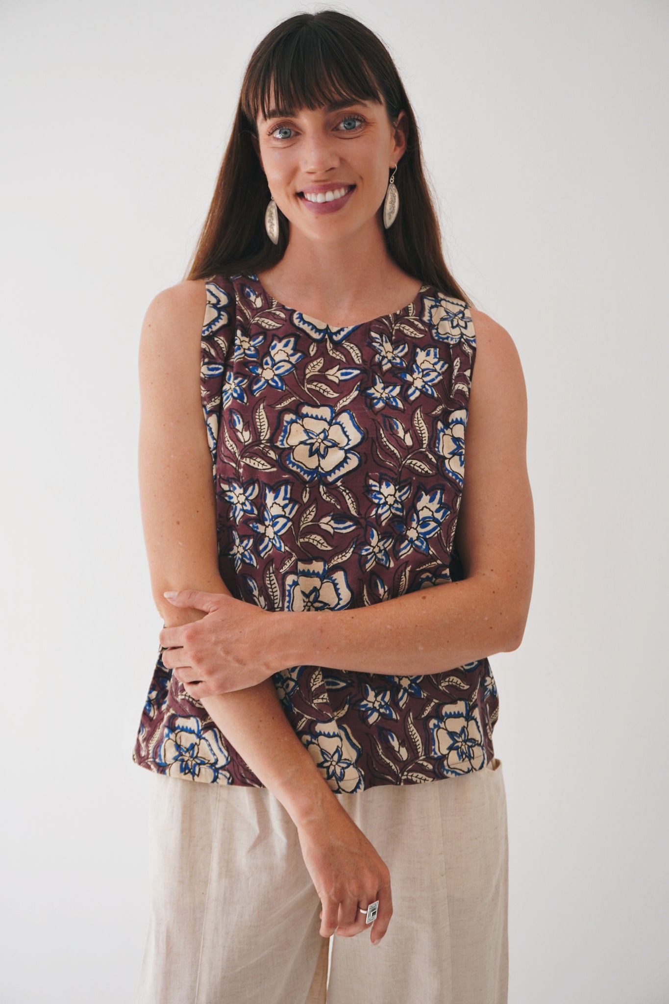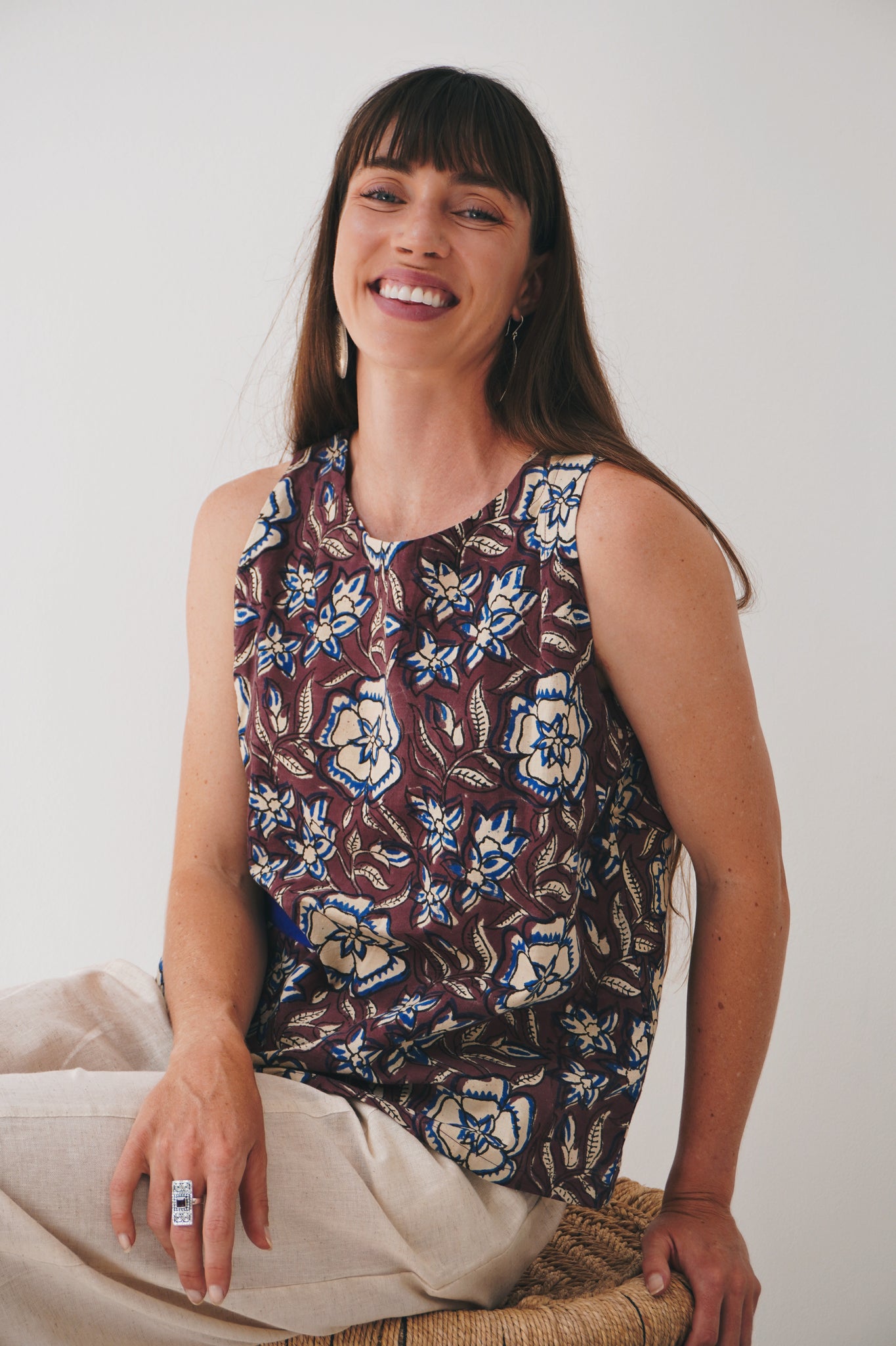 A pop of colour in rich, earthy tones. 100% cotton and hand printed via block print. A simple style, a high vest neckline with a slight cap to the sleeve, a straight body (not too fitted) with a sweet little pocket detail. Easy to style, available in various lovely prints.