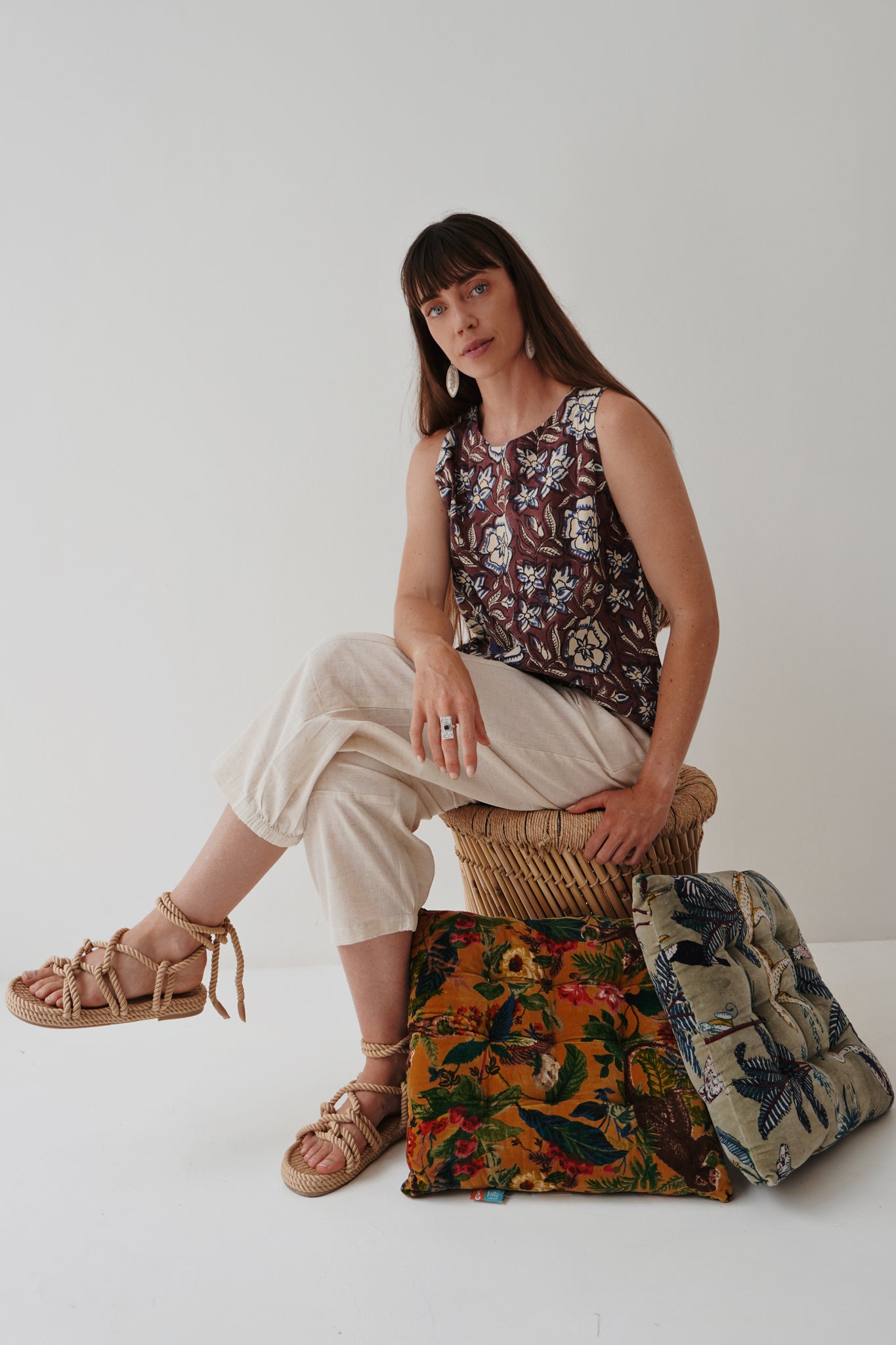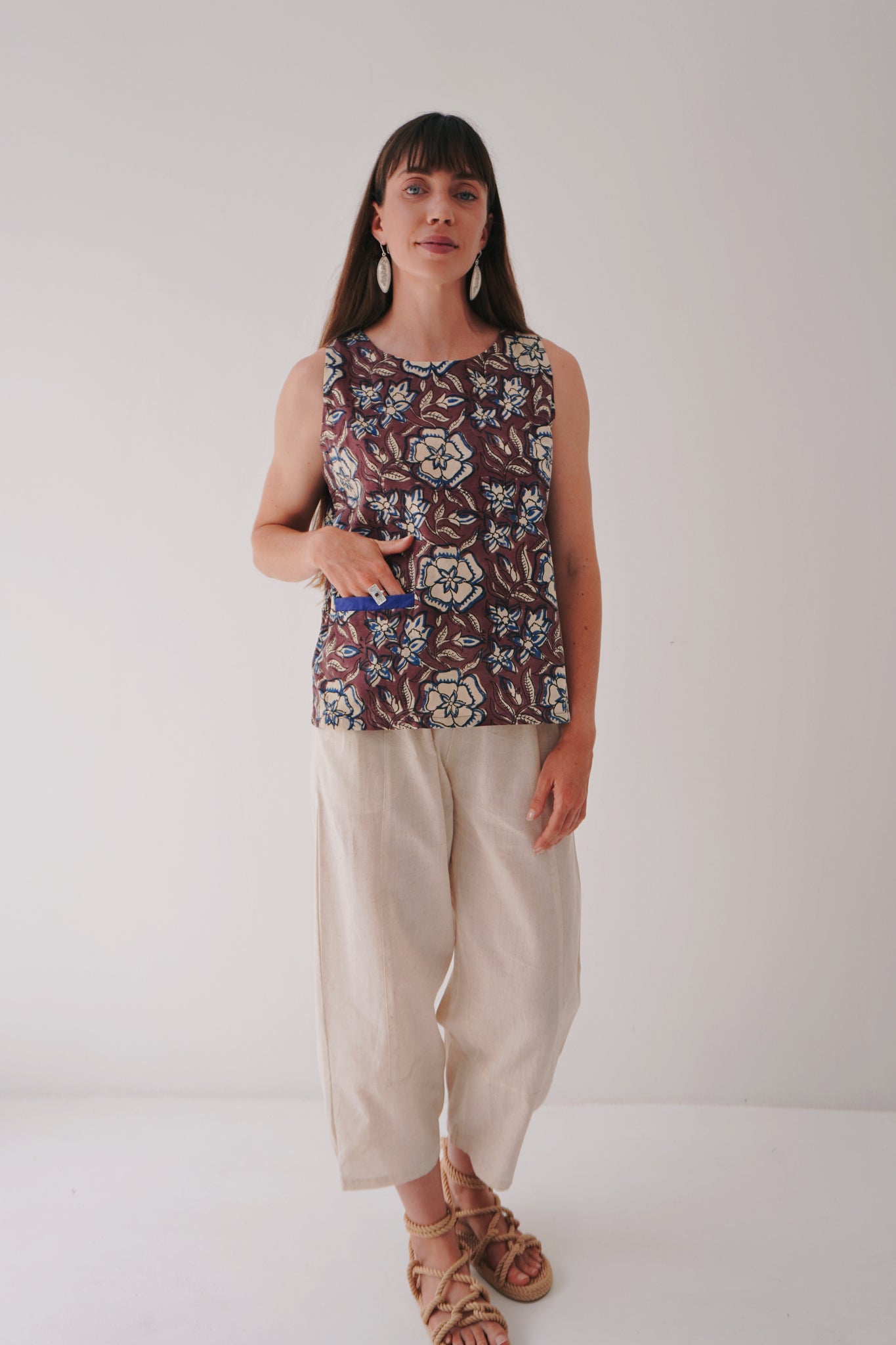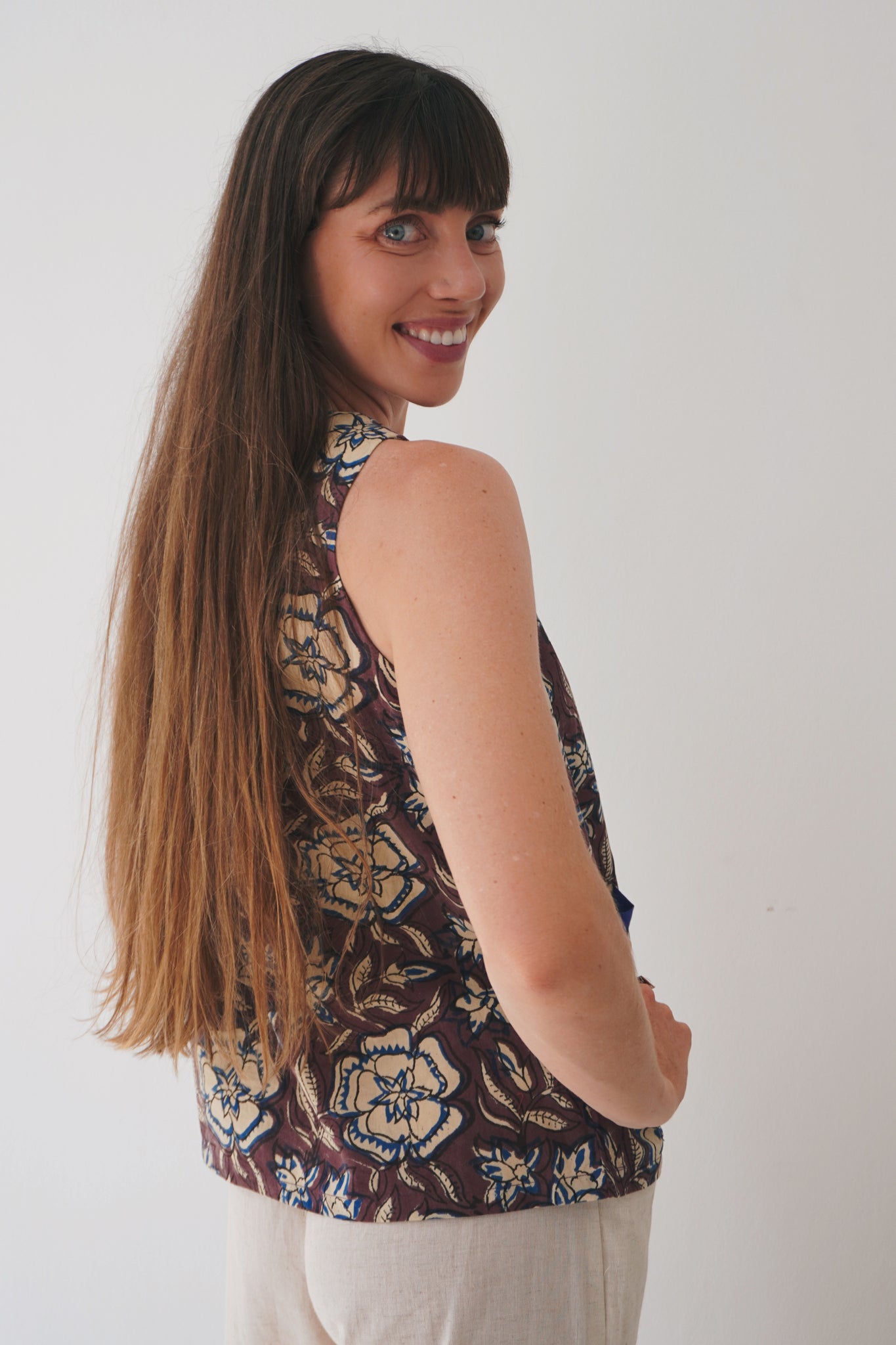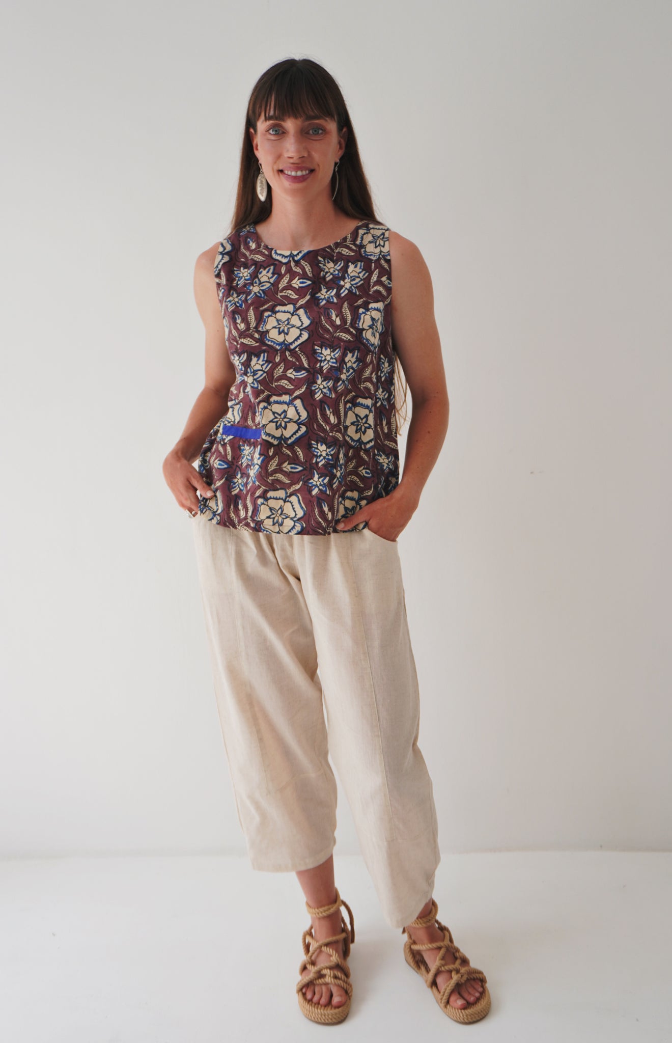 A pop of colour in rich, earthy tones. 100% cotton and hand printed via block print. A simple style, a high vest neckline with a slight cap to the sleeve, a straight body (not too fitted) with a sweet little pocket detail. Easy to style, available in various lovely prints.