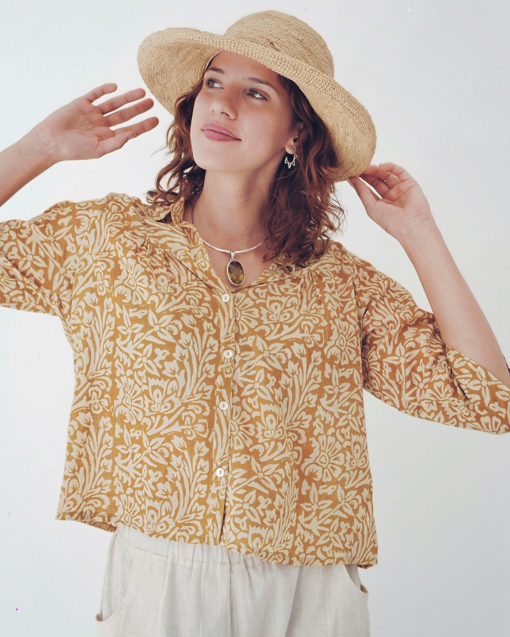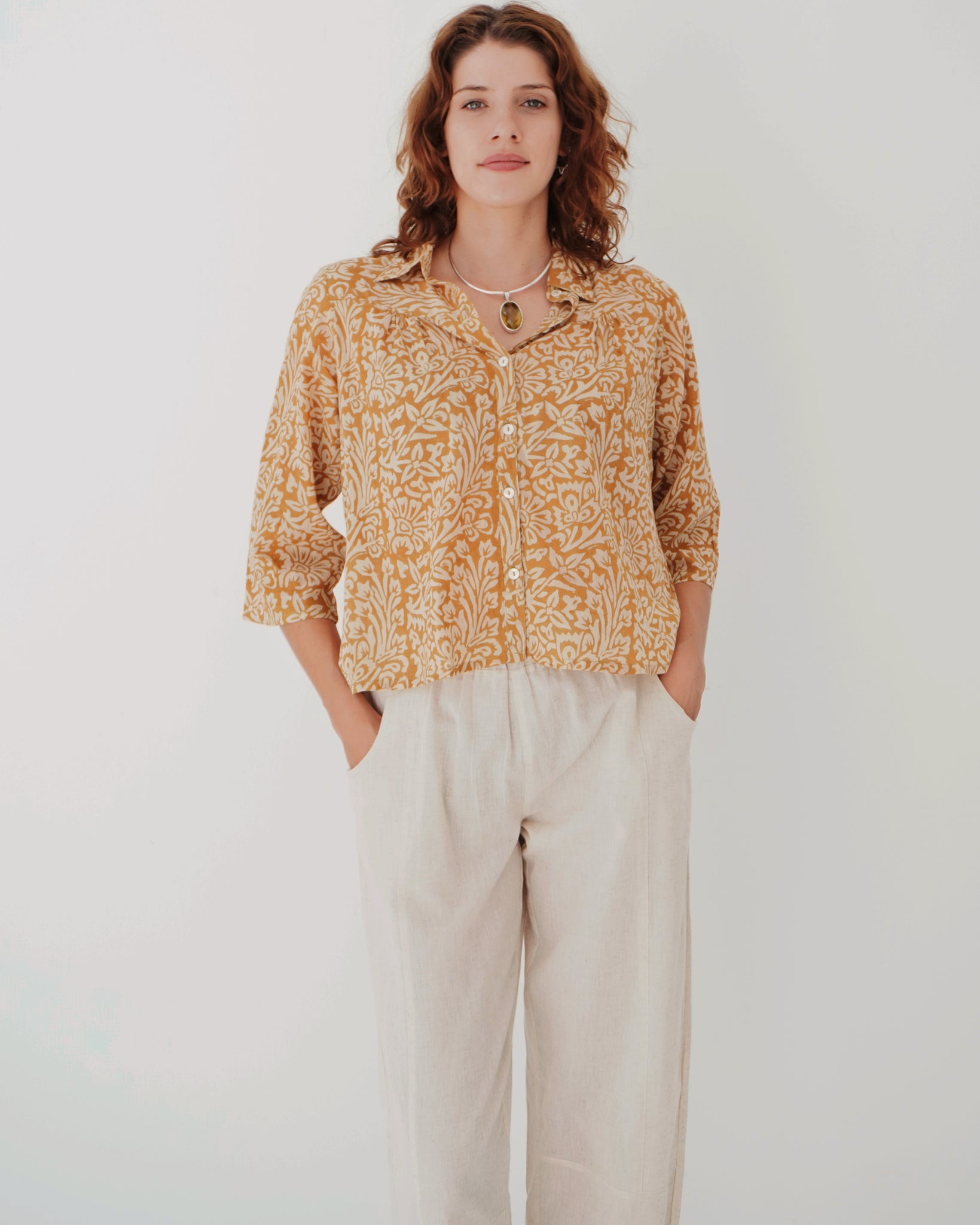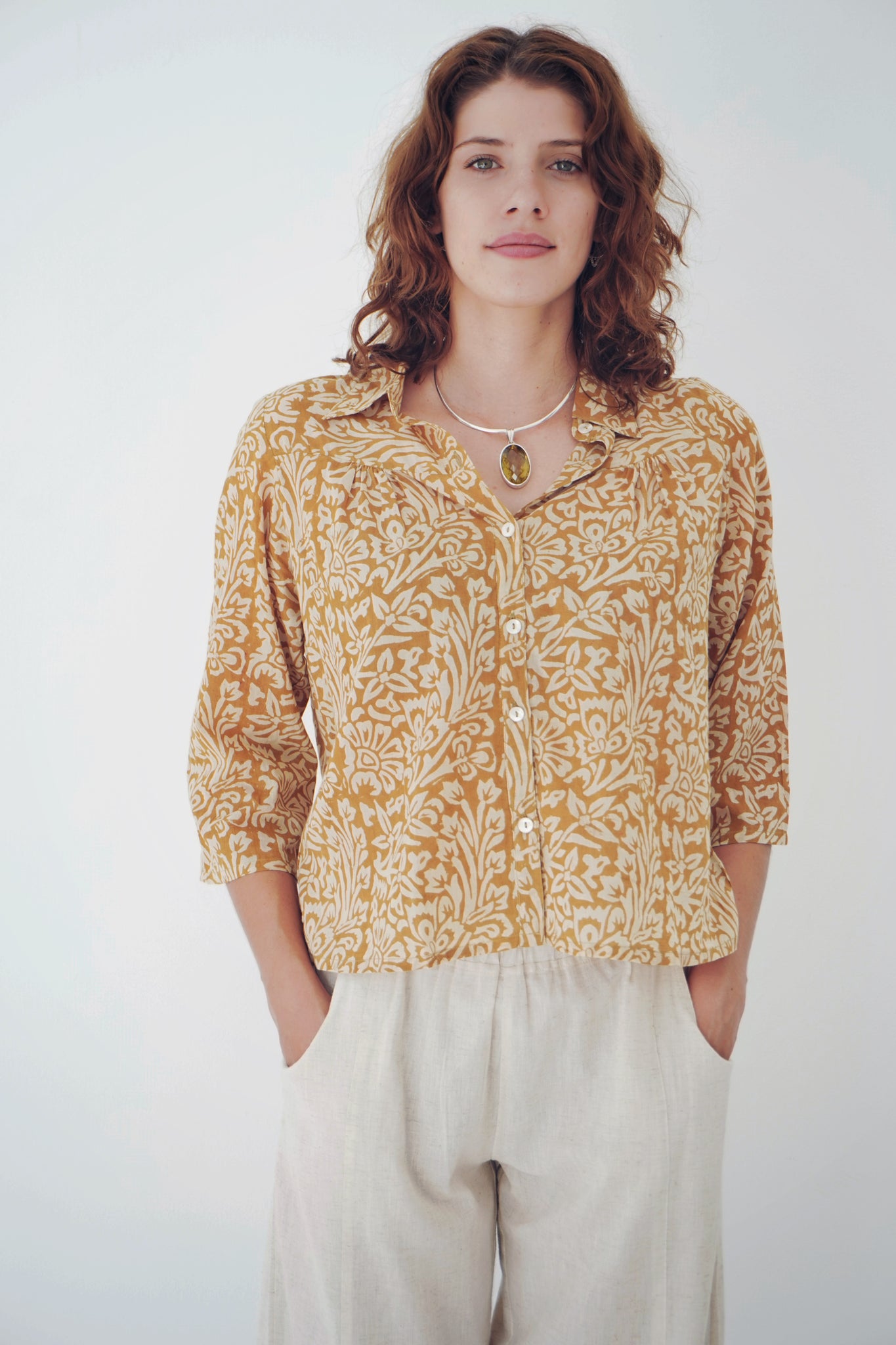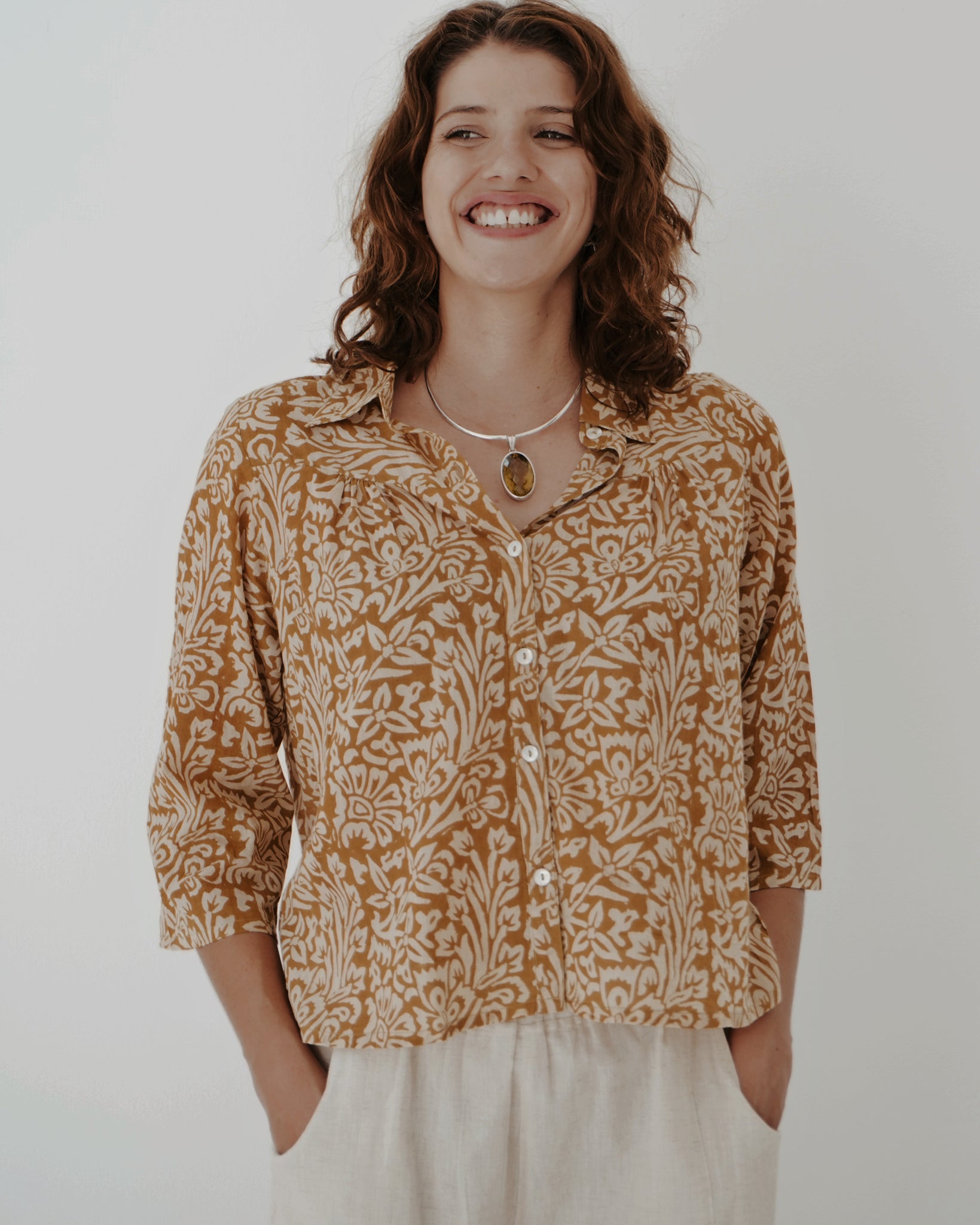 All around winner of a top! 100% cotton and printed by hand using all natural dye, the look and feel is delicious. A small collar, with buttons all the way down the front and a slight pin tuck at the breast and back gives her ever so slightly cropped length lovely movement. This contrasts in a lovely way with the semi-fitted sleeves. Warm neutral tones make this piece easy to style, something you will always be reaching for.