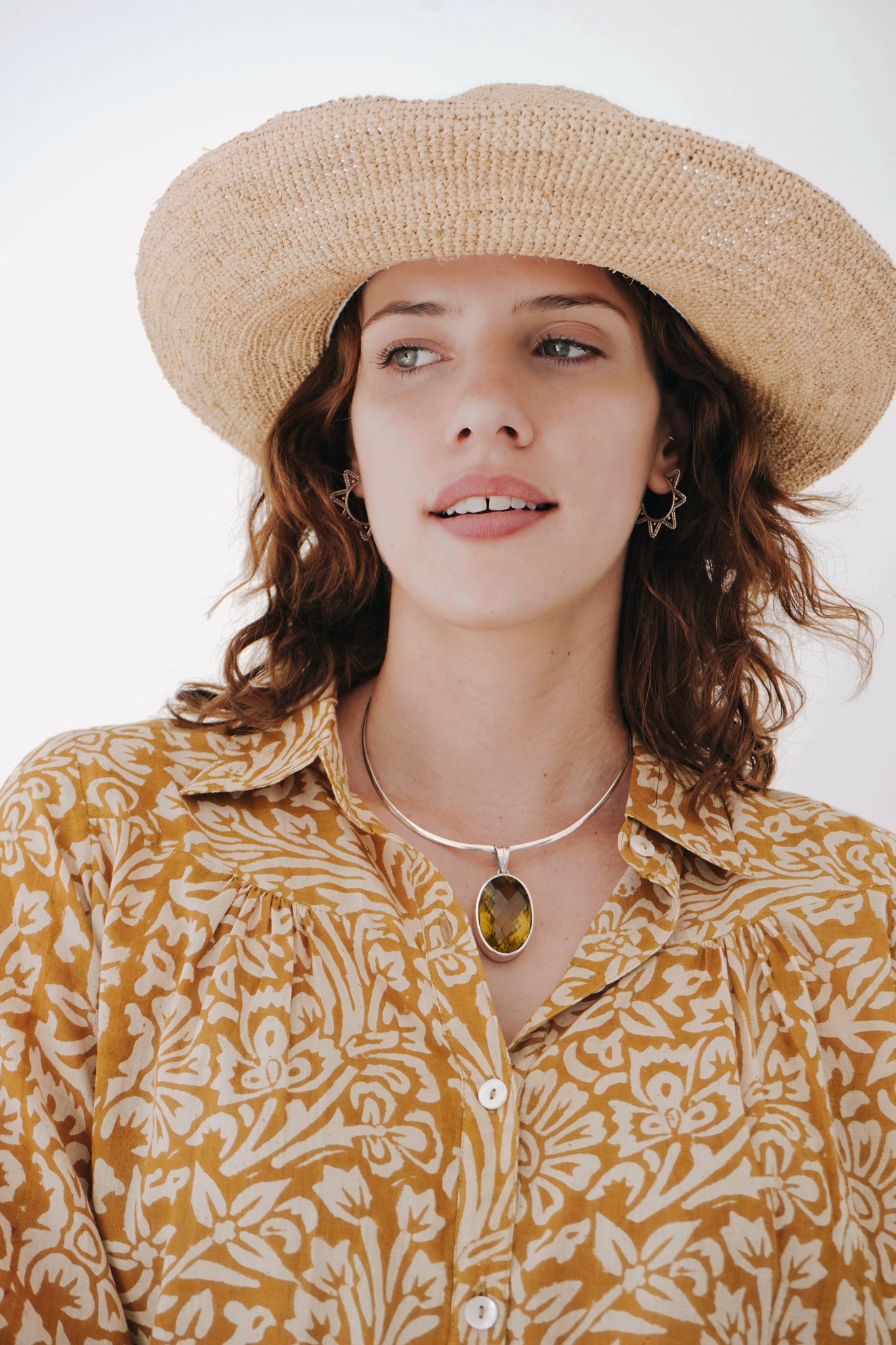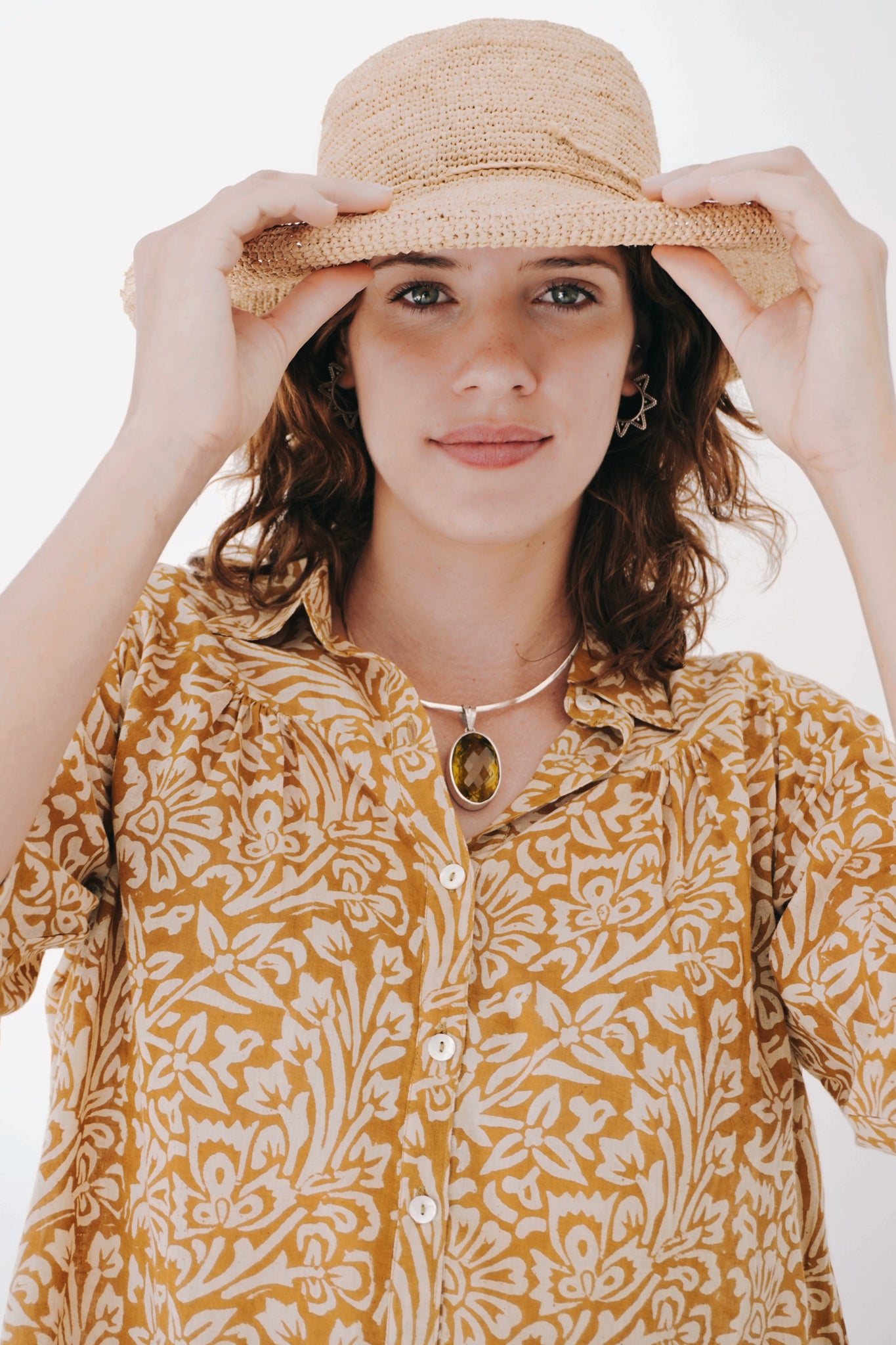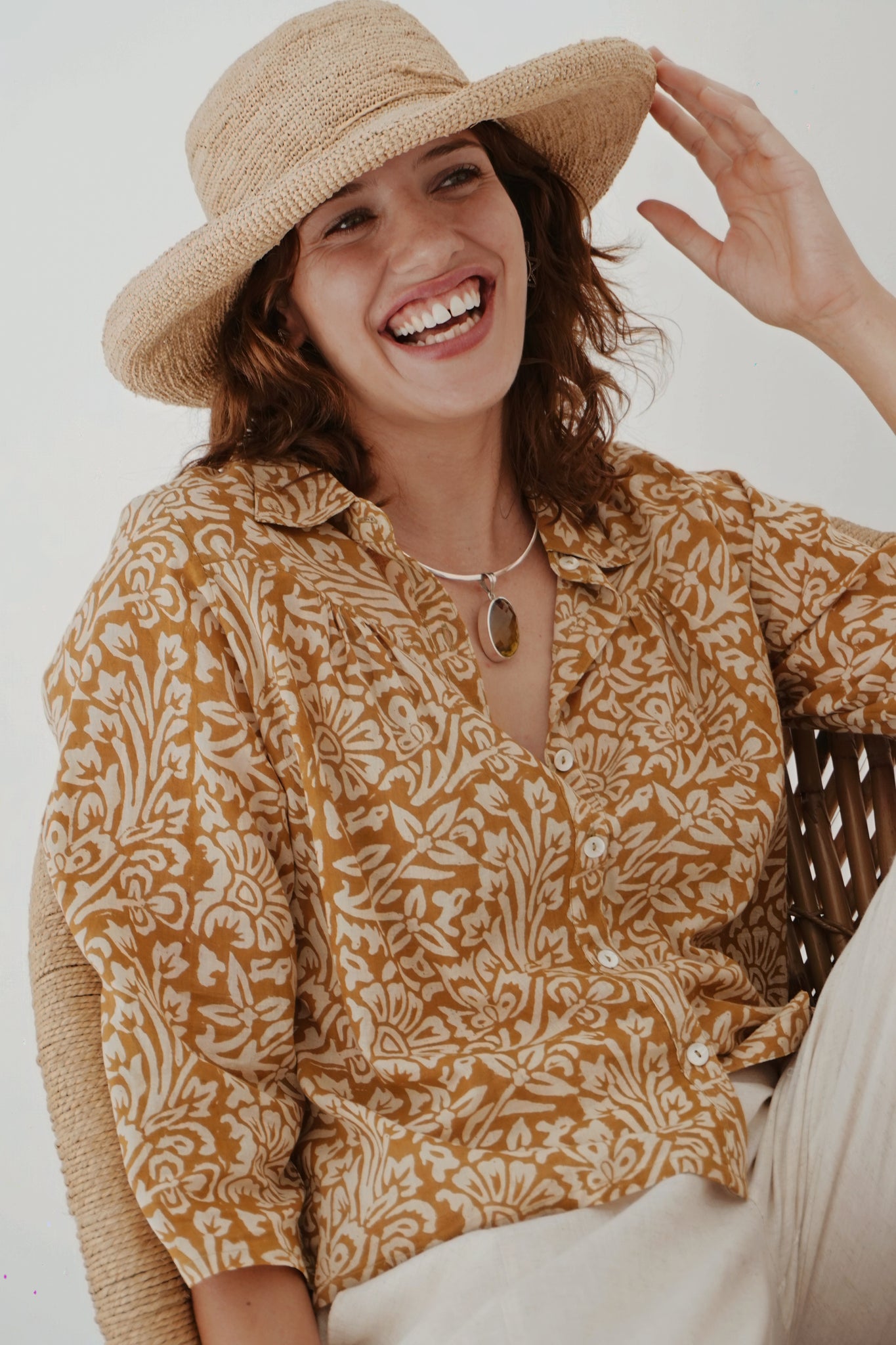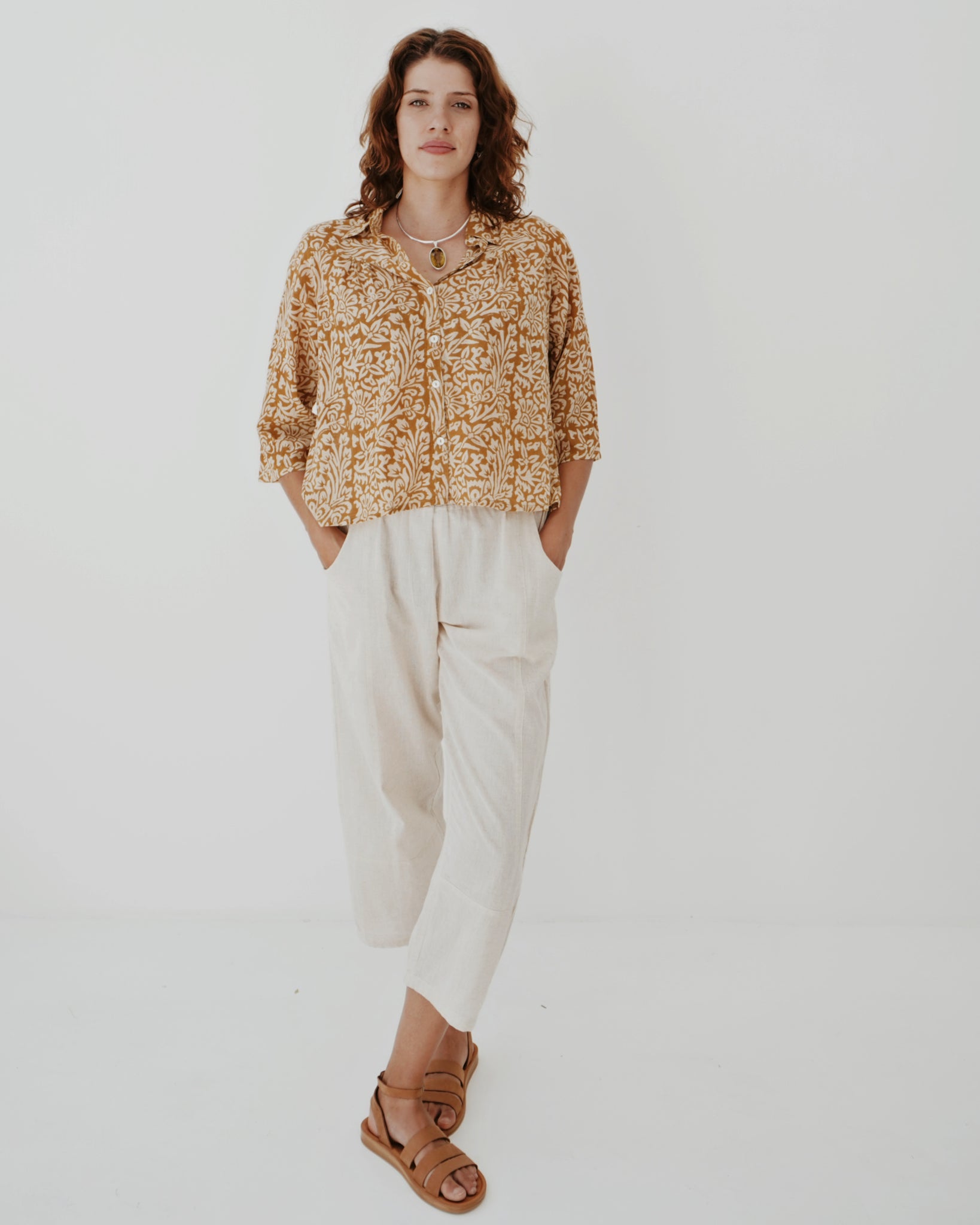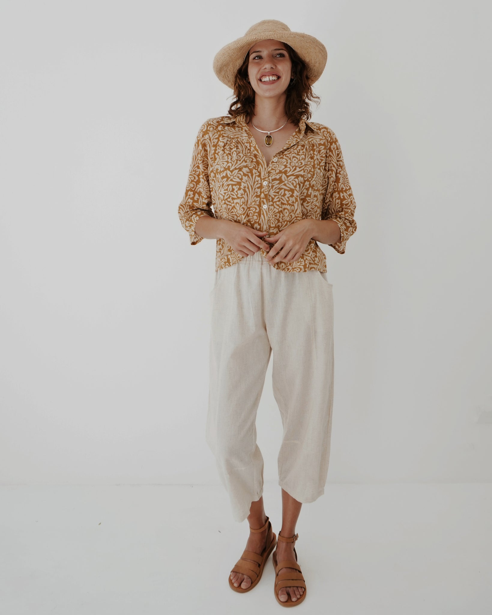 All around winner of a top! 100% cotton and printed by hand using all natural dye, the look and feel is delicious. A small collar, with buttons all the way down the front and a slight pin tuck at the breast and back gives her ever so slightly cropped length lovely movement. This contrasts in a lovely way with the semi-fitted sleeves. Warm neutral tones make this piece easy to style, something you will always be reaching for.