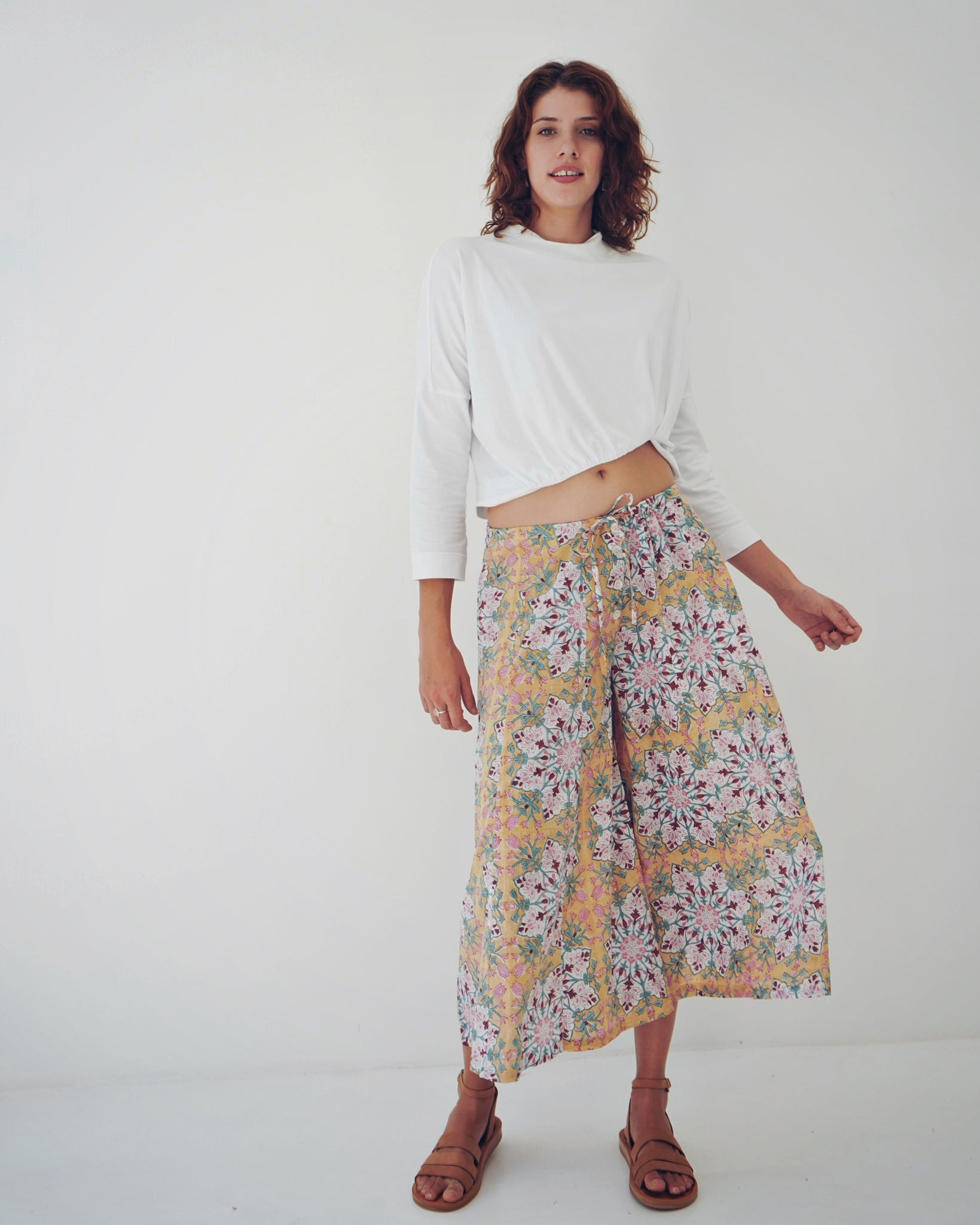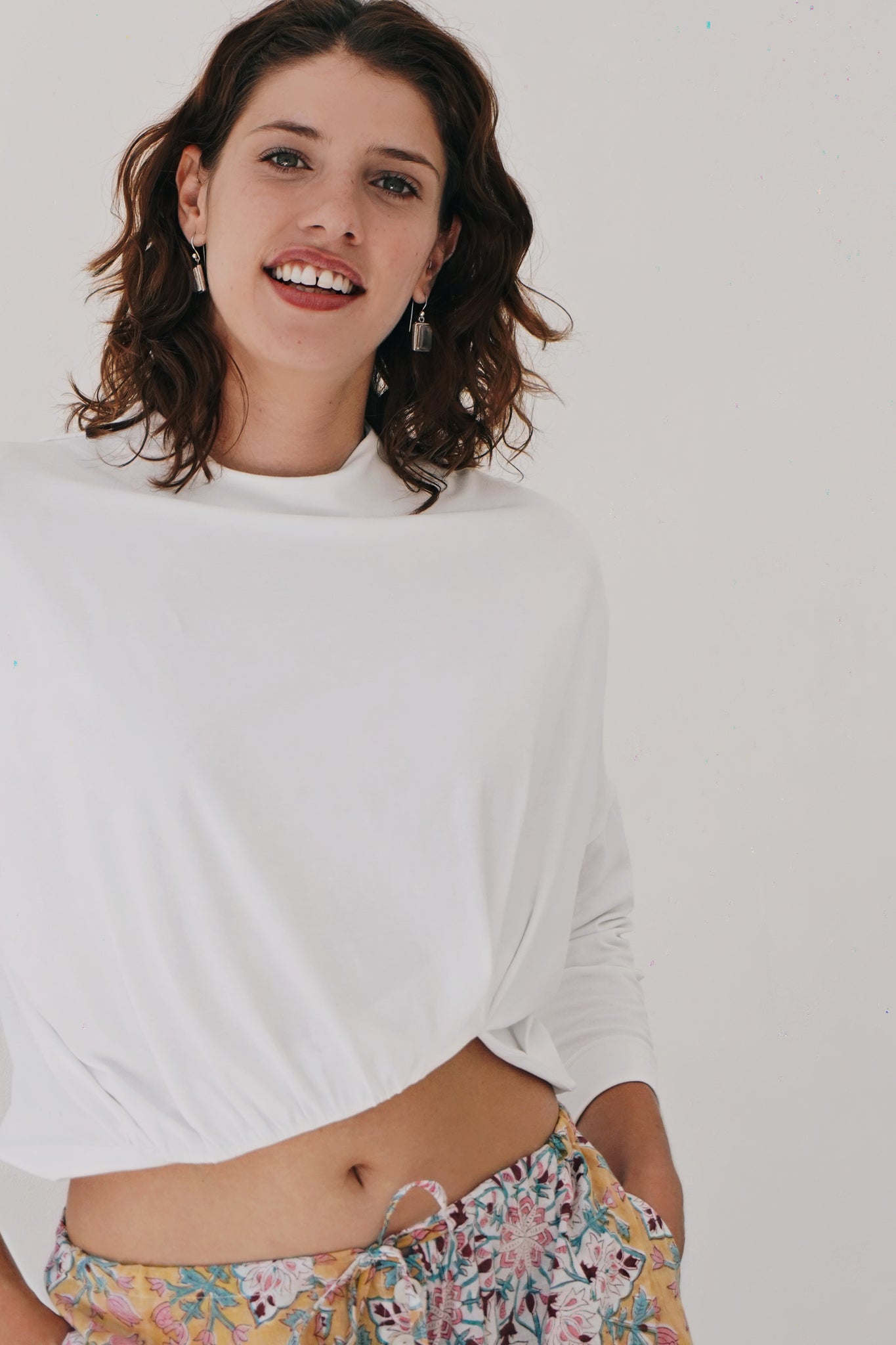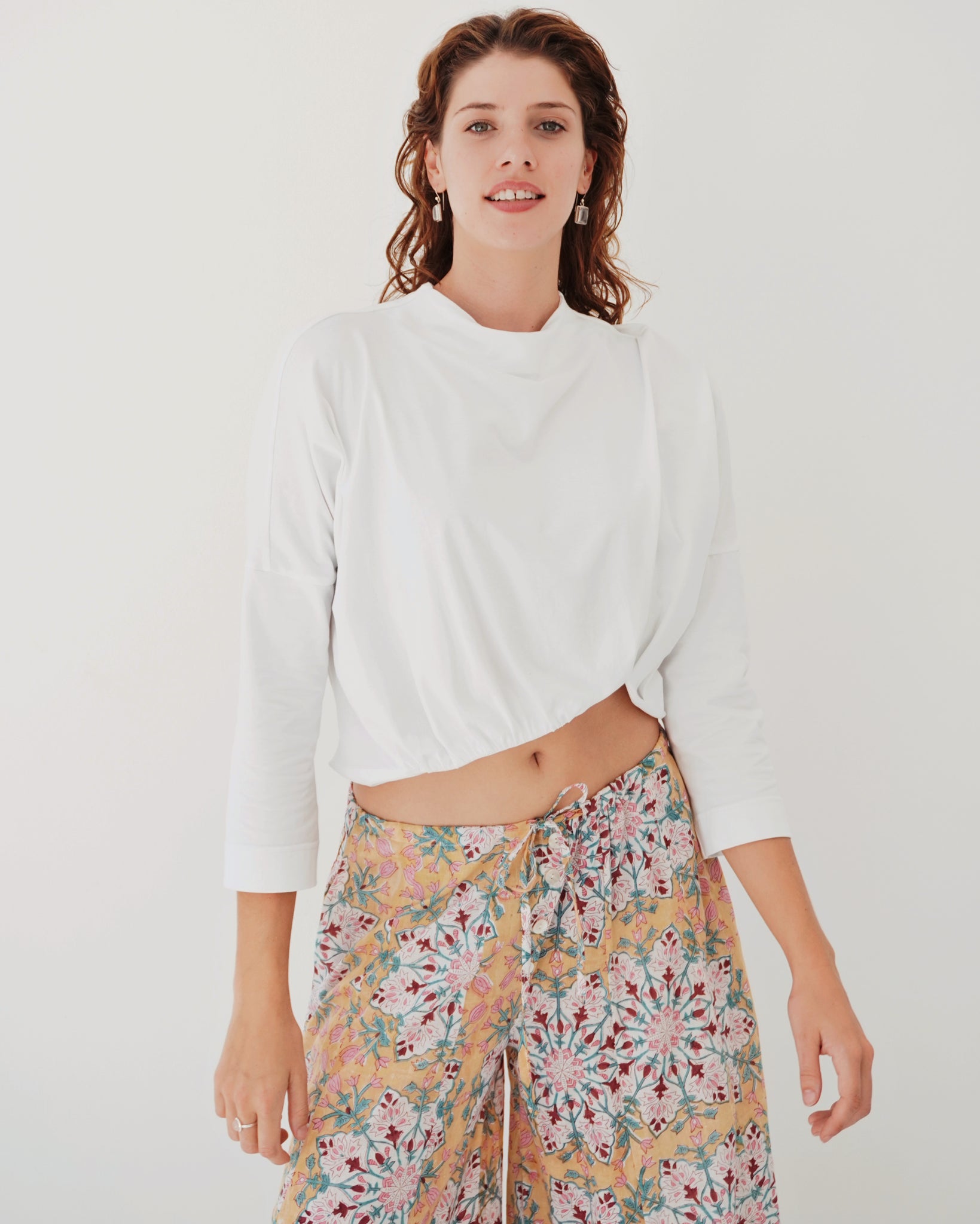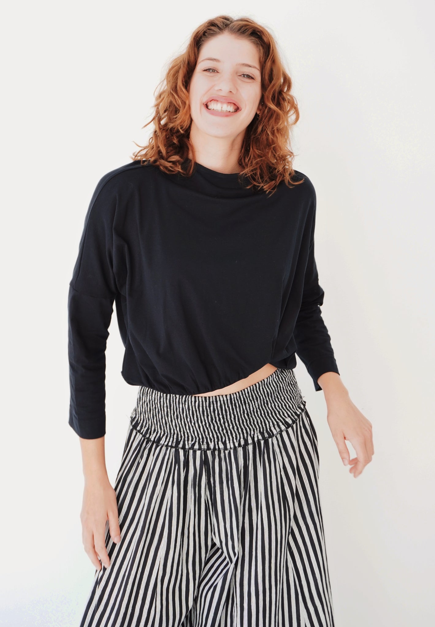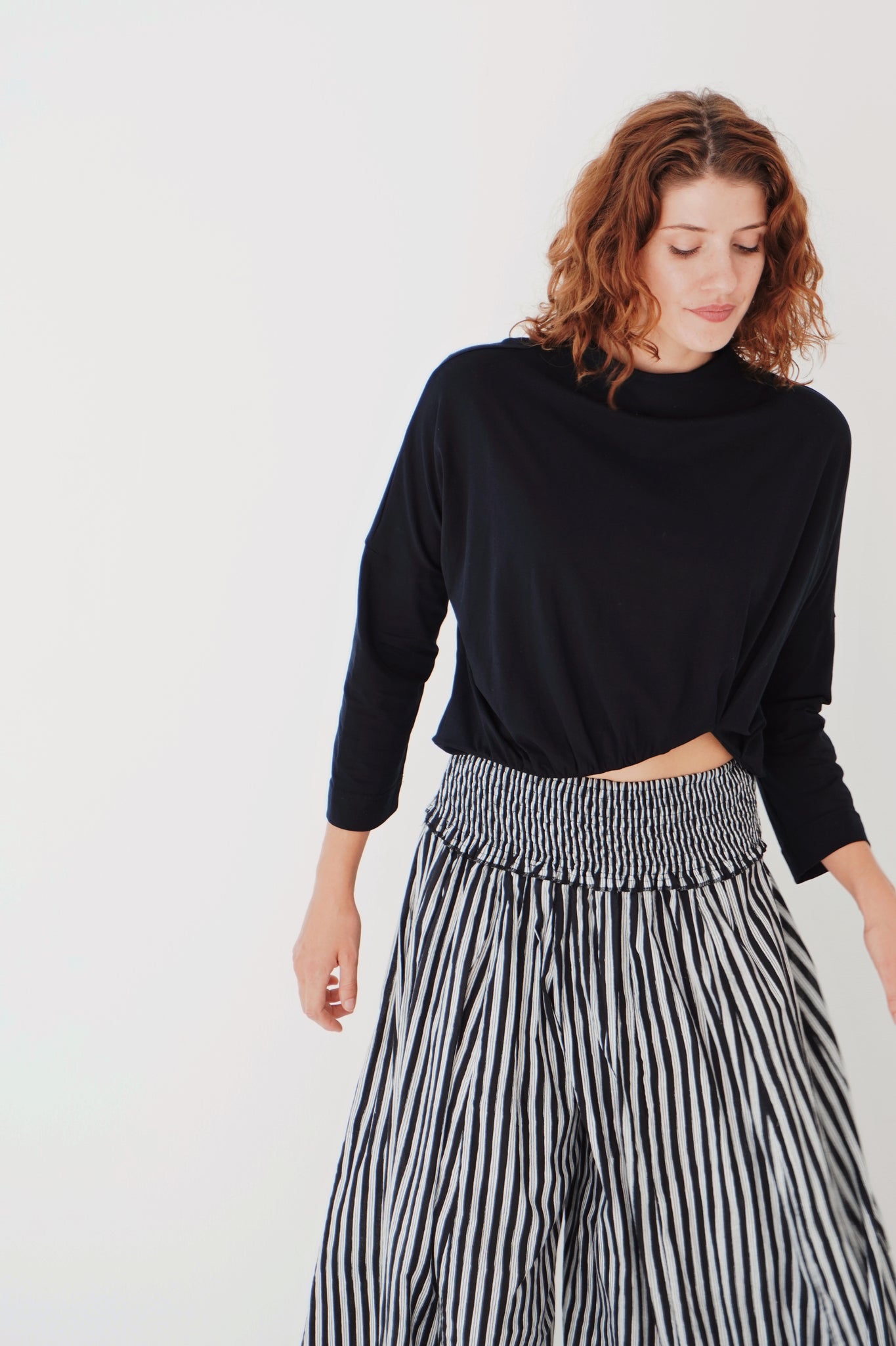 A timeless piece that feels so effortless. Simple but her details really stand out. A fitted rounded neckline, 3/4 sleeves and a straight body. The lower hem holds all the power, with a curved rouged detailing that creates her cropped look. So fun and different! The fabric is luxe.
