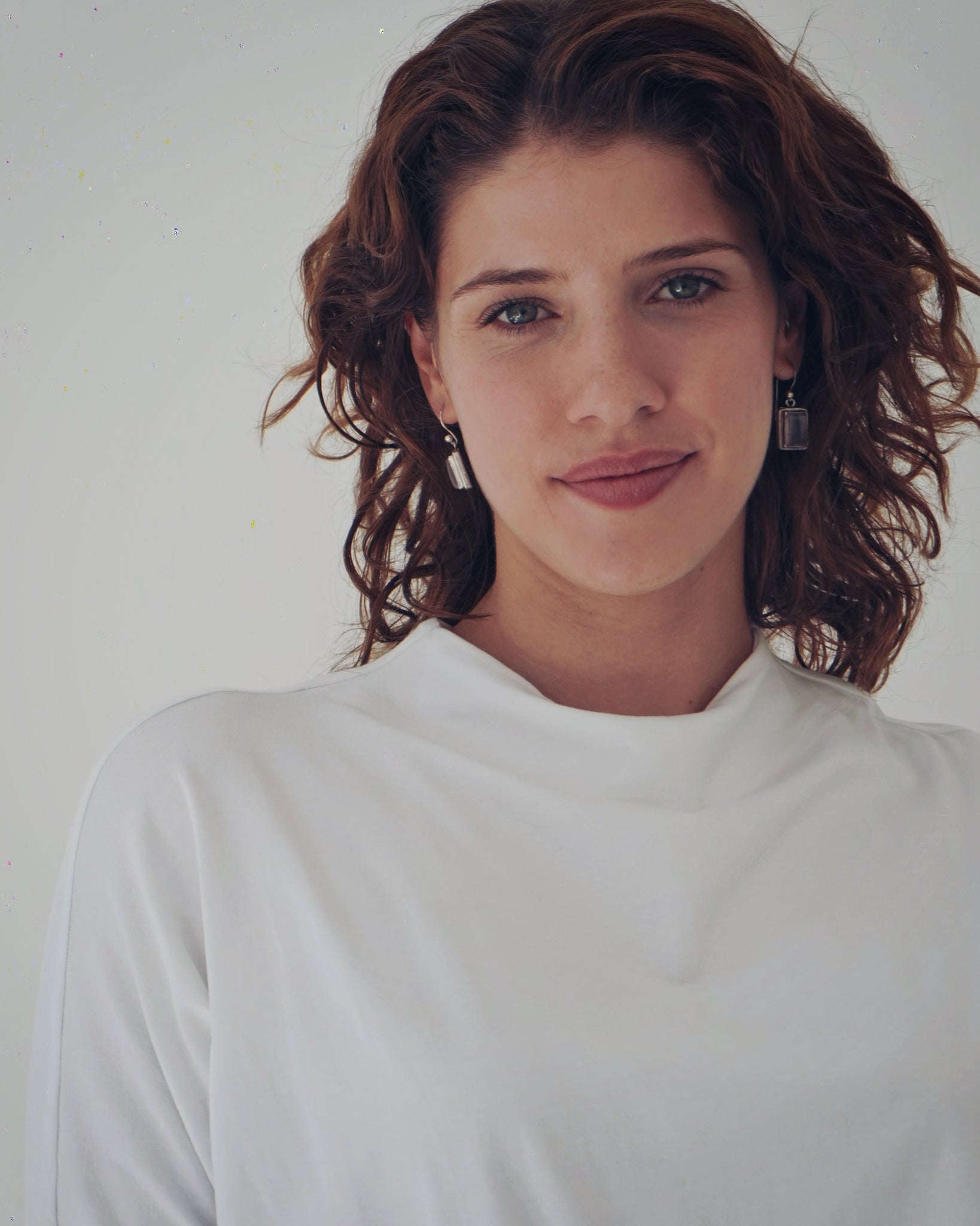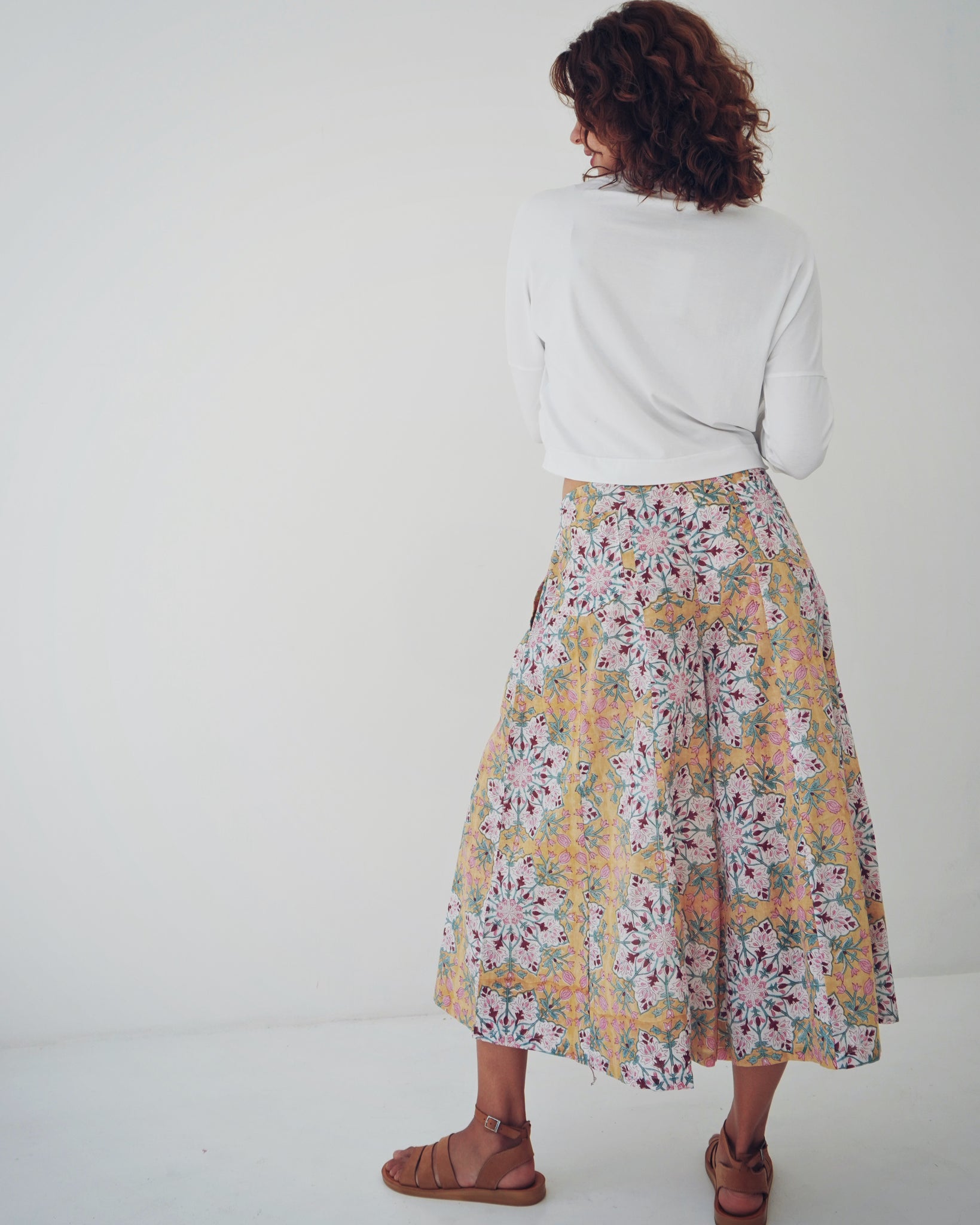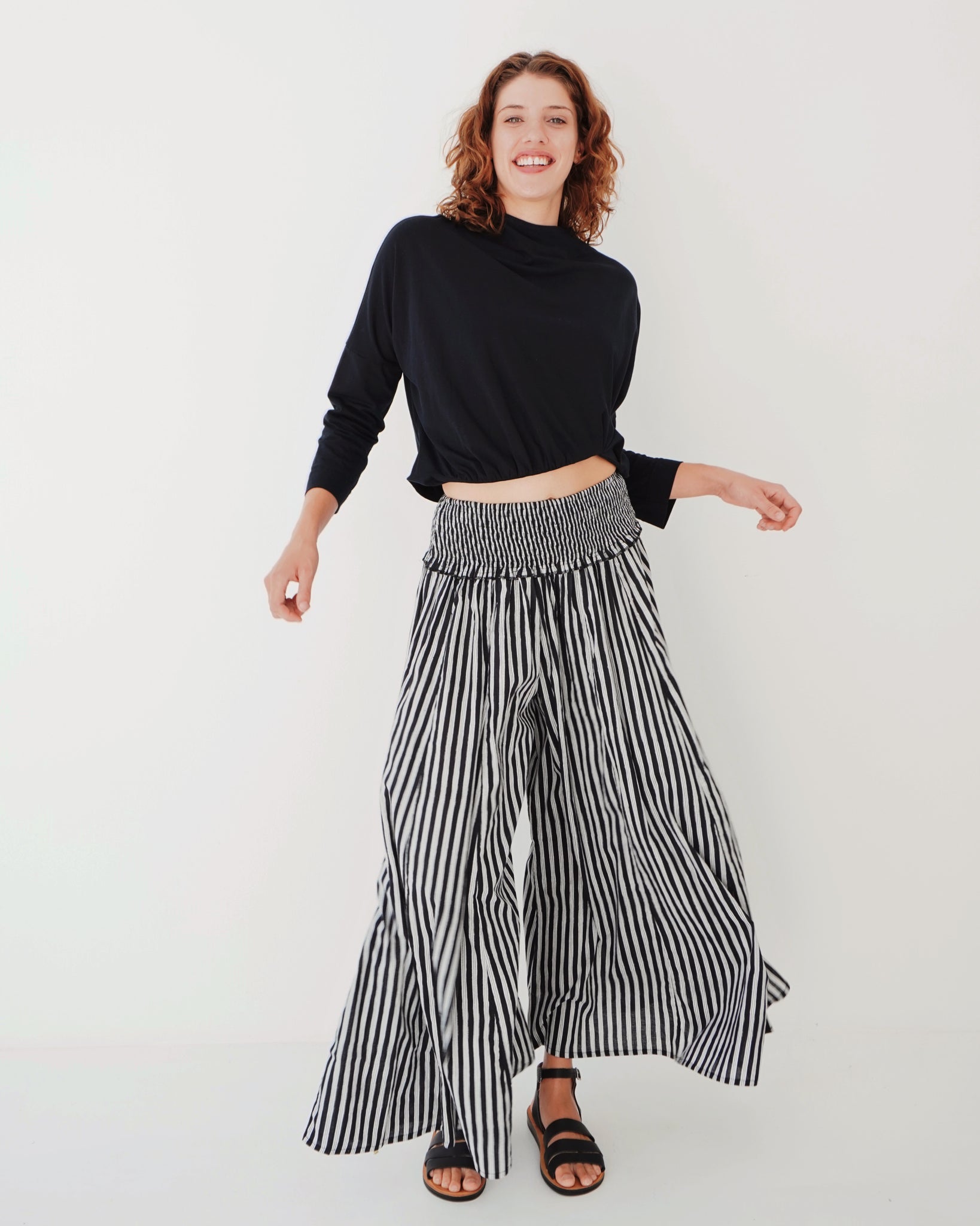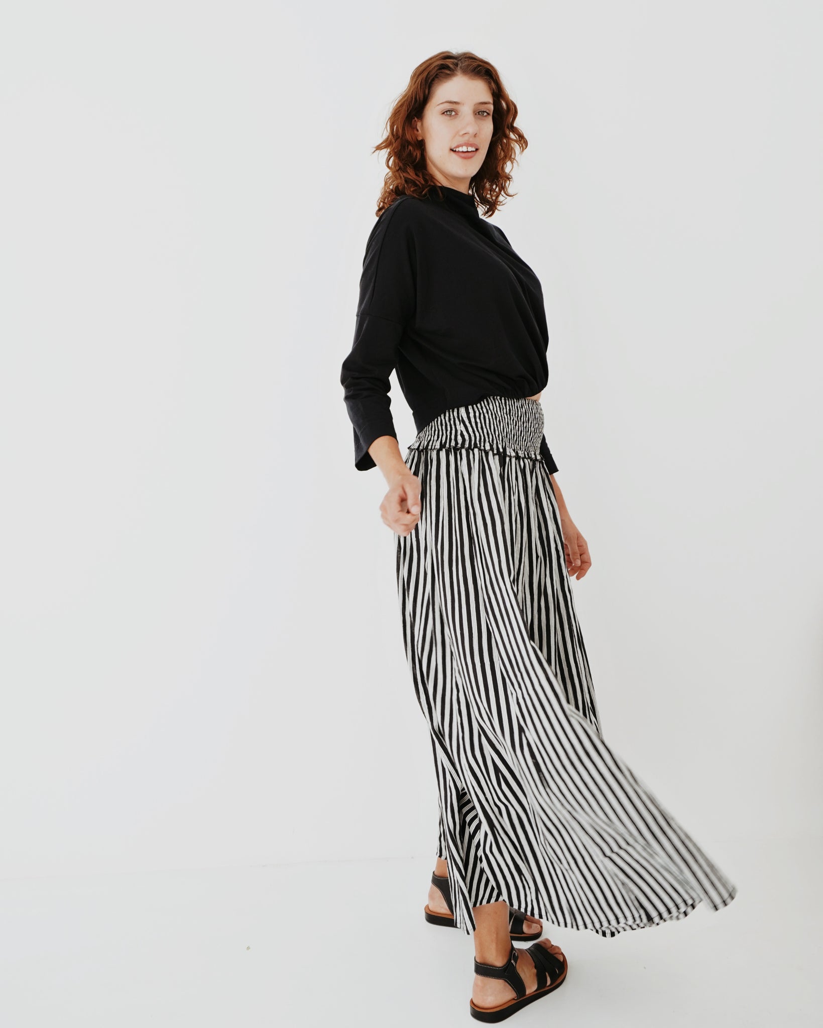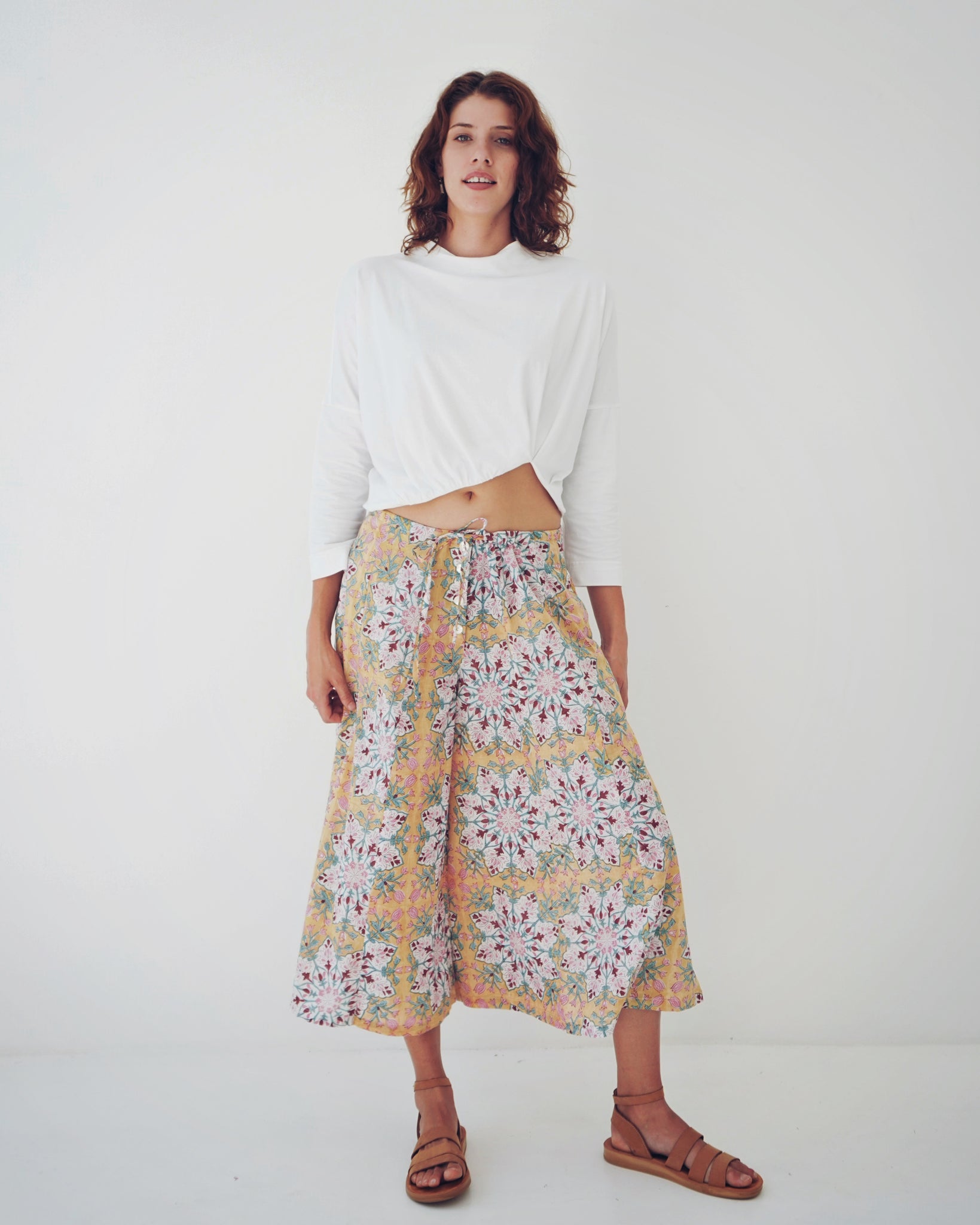 A timeless piece that feels so effortless. Simple but her details really stand out. A fitted rounded neckline, 3/4 sleeves and a straight body. The lower hem holds all the power, with a curved rouged detailing that creates her cropped look. So fun and different! The fabric is luxe.
