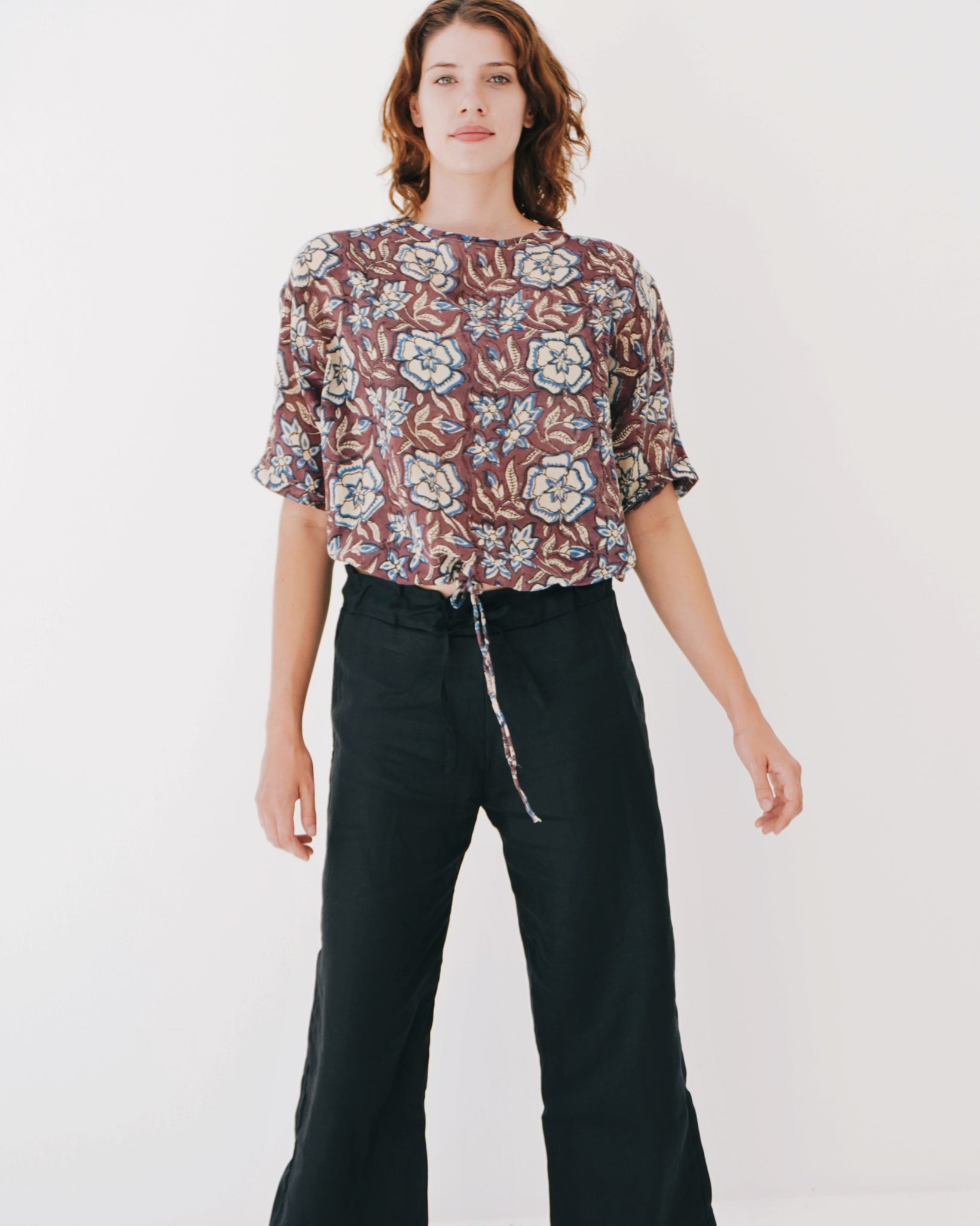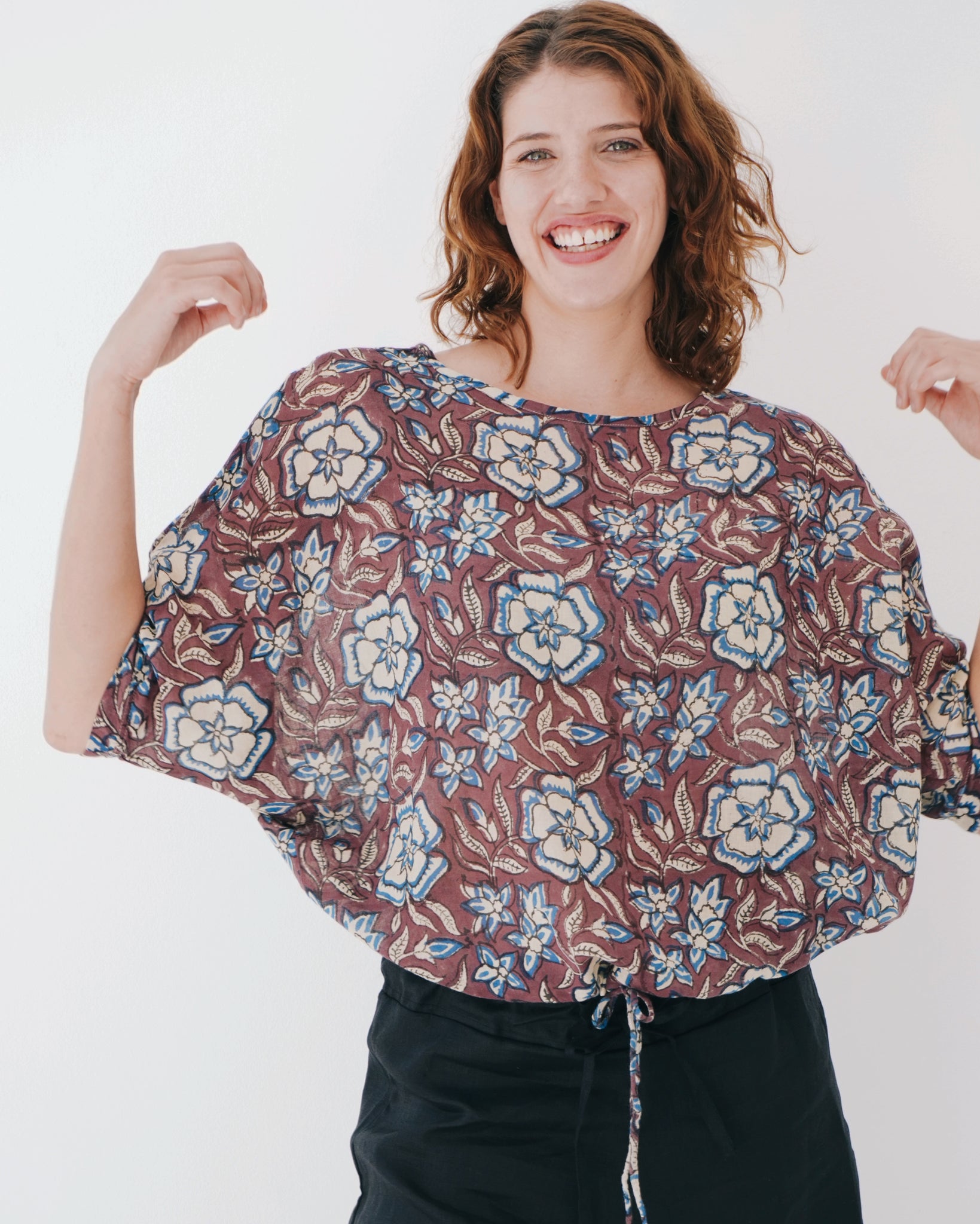 Beauty in simplicity. 100% cotton and an elegant design. A rounded neckline falls into elbow length sleeves, with a slight batwing details. The body is a loose fit, with a drawstring at the hem - great for versatile style whether it be loose or slightly more cropped!