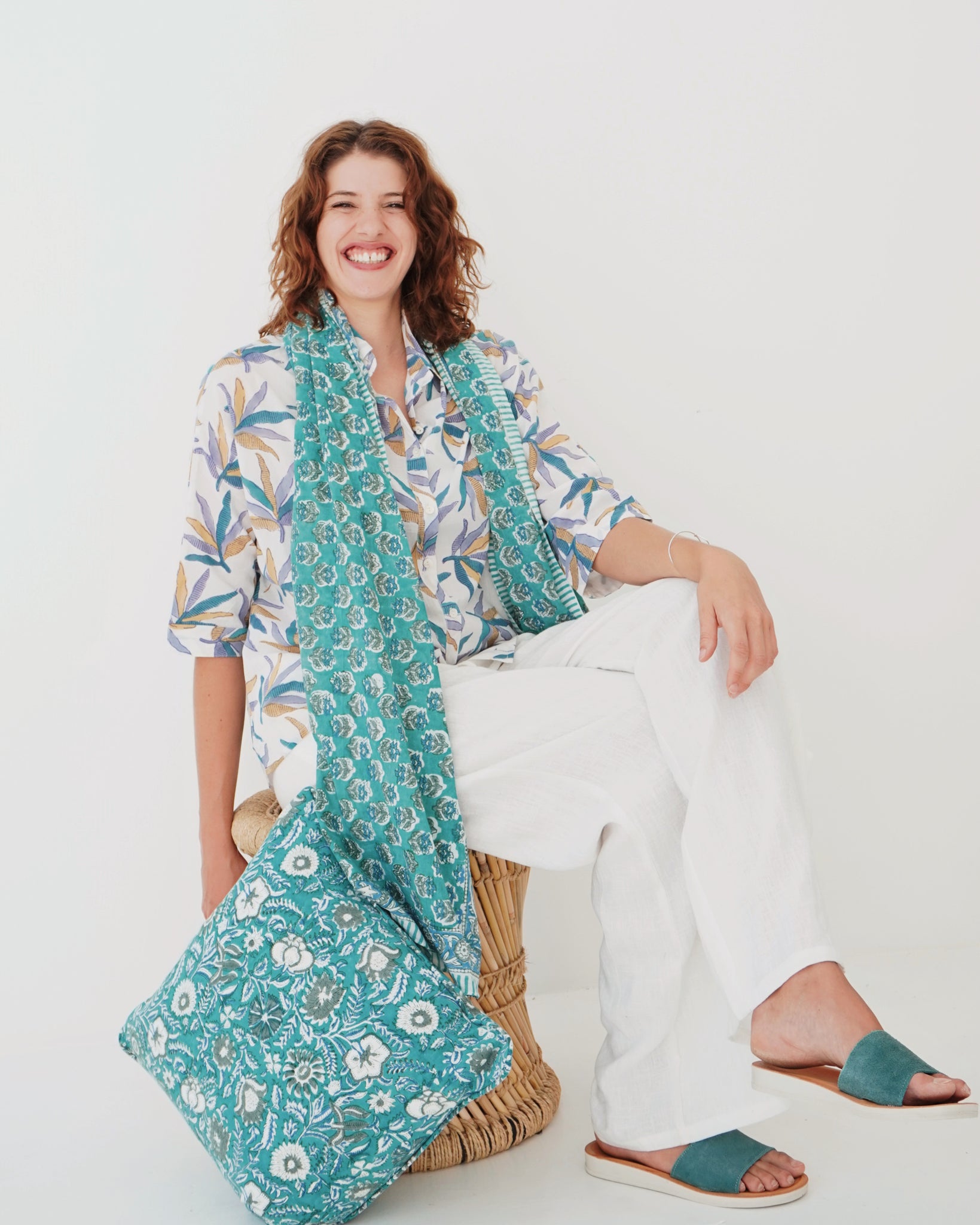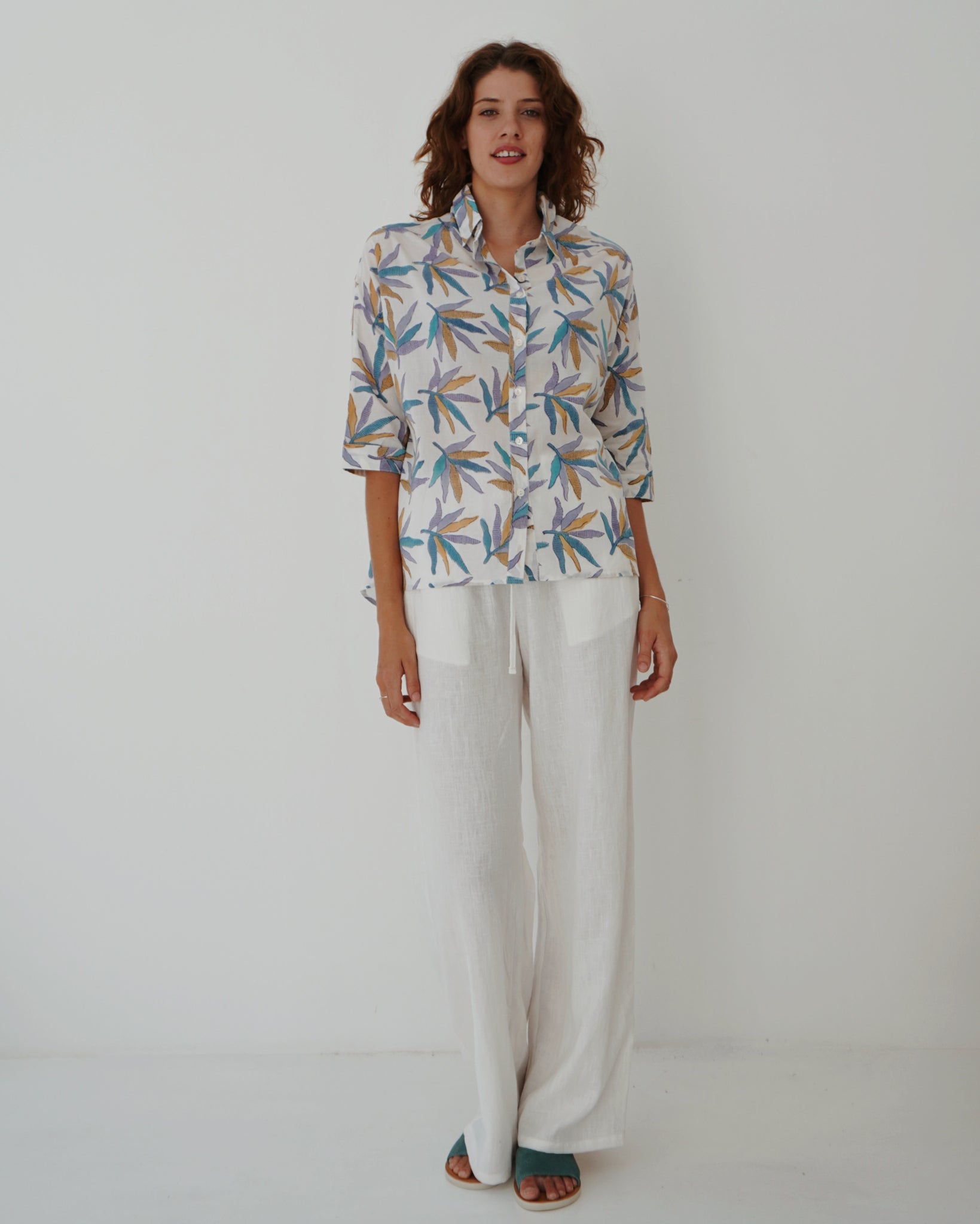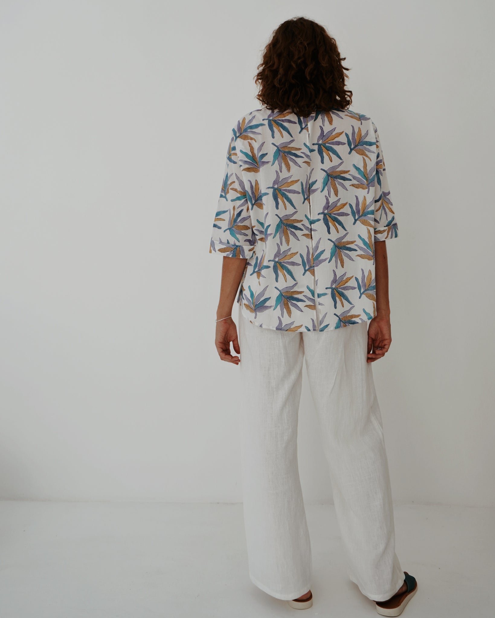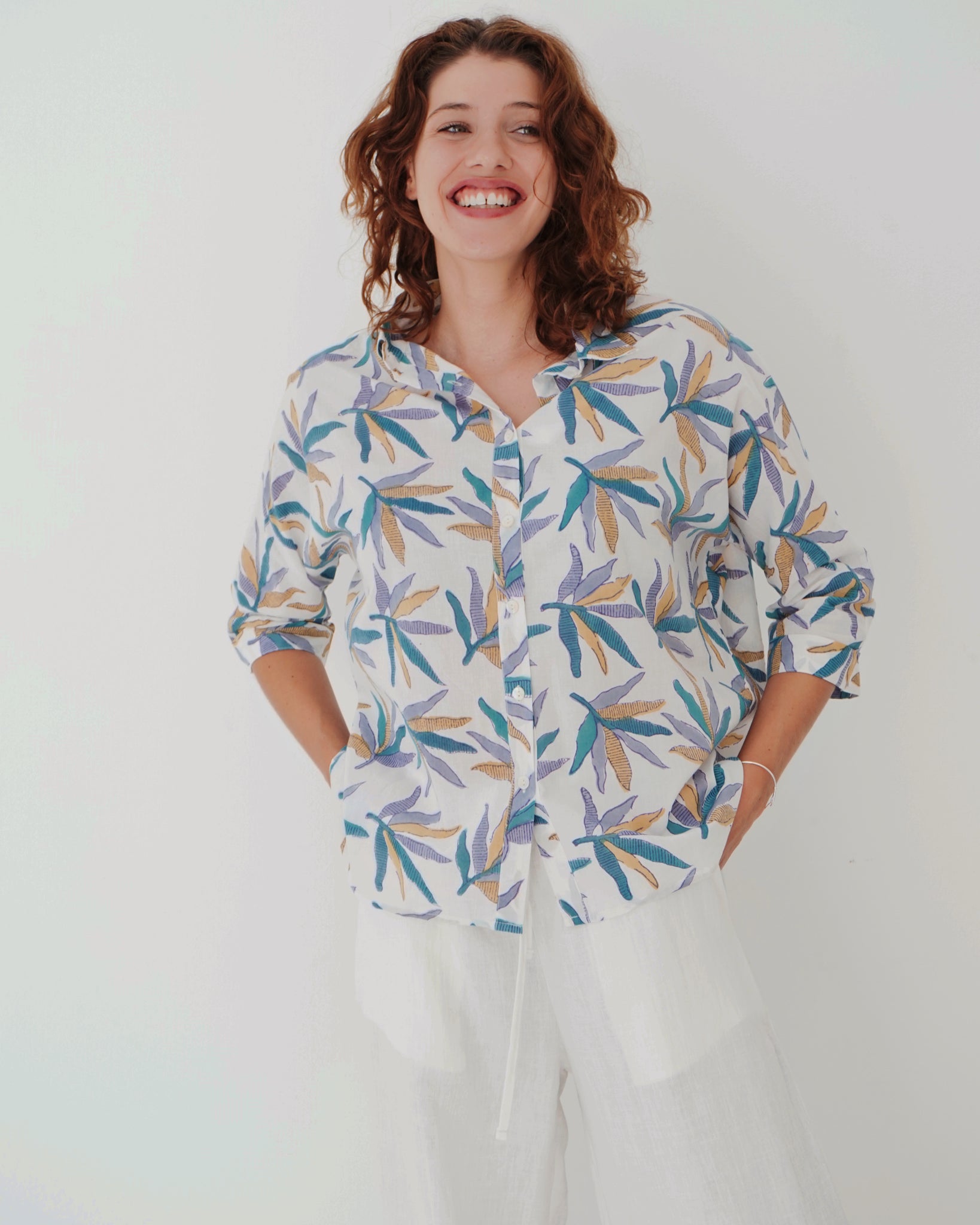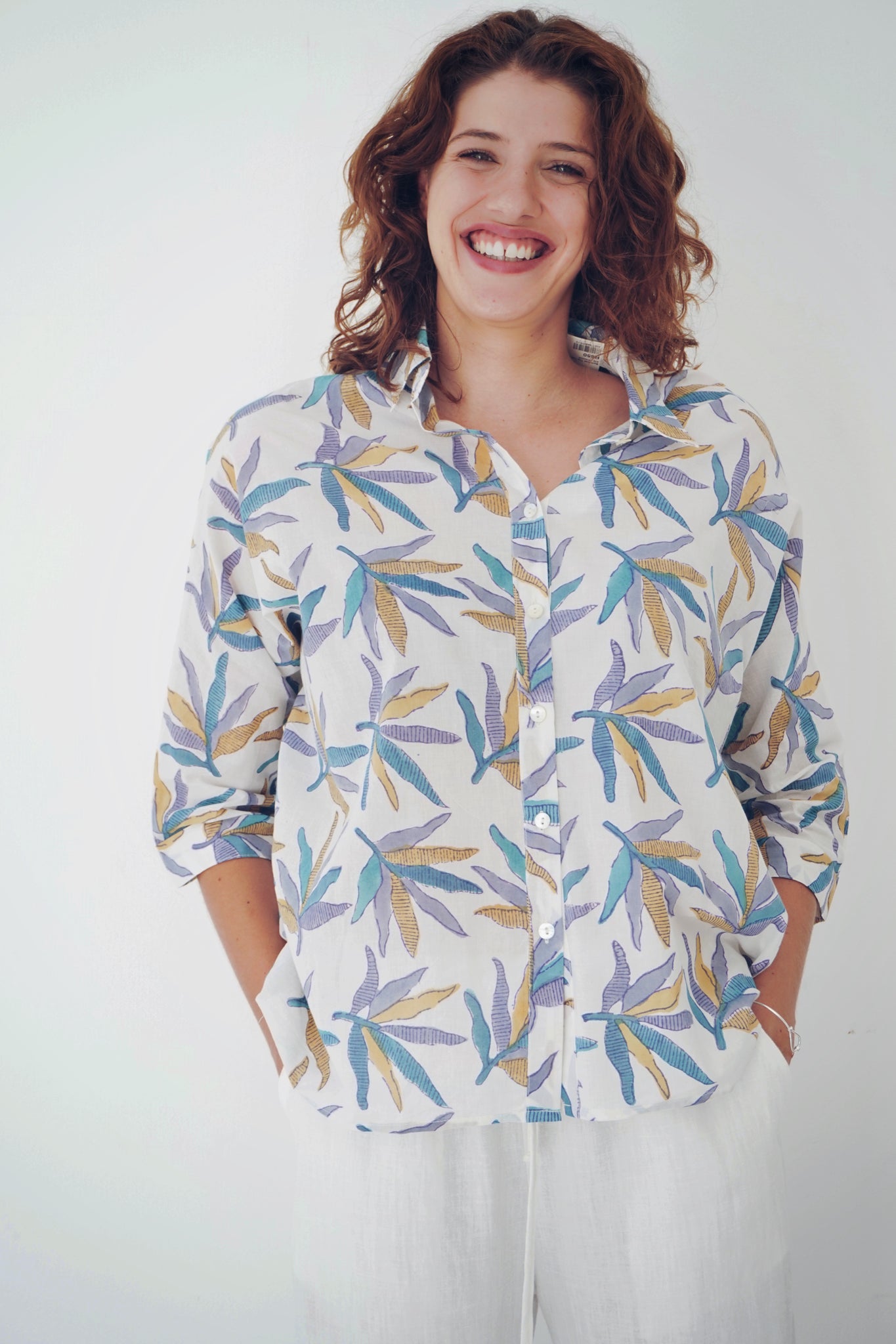 An easy going shirt! Featuring a collar and buttons down the front. The leaves are 3/4 and cuffed, with a slight batwing style. The shirt is slightly longer at the back, with slits down the middle seam to give a subtle open back detail. An effortless look, perfect to keep the sun off, or add to some layering! 100% cotton and hand printed.
