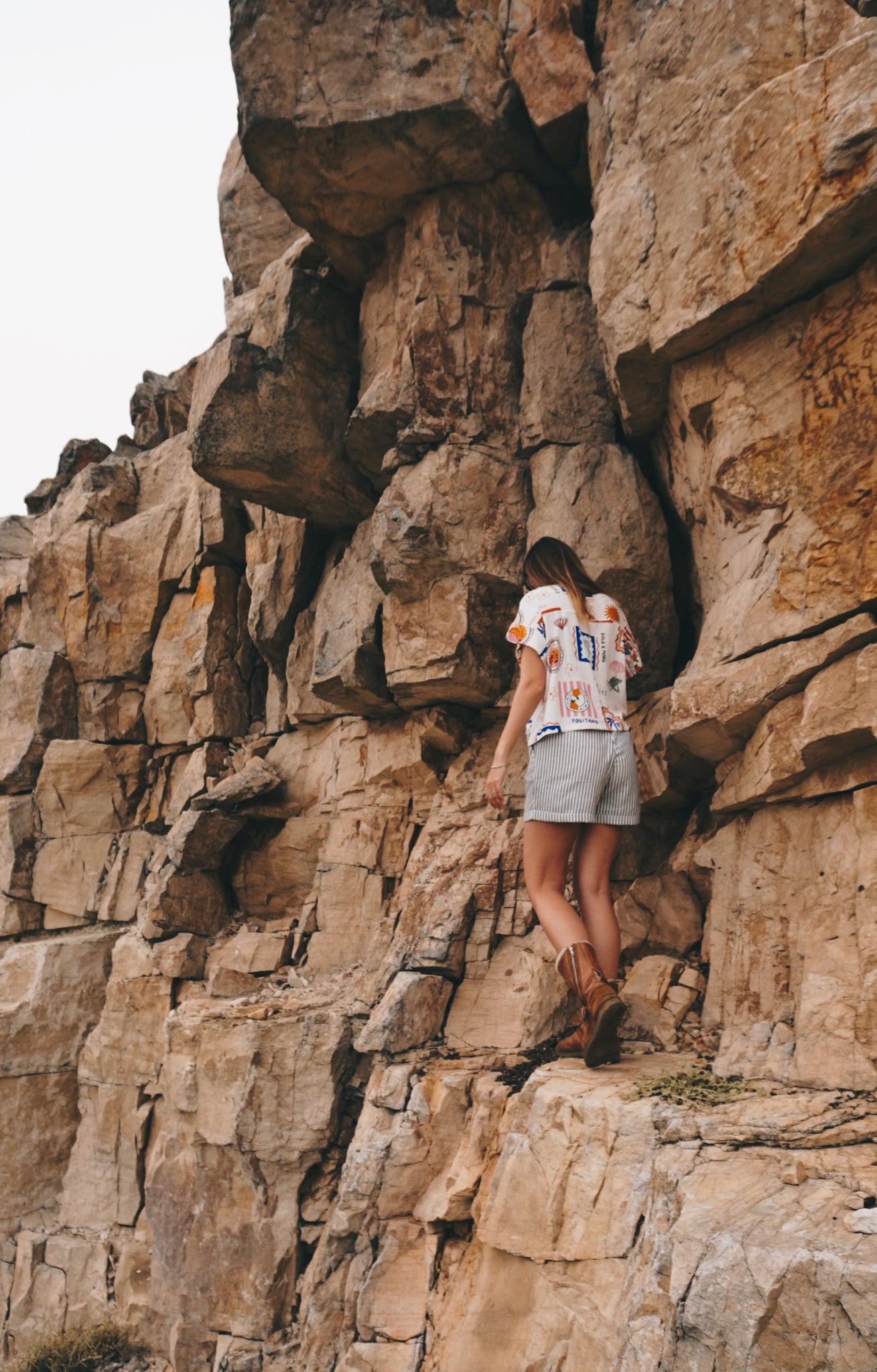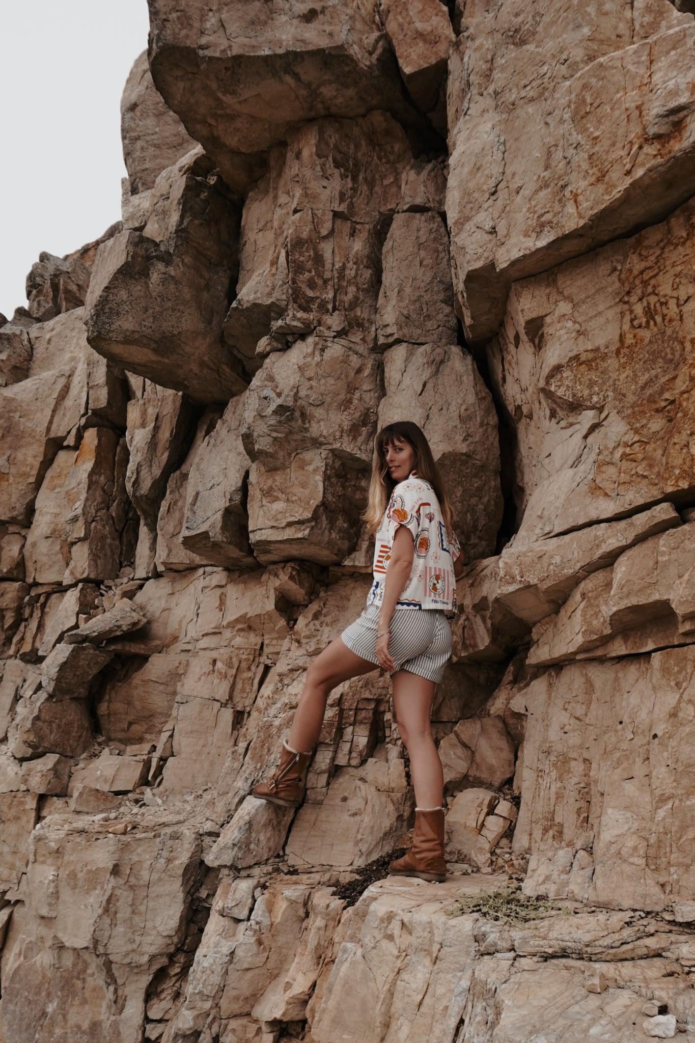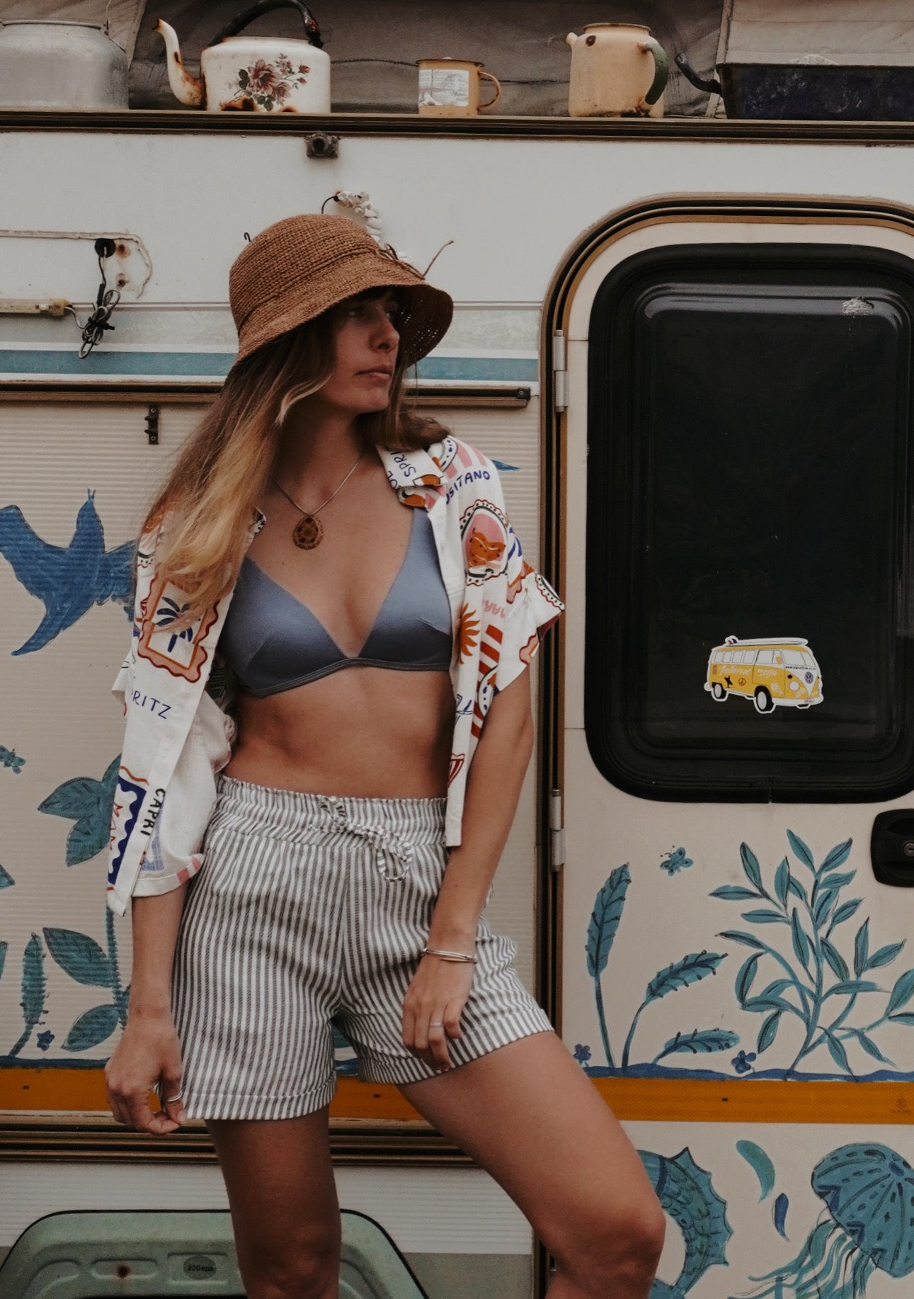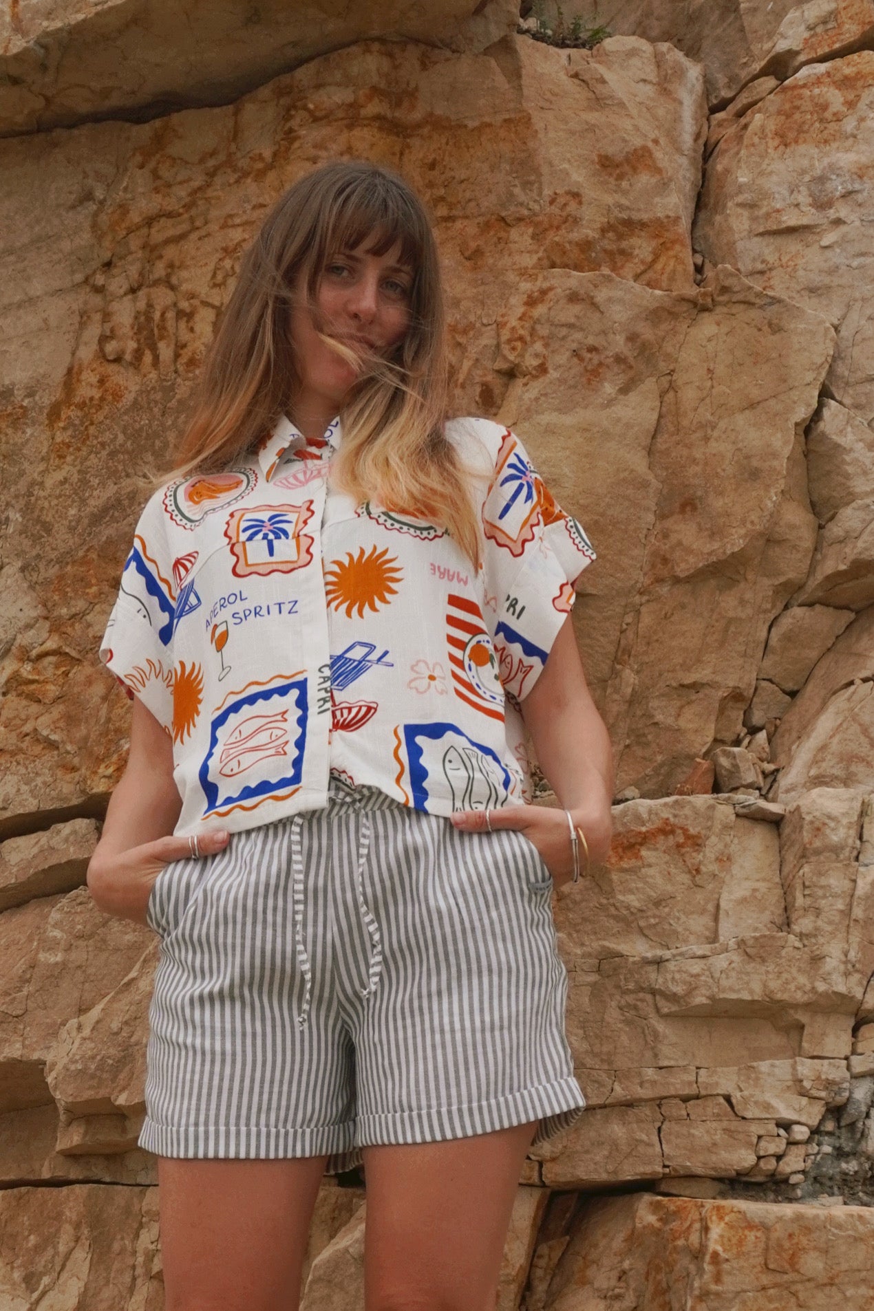 A fun little number that is all about that summer feel. 100% linen and just gorgeous on the skin! A simple cut, with a relaxed collar, buttons down the front (wear open or closed). The tailoring adds structure to the relaxed feel, with a boxy ever so slightly cropped look. The sleeves are slightly capped and cuffed, with a subtle pin tuck on the back adding extra movement to an easy fall. The print shines, a vintage mediterranean style illustrations in warm tones. All in all, 10/10 - you won't stop wearing it!