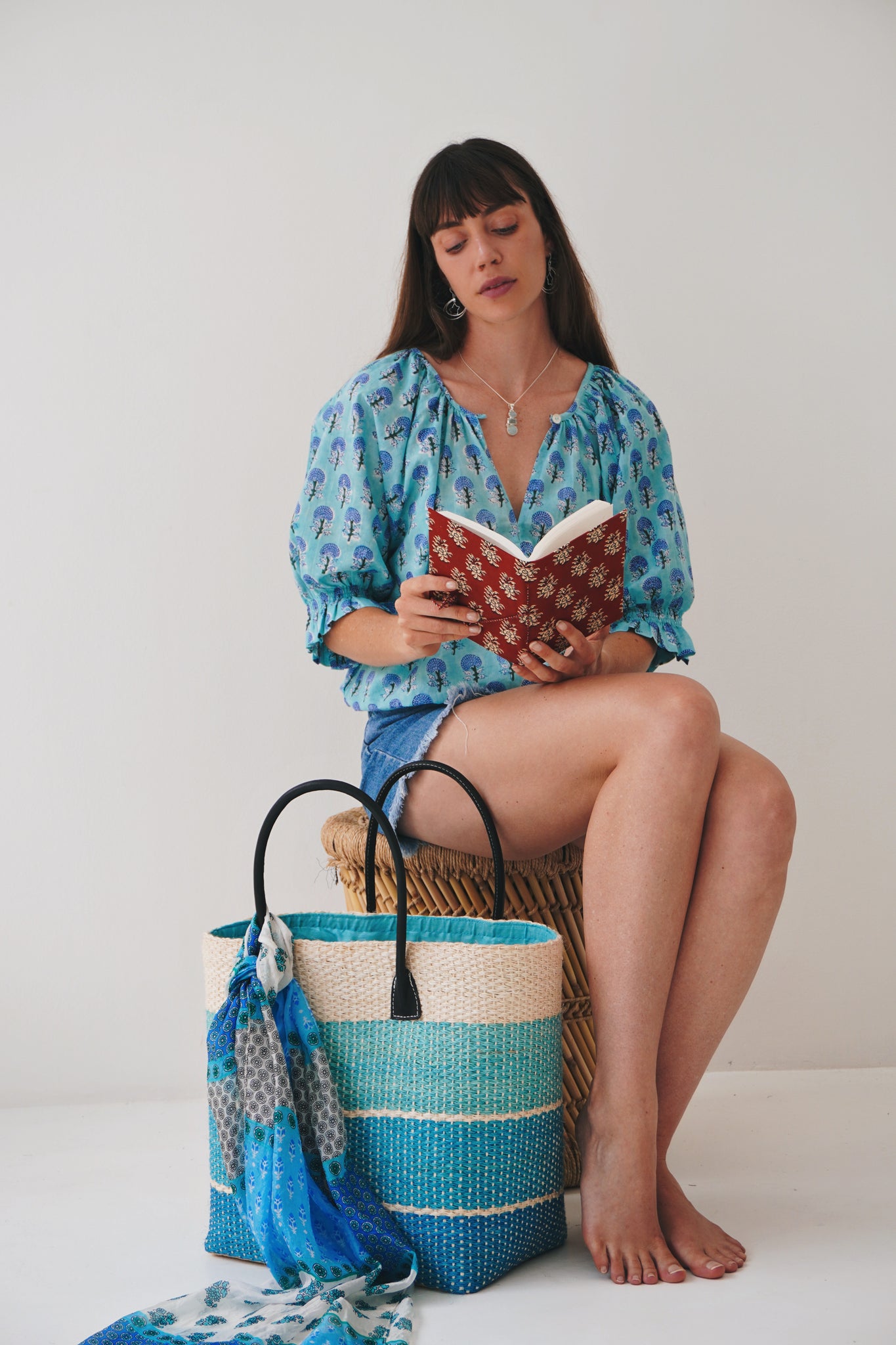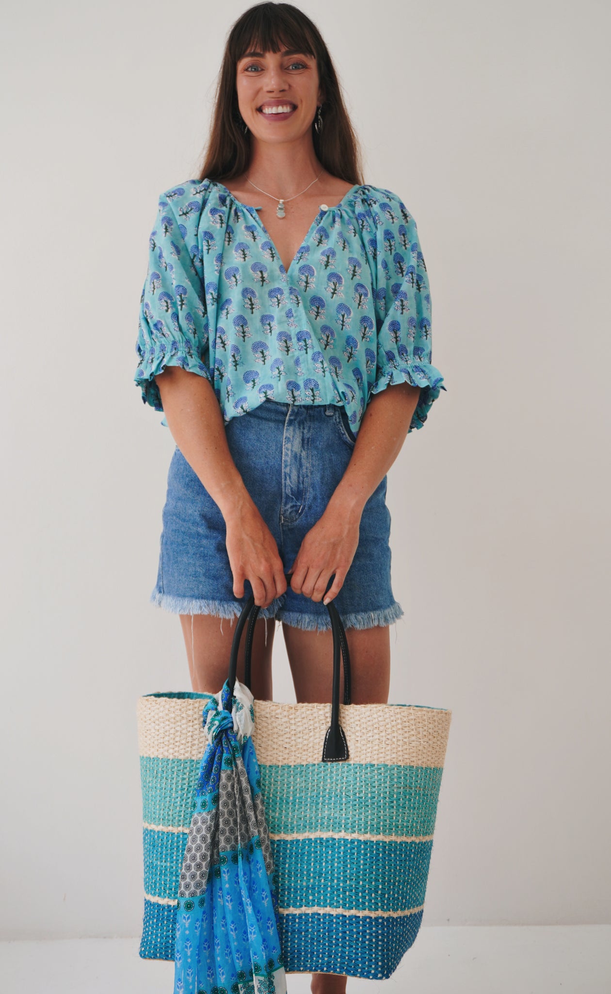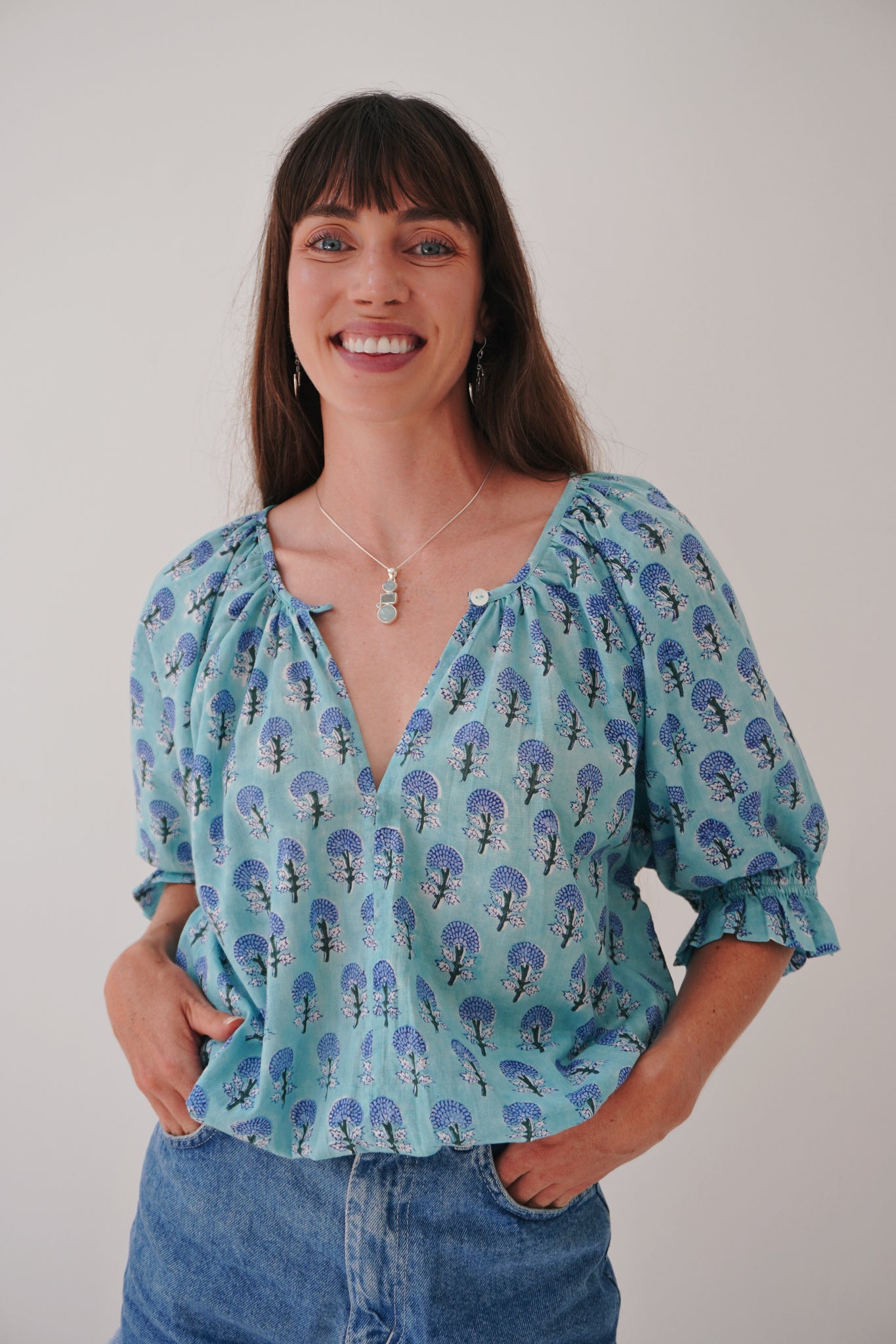A piece designed for romance. Featuring a rounded neckline with gentle pleating, a small pearly button allows for styling options: a closed round neck, or an open v-neckline. They give quite different feelings, handy for styling different looks. The sleeves have a generous volume, and then are cuffed with elastic and a muted ruffle. The body follows the same flow, with volume, and then an elasticated waist line- this can be worn low, or brought up to crop (the versatility of this top!). It's gentle and soft, in two exceptionally stunning prints!