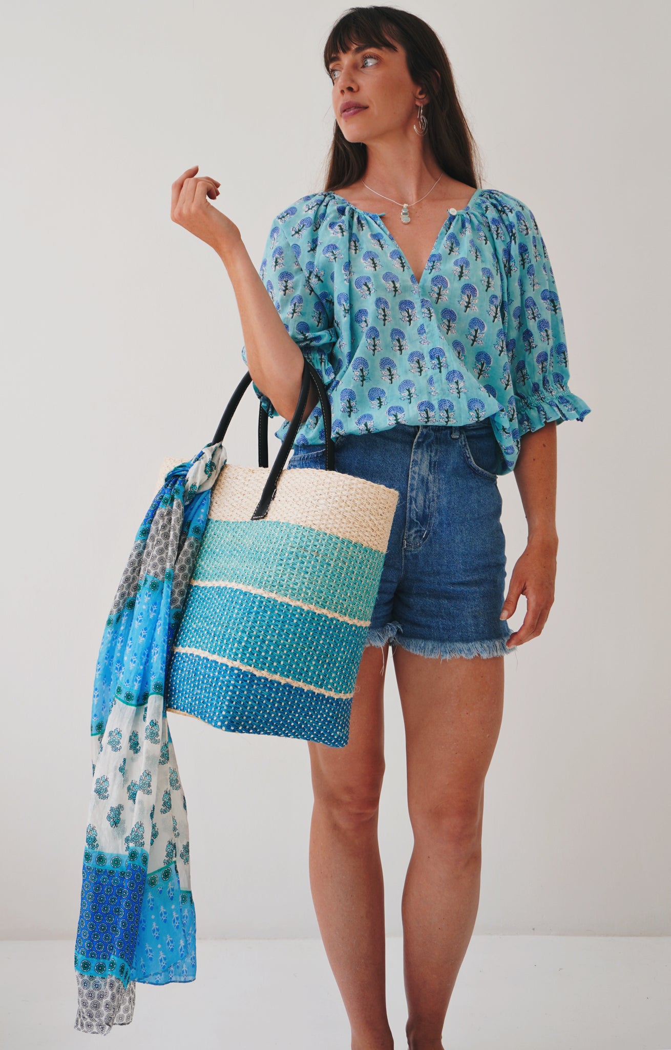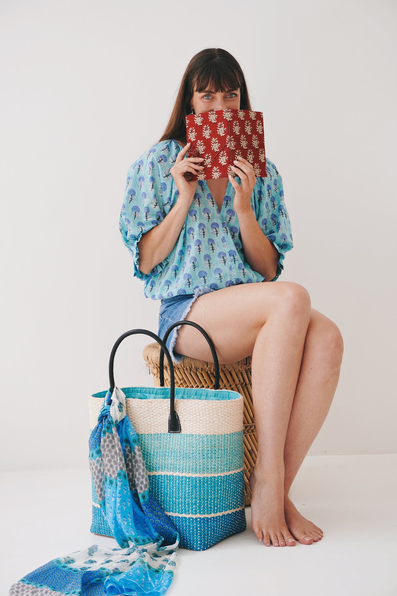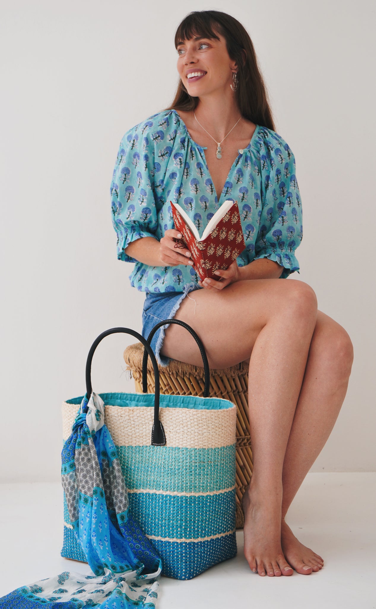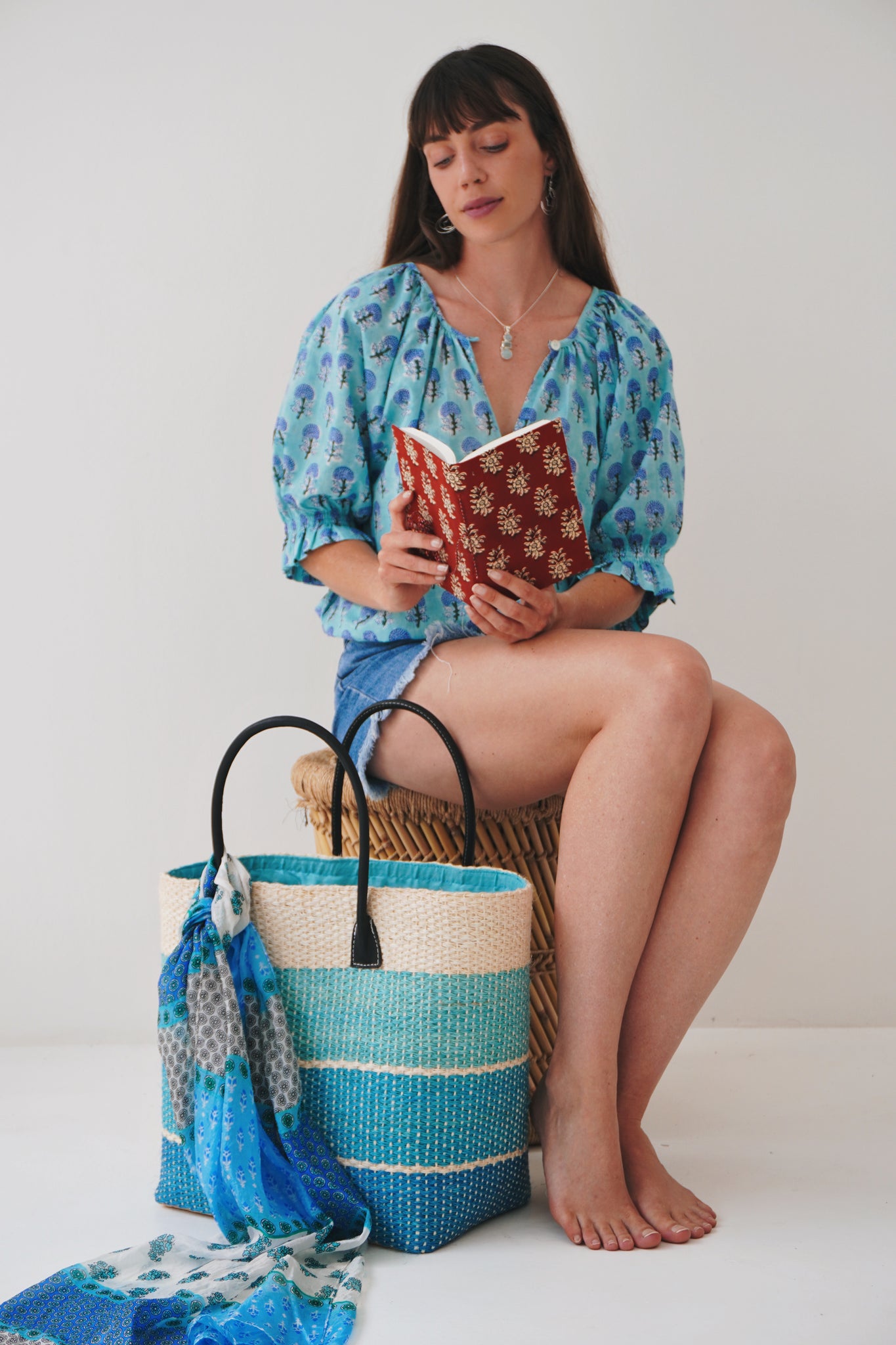 A piece designed for romance. Featuring a rounded neckline with gentle pleating, a small pearly button allows for styling options: a closed round neck, or an open v-neckline. They give quite different feelings, handy for styling different looks. The sleeves have a generous volume, and then are cuffed with elastic and a muted ruffle. The body follows the same flow, with volume, and then an elasticated waist line- this can be worn low, or brought up to crop (the versatility of this top!). It's gentle and soft, in two exceptionally stunning prints!