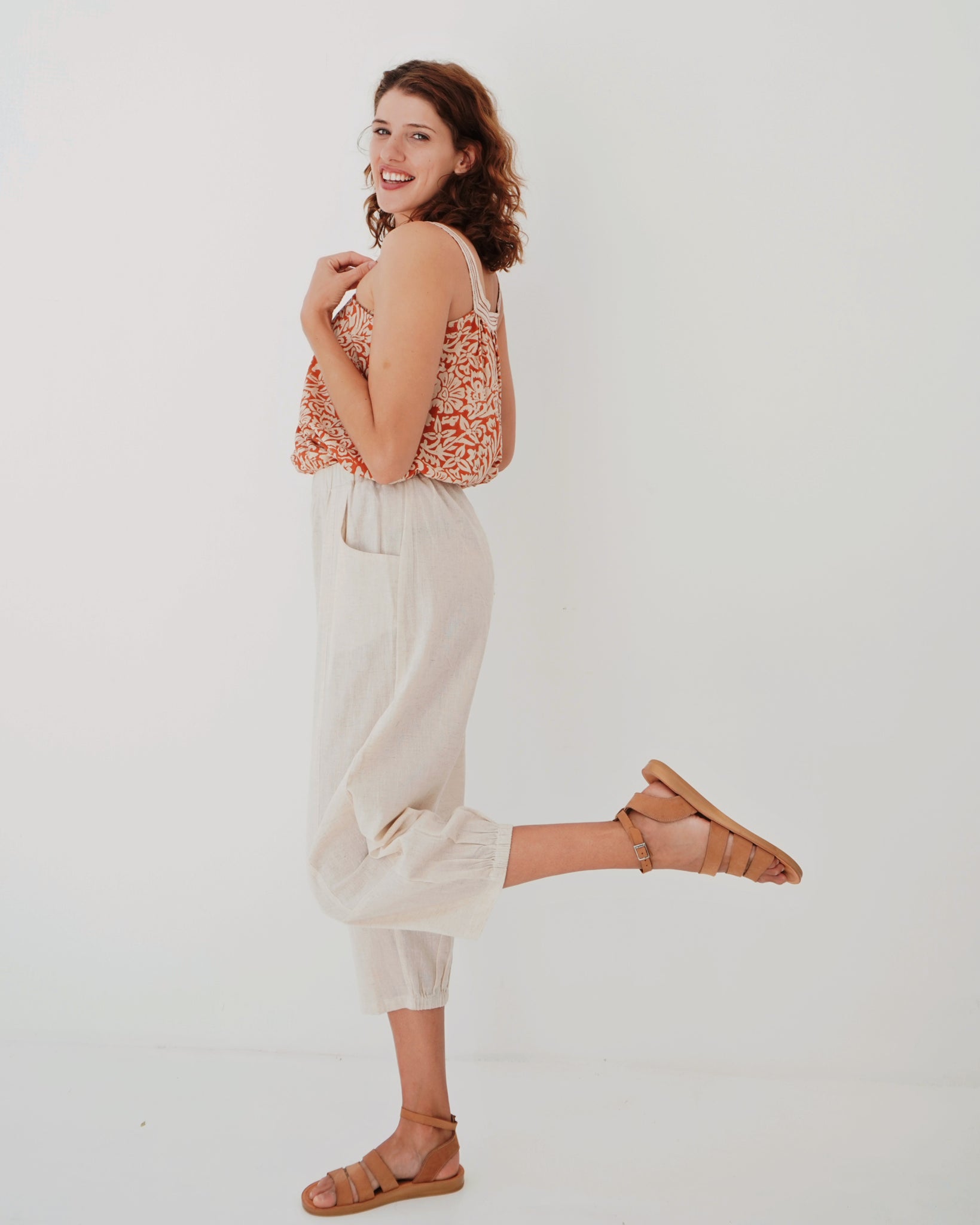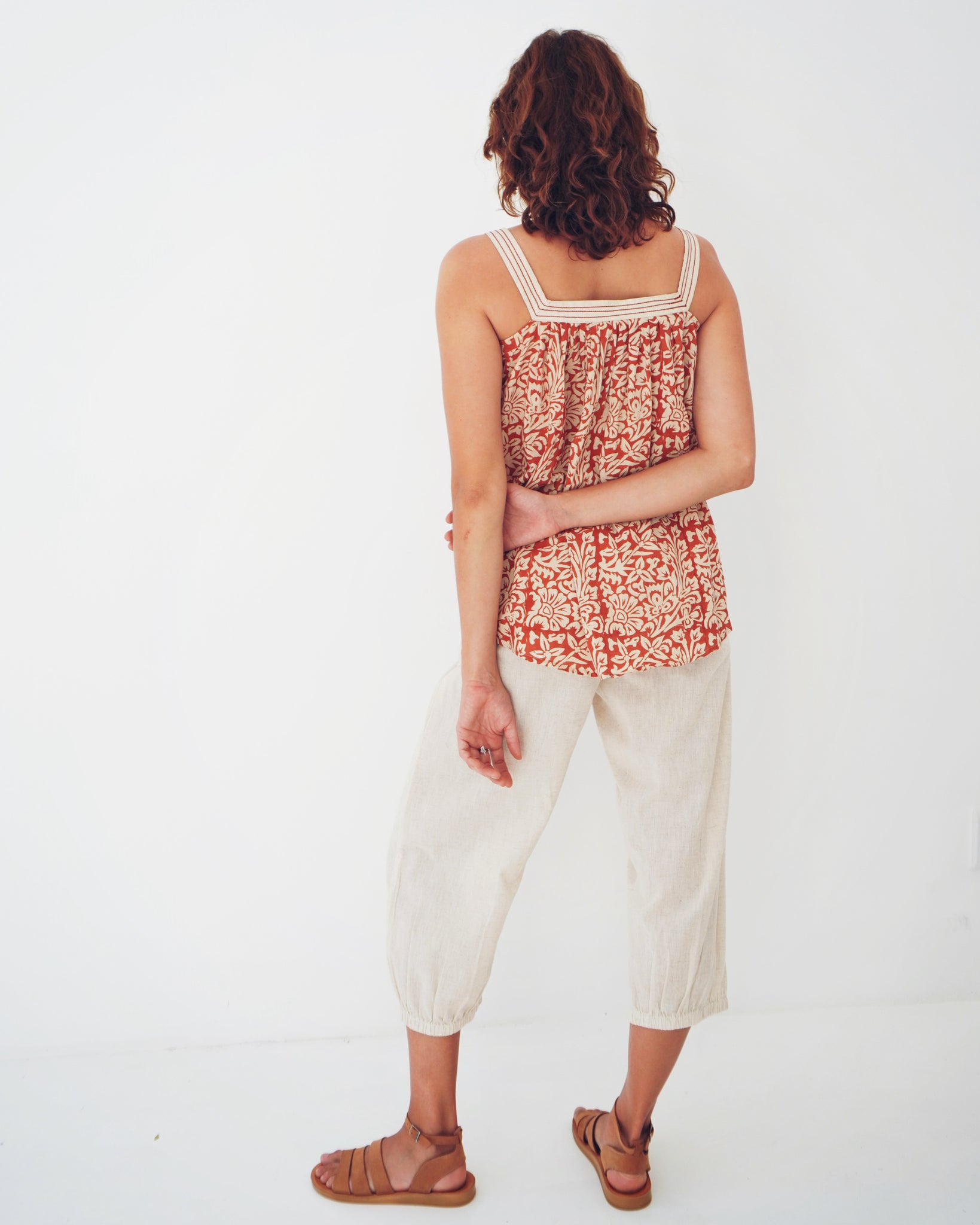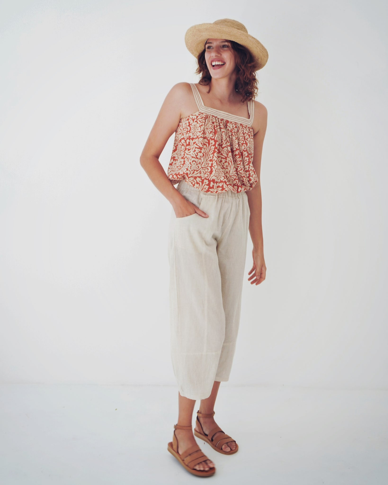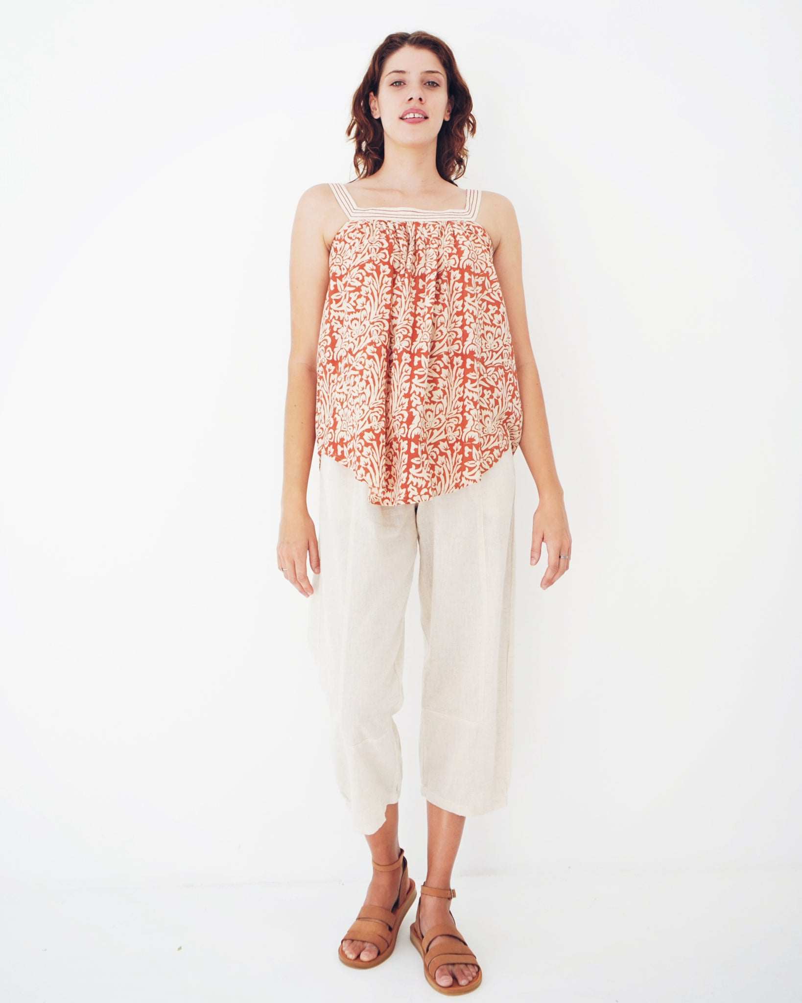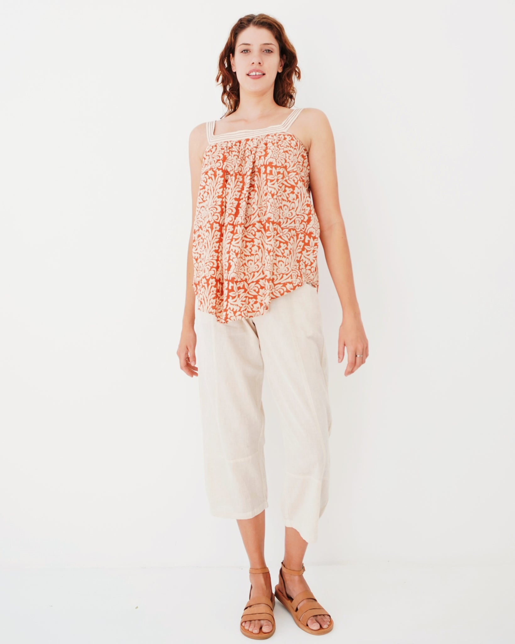 A sassy little number! The square neckline is a lovely modern detail, it is accentuated as it is an alternative print. The neckline then falls with subtle pleating into a loose fit body, the bottom hemline has a gentle v-curve which adds movement to this top. Hand printed on 100% cotton, have fresh yet earthy feel. Sizes run a little large, but the style is free and flowy!