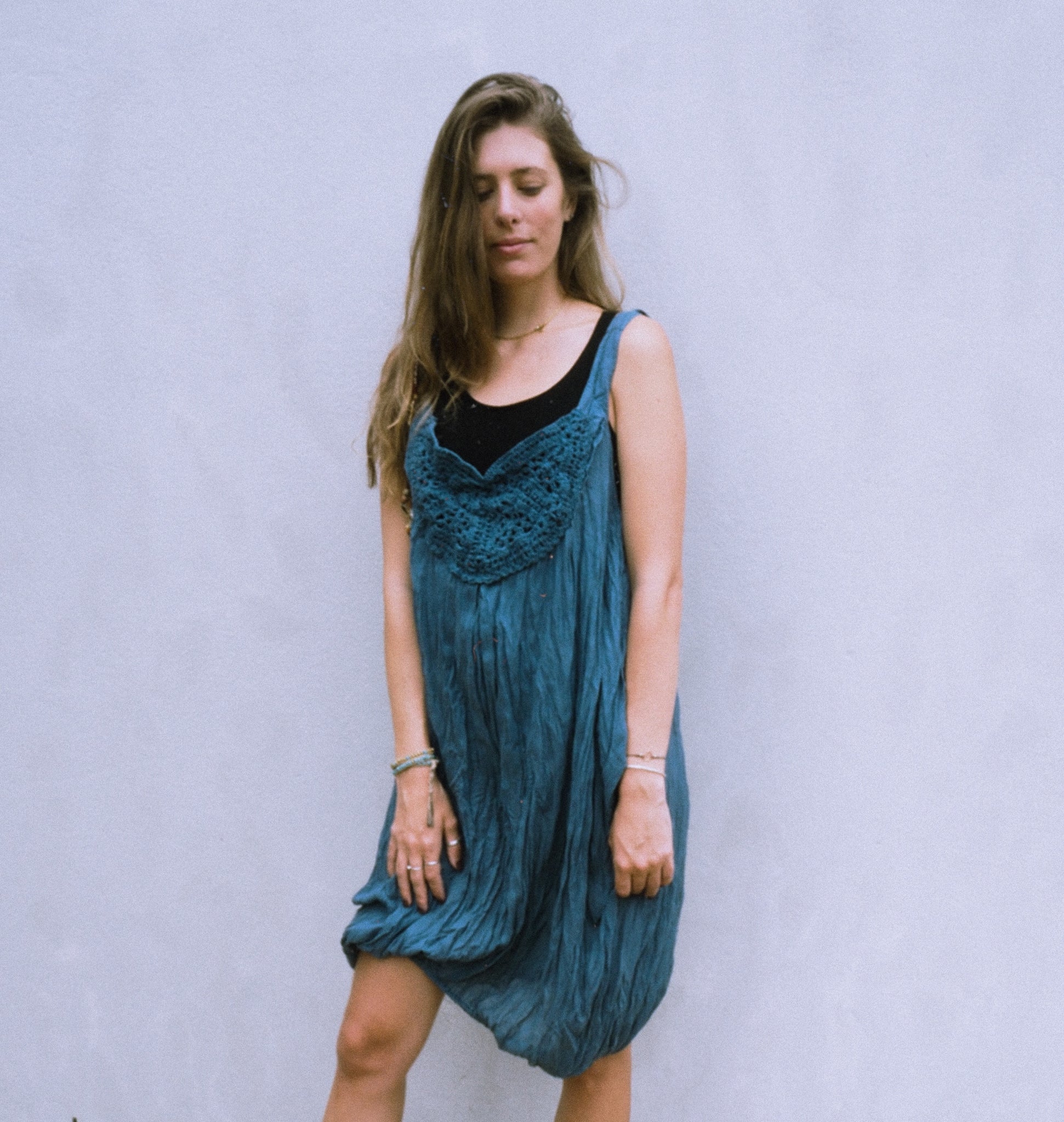 100% crinkle cotton, in a divine sea-blue shade. Beautiful crotchet on an open neckline; sleeveless with an interesting winged detail and two buttons securing the armholes. This unusual dress has an elasticated hemline, giving it a bubble feel.