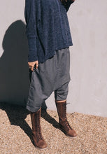 Chambray pants with drop crotch and fold detail.