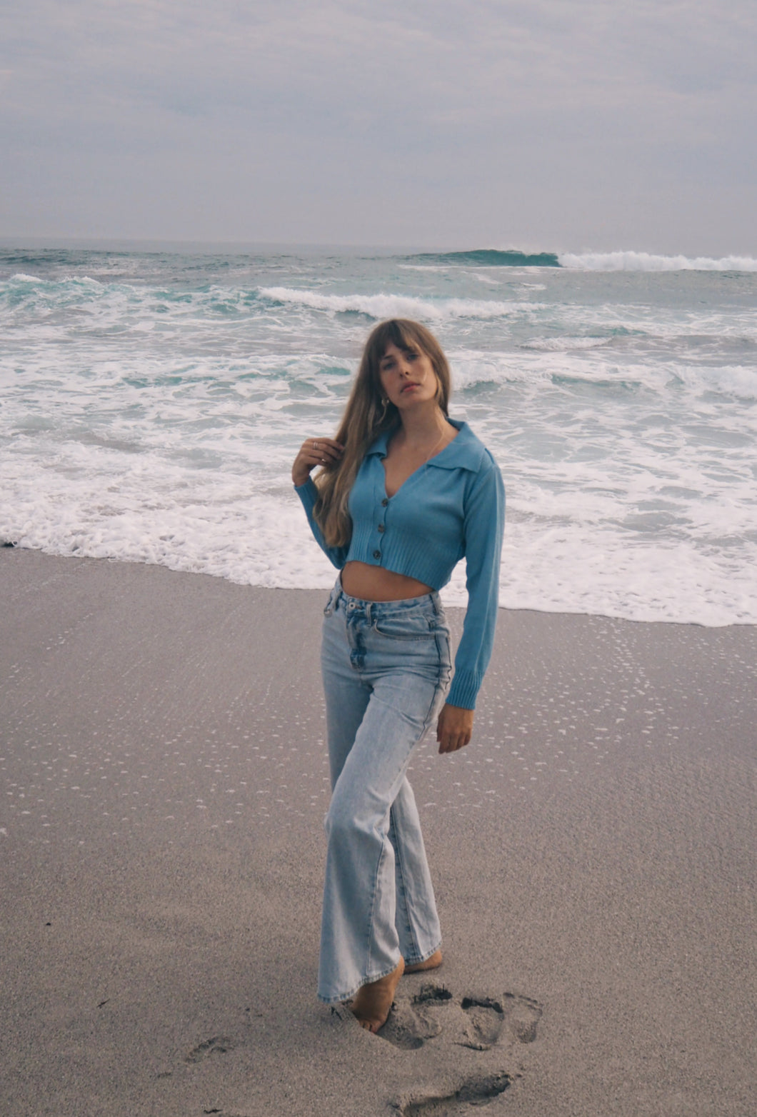 Oooohh we love this! A rich bamboo wool in a clear sky blue fashioned into this little number! A cardigan with a twist, a statement collar is paired with three large buttons, the arms are long with cuffed sleeves. This style is cropped (you can layer, or pair with a high waisted piece, or show them abs off!), the bottom hem is slightly gathered giving it a subtle fitted feel. The knit is fine, perfect for this style!